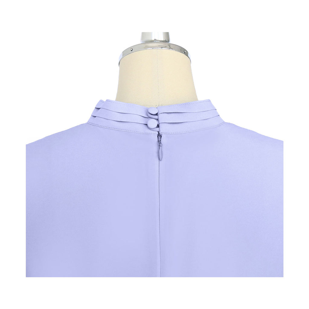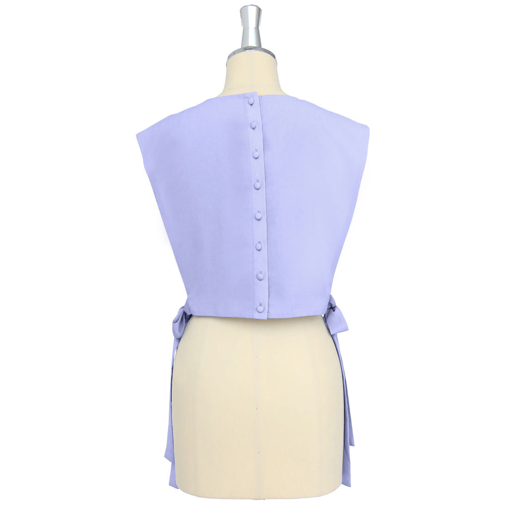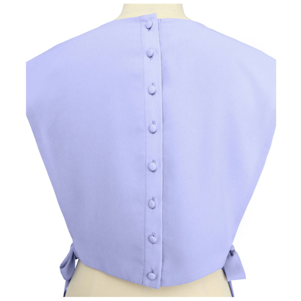 Buttons and a zipper are used at the back neckline, designed not to interfere with the overall look.