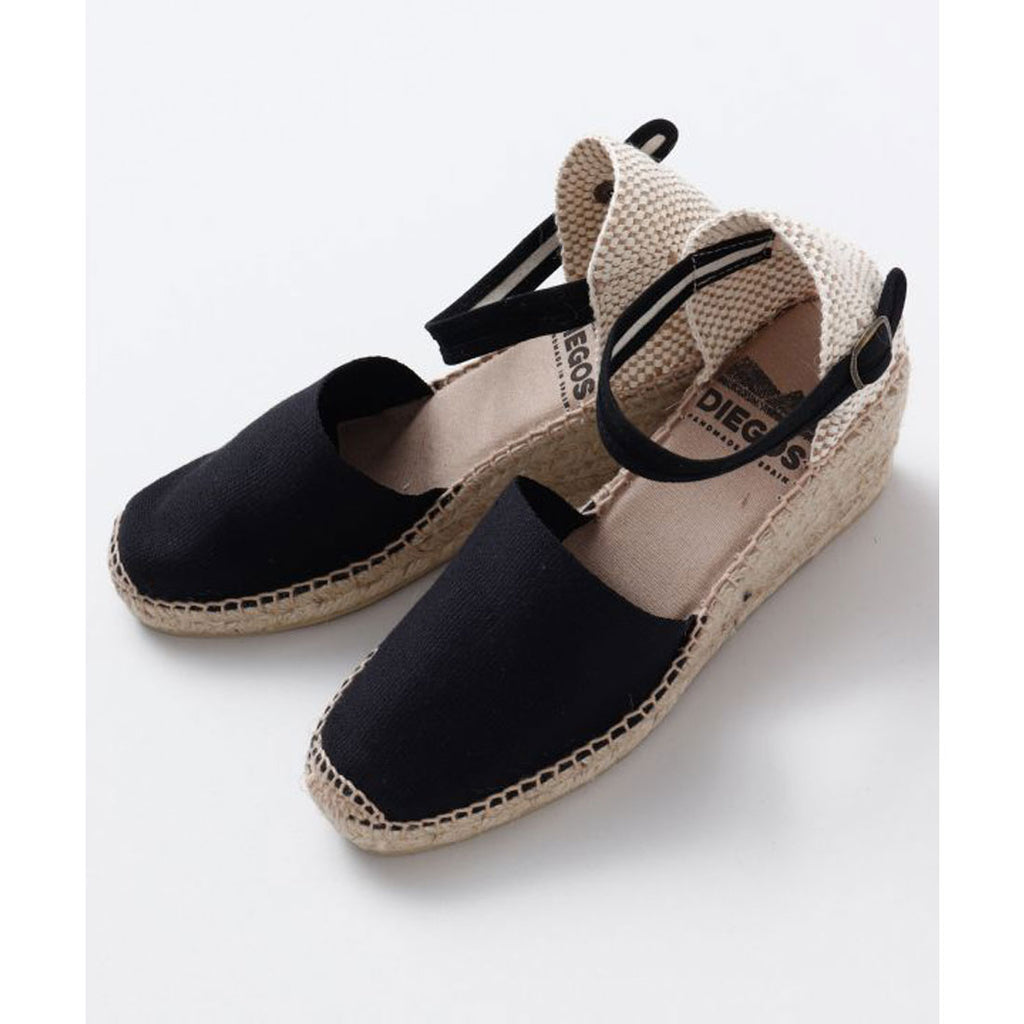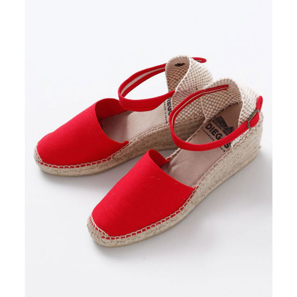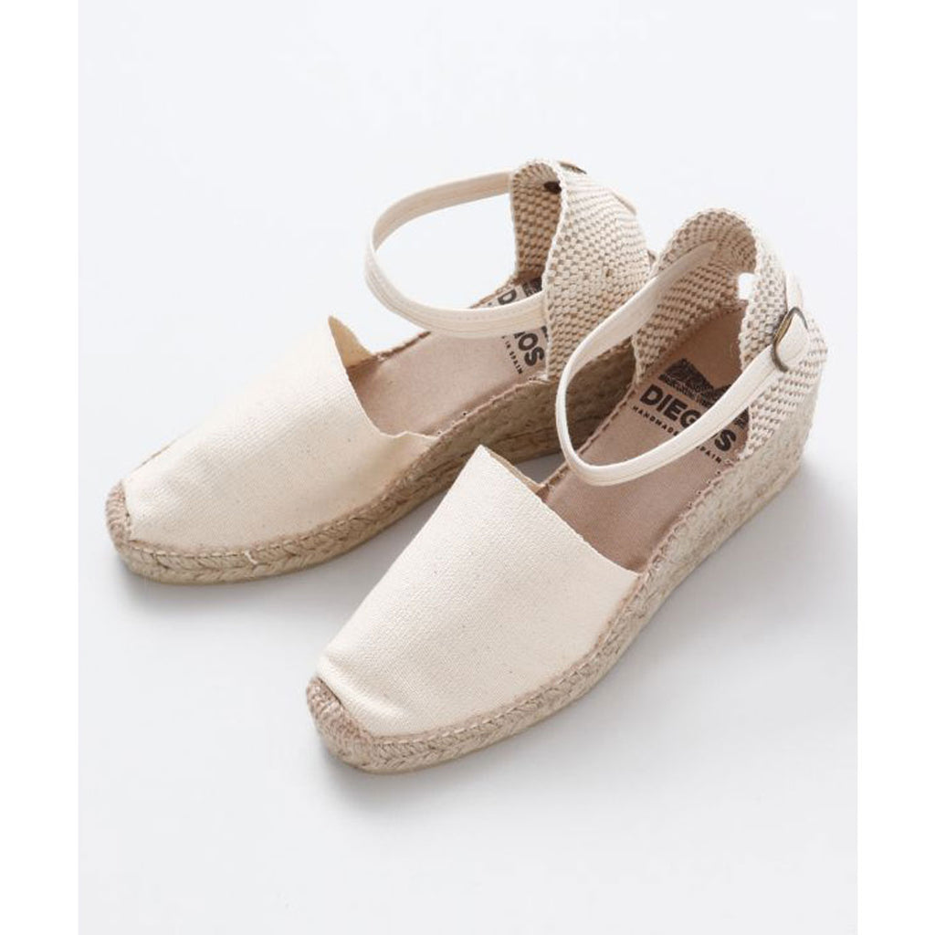 Espadrilles from Spain, crafted by DIEGO. Valuing the tradition of espadrille making that has continued for over 100 years, each pair is handmade by a rare manufacturer. Directly imported from Spain. The wedge sole creates a beautiful feet appearance. The ankle strap is a key feature.
