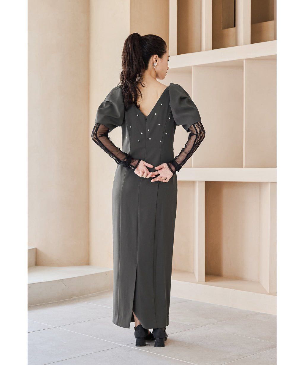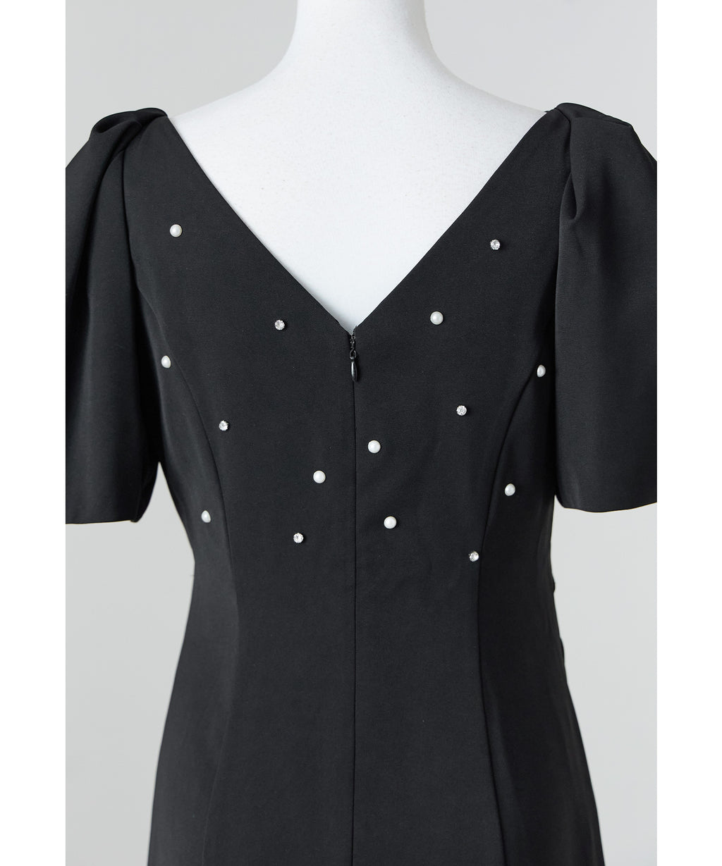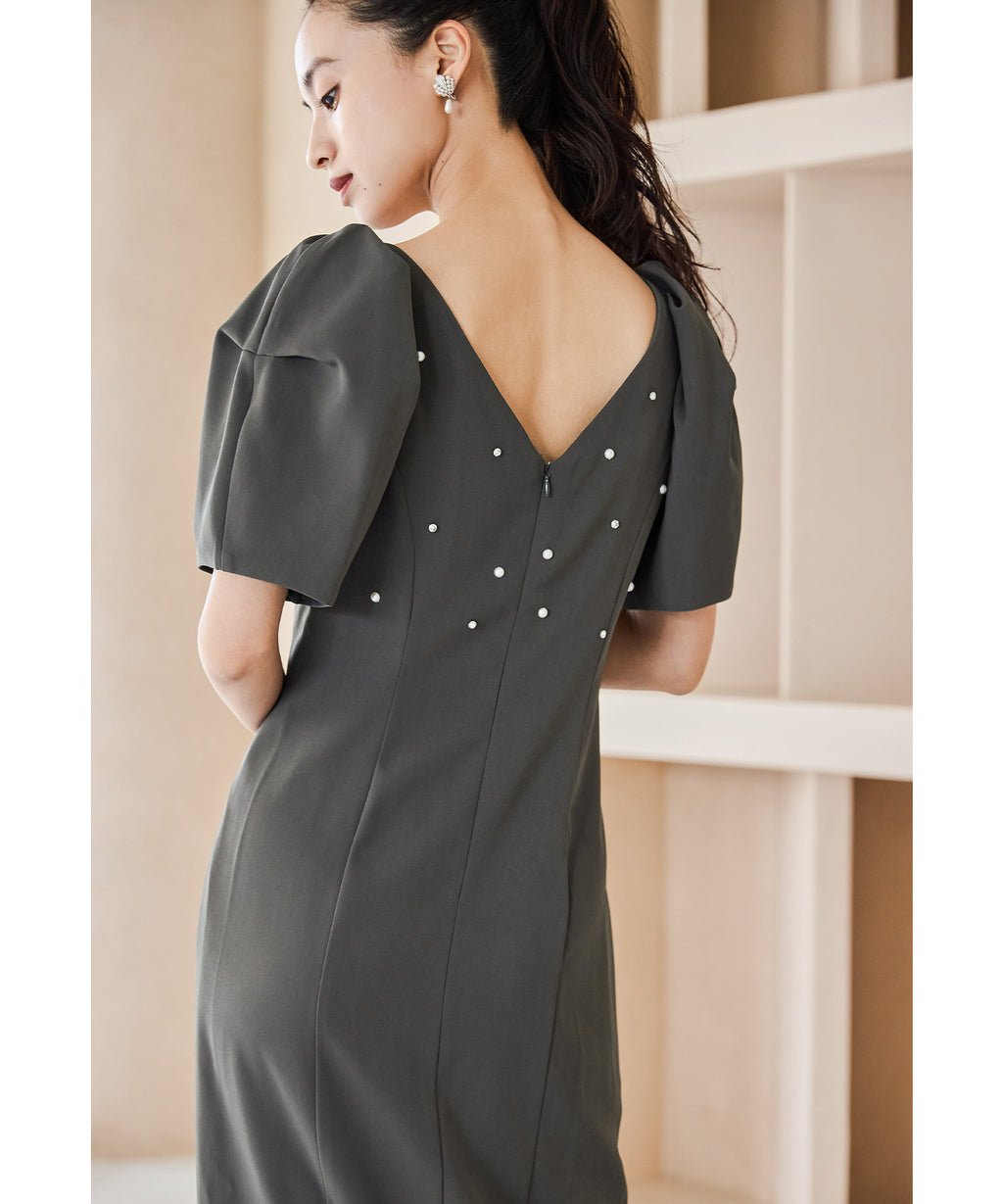 The bold V-cut back style is decorated with bijoux and pearls, ensuring a flawless look from behind.