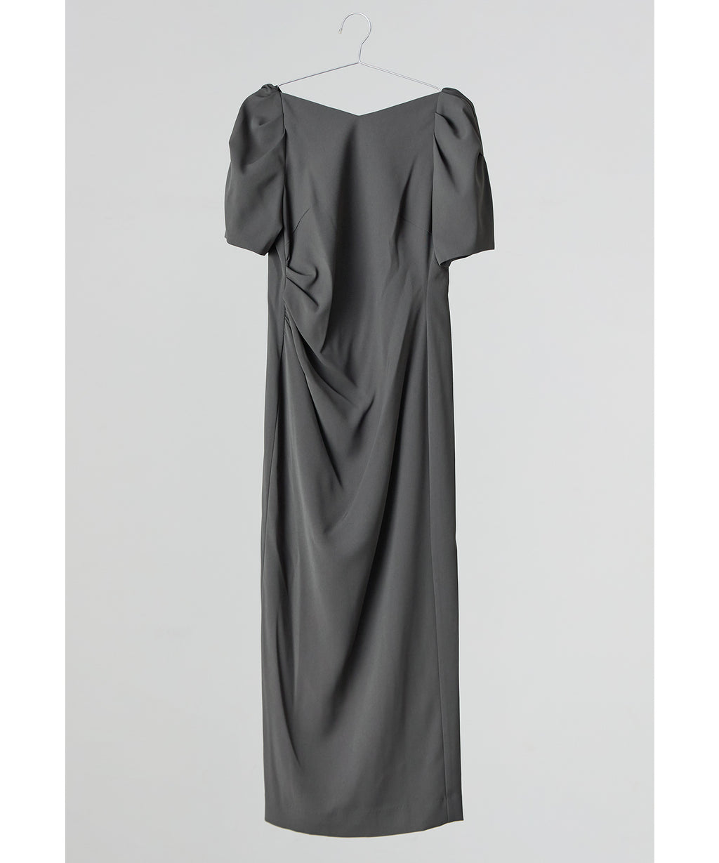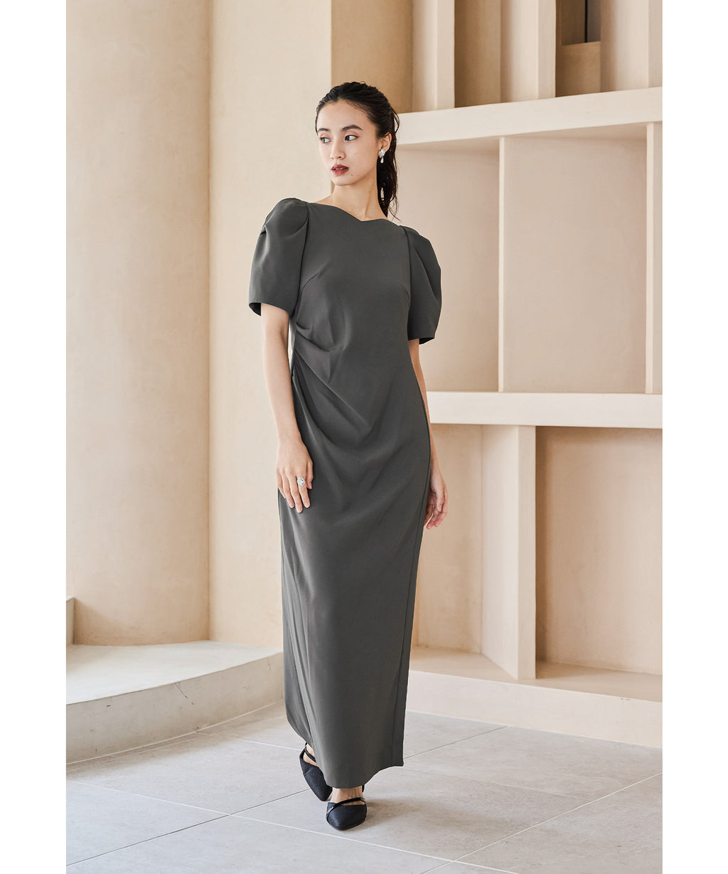 The voluminous sleeves with tucks and the asymmetrical drape at the waist add to the design.
