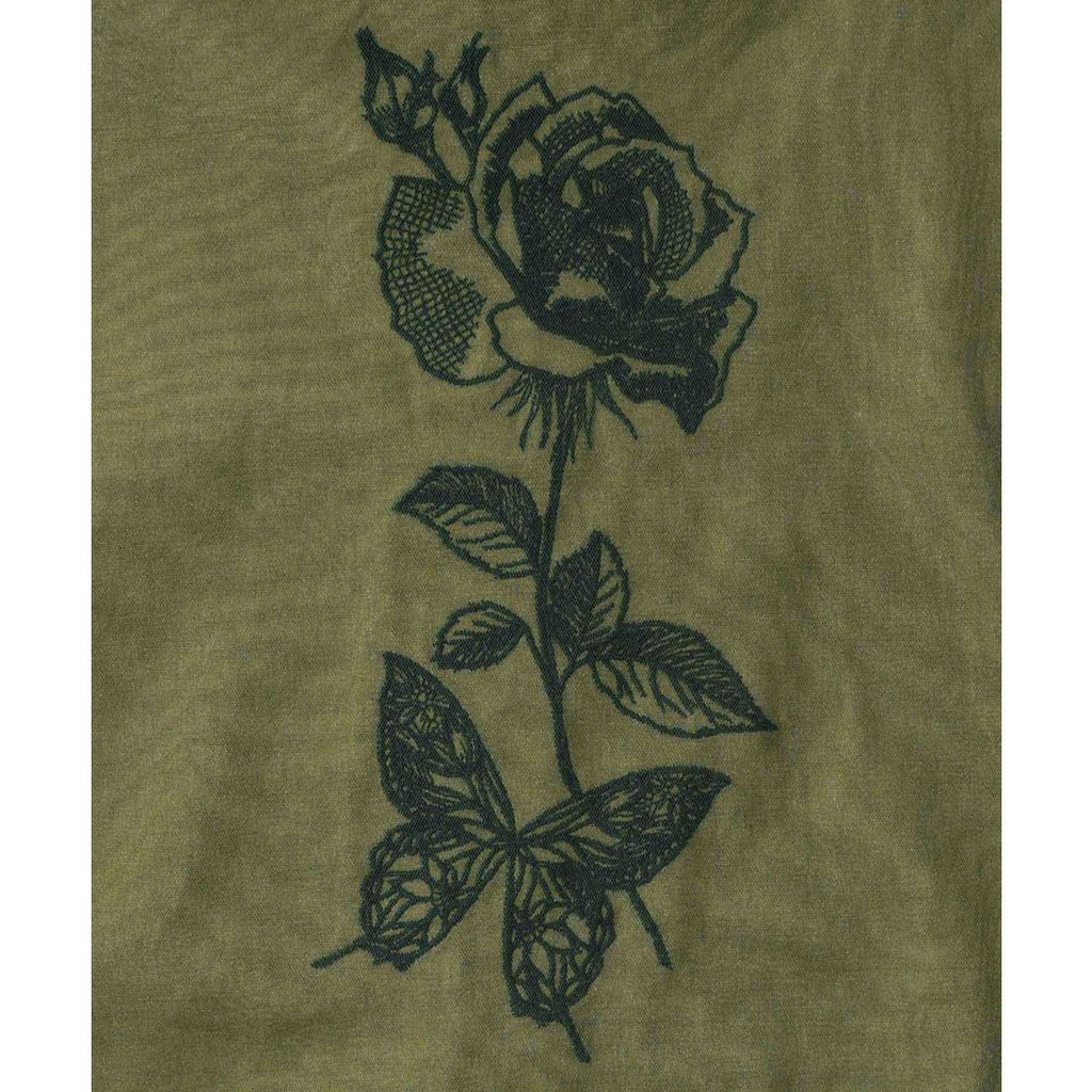 The front neckline features a butterfly in the shape of a musical note, and the back features embroidery of a single rose and a butterfly,