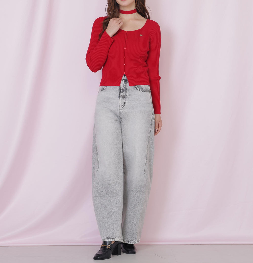 Last year's popular design has been updated for this year! A ribbed knit with a choker featuring a heart-shaped logo plate. This year, the neckline has been subtly changed to a square neck, and a bicolor black has been added. The knit choker serves as an accent. It pairs well with both feminine and casual styles, making it a versatile ribbed knit that goes well with any bottoms. *Due to lighting conditions during photography, the color may appear different. Additionally, depending on the environment of your computer or smartphone, the color of the product may slightly differ from the image. Please be aware of this in advance.*