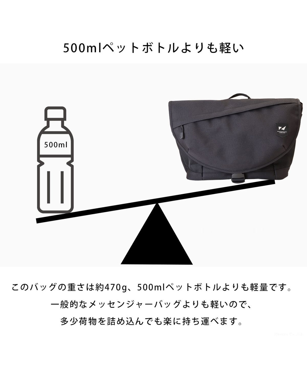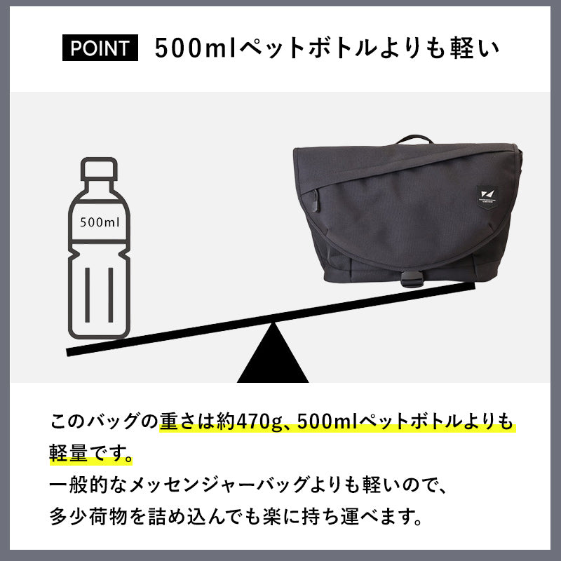 このバッグの重さは約470g、500mlペットボトルよりも軽量です。