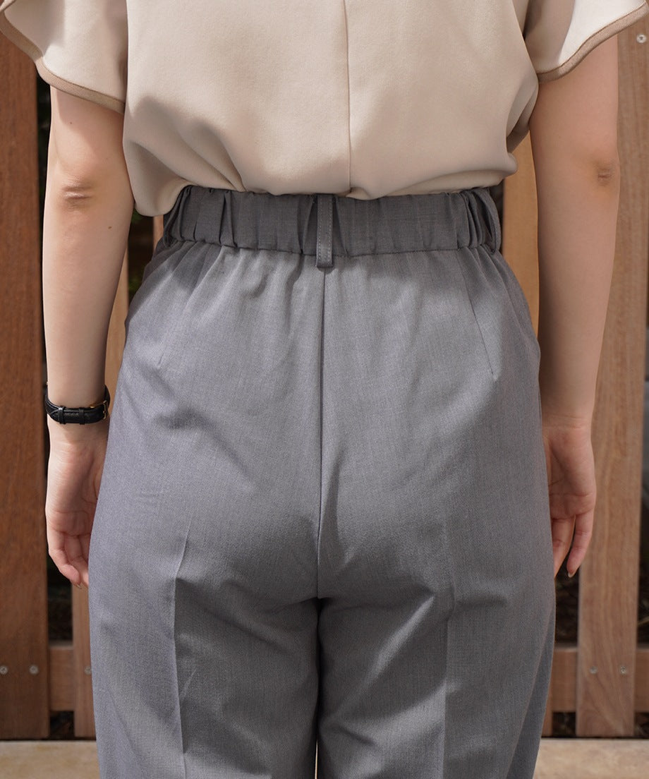 後ろウエストはゴム仕上げで快適な着心地を保ちつつ、前面はスッキリとしたデザインで上品さをキープ。