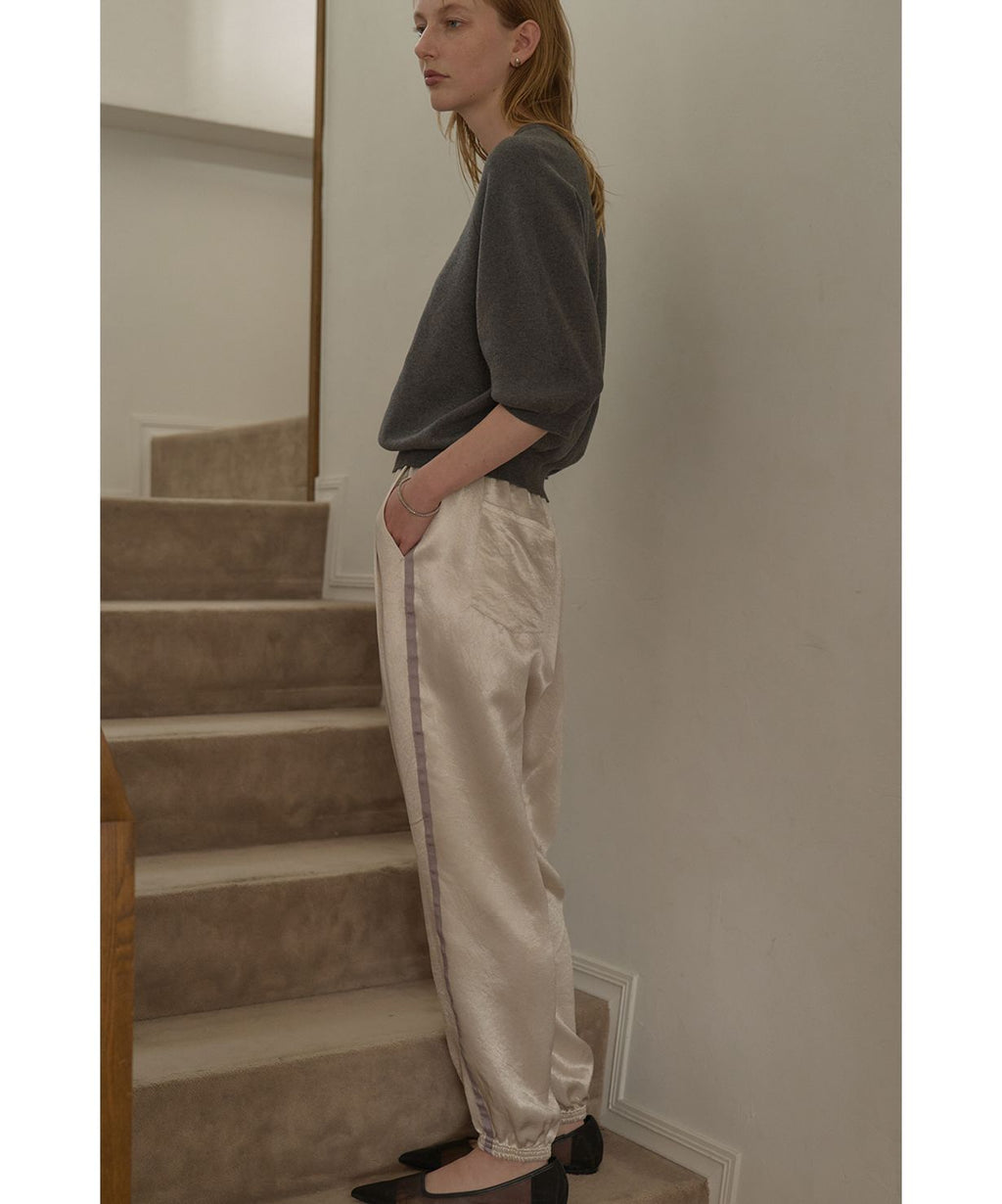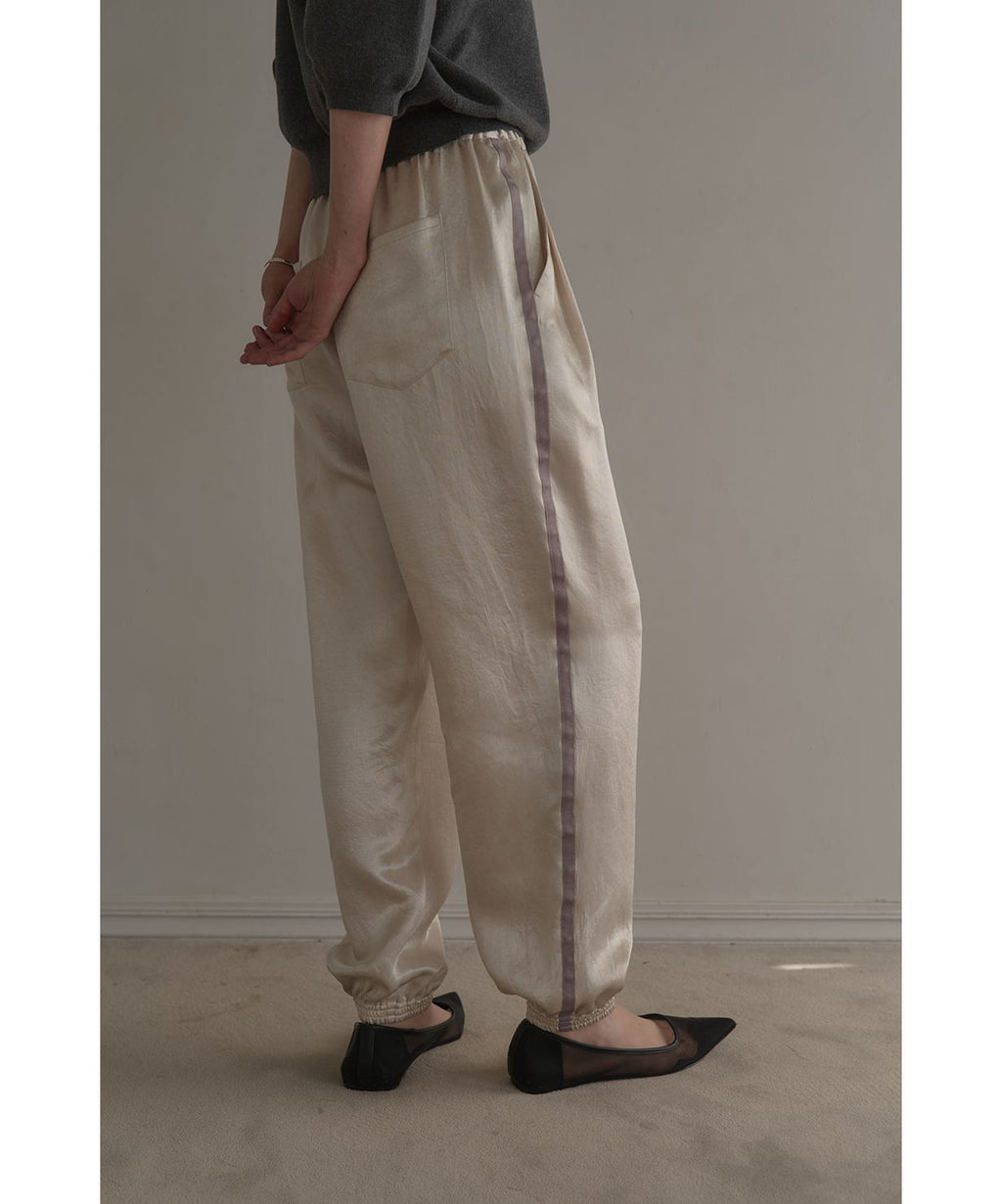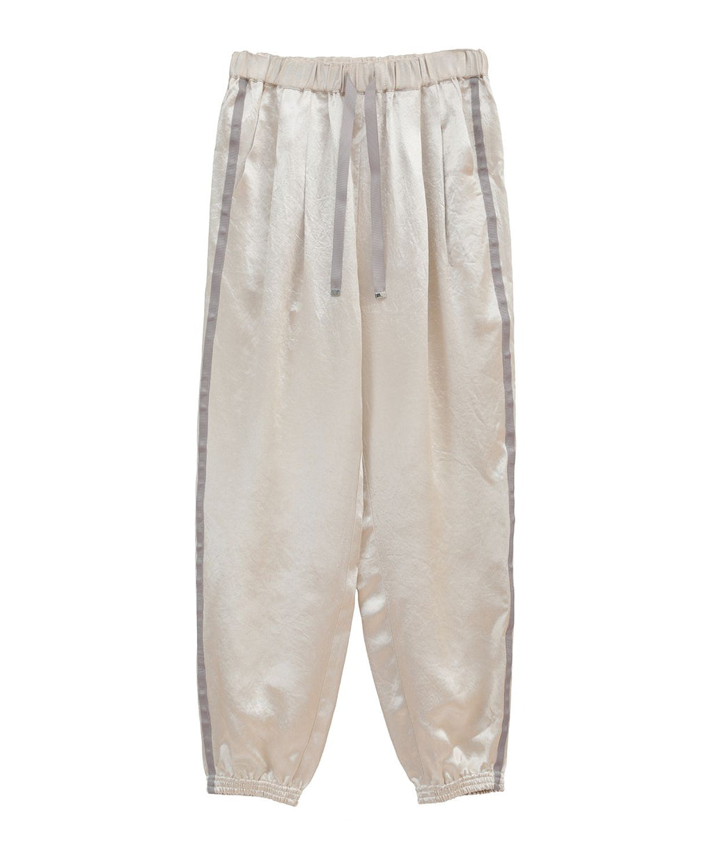 しっとりとした光沢をたたえるサテン素材で、ドレッシーなムードを取り入れたジョガーパンツ。サイドの配色ラインがスポーティーなアクセントになって、大人ならではの都会的なアスレジャーな着こなしが楽しめそう。