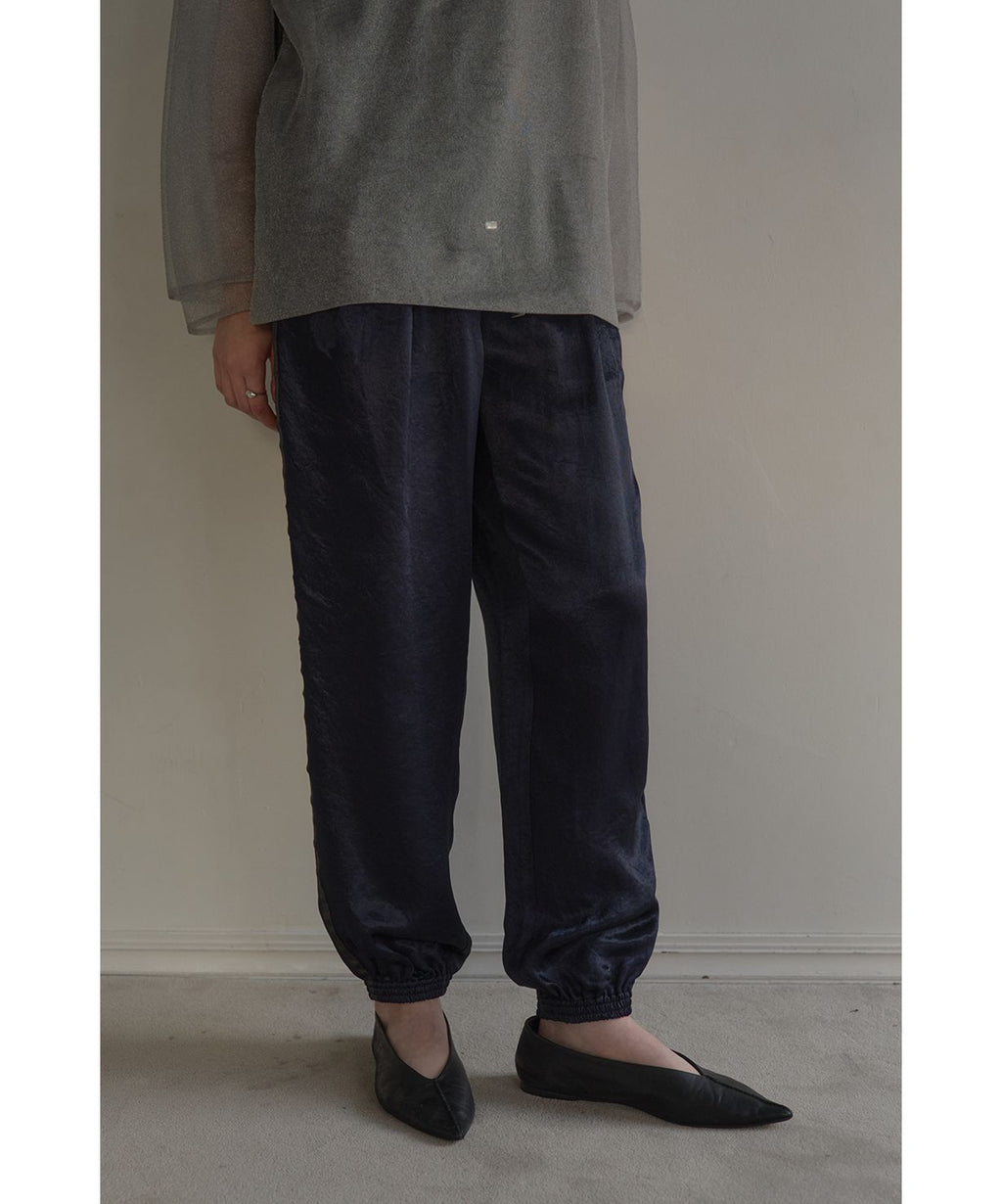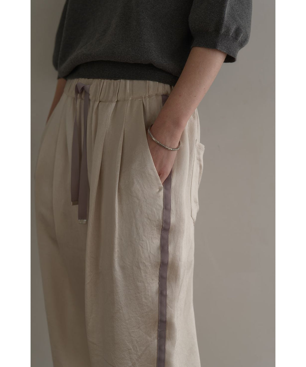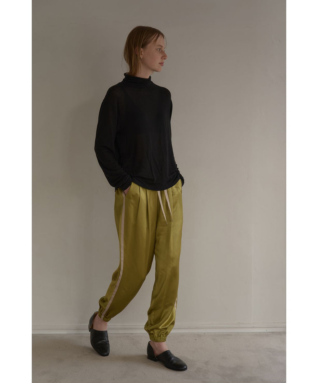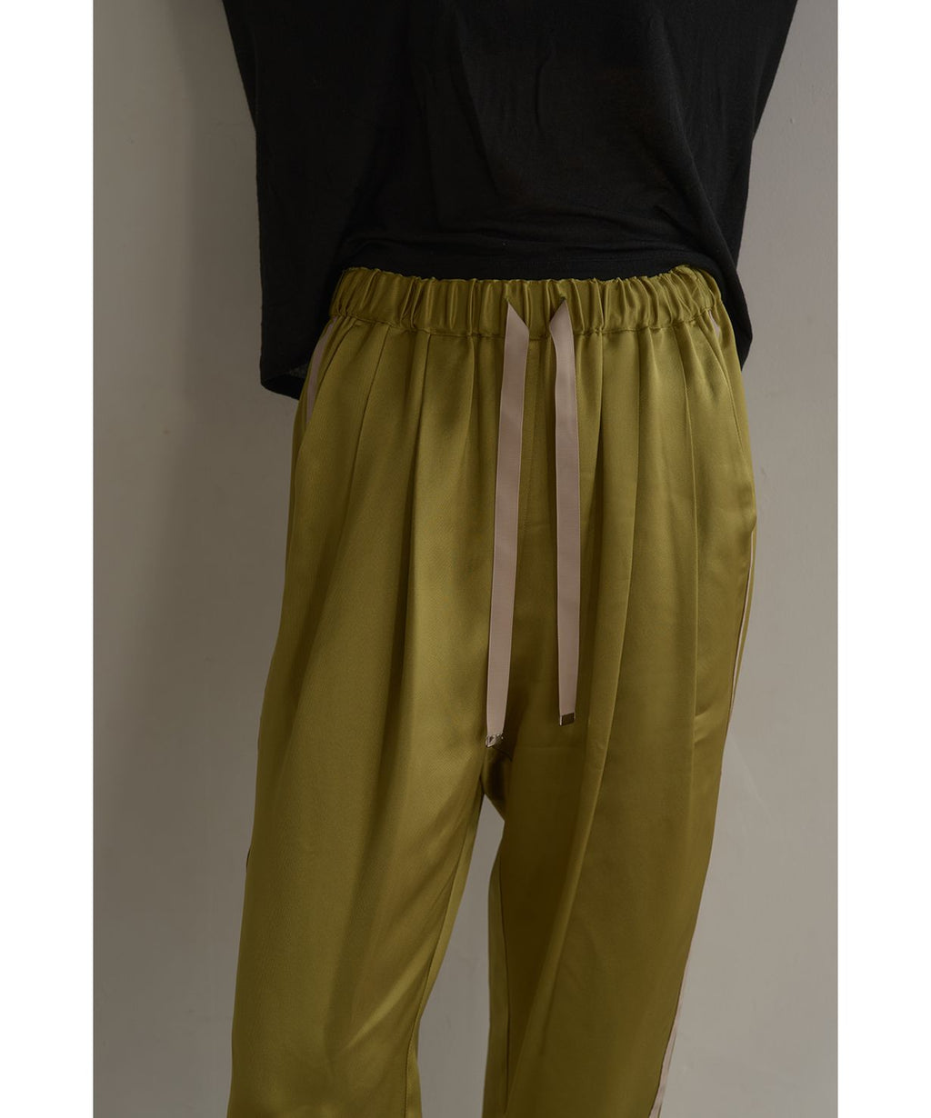 しっとりとした光沢をたたえるサテン素材で、ドレッシーなムードを取り入れたジョガーパンツ。サイドの配色ラインがスポーティーなアクセントになって、大人ならではの都会的なアスレジャーな着こなしが楽しめそう。
