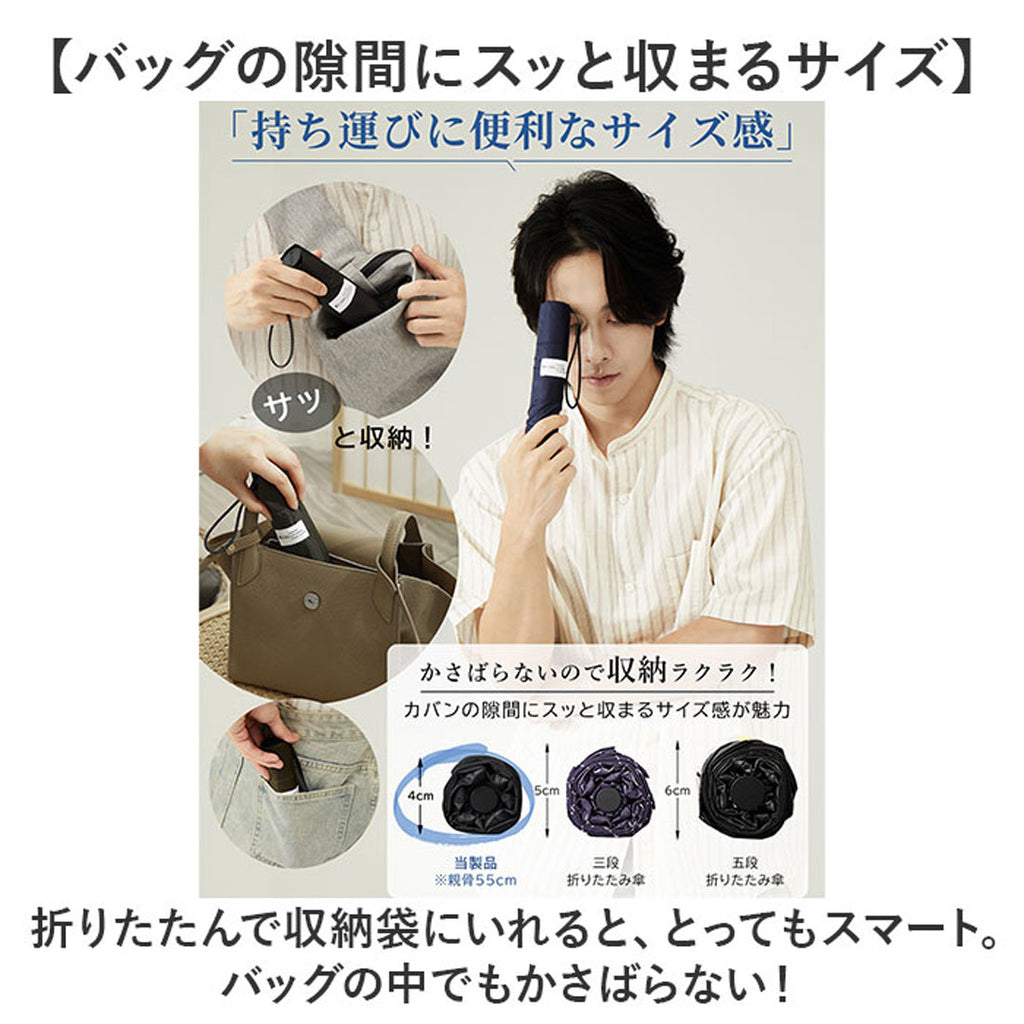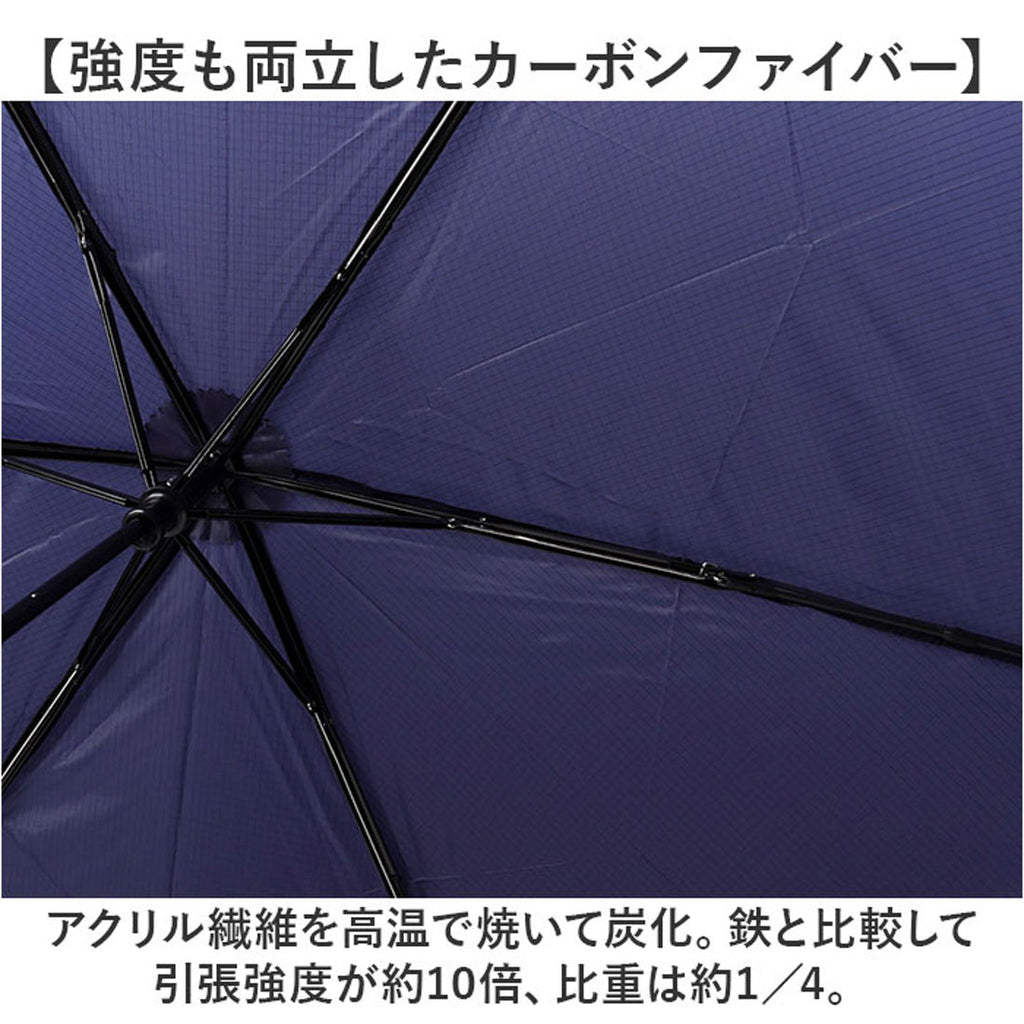 【いつでもバッグに忍ばせてお出かけ】・スマホより軽くストレスフリー!「U Light 超軽量カーボン折りたたみ雨傘 55cm」【365日持ち歩ける超軽量設計】・カーボンファイバー骨で、バッグに入れていることを忘れるほどの軽さを実現。急な雨にも対応◎【強度も両立したカーボンファイバー】・アクリル繊維を高温で焼いて炭化。鉄と比較して引張強度が約10倍、比重は約1/4。【耐久性がアップする6本骨】・5本骨より丈夫な6本骨タイプ。適度な大きさでしっかりと雨から守る、親骨55cm。【15デニールの超軽量高密度生地】・水滴を吸収せずに弾き、抜群の撥水力を維持。軽く振るだけで水気が飛ぶのでバッグインも安心。(※1)全カラー撥水度4~5級。ポリエステル生地を、細く強い糸で織り上げています。【ワンアクションでラクラク開閉】・傘骨をポキポキ折る手間不要◎いつでもどこでもイージーオープンできる手開き仕様。【安心・安全のセーフガード付き】・爪や指を挟むのを防止するカバーを装備。開閉時のケガを防ぎ、ネイルを施した爪も保護。【サッとまとまる面ファスナーバンド】・傘生地をまとめるバンドは、面ファスナー式。たたむ時も手間取らず、すっきりひとまとめ。【バッグの隙間にスッと収まるサイズ】・折りたたんで収納袋にいれると、とってもスマート。バッグの中でもかさばらない!【ディテールにもさりげないこだわり】・手首に掛けられる長めの持ち手。紐には、暗い場所でも見つけやすい反射材を使用。【紫外線防止効果で晴れた日も】・紫外線から守ることもできる、晴雨兼用傘。夏のお出かけの相棒にも。(※2)雨傘として使うことを主にしたアイテムです。色の濃淡により紫外線遮蔽率が異なります。数値の目安は淡色:約80%、濃色:約90%。【シンプルなユニセックスデザイン】・シックなチェック柄。性別や年代問わず持ちやすい、落ち着きのあるカラーリング。