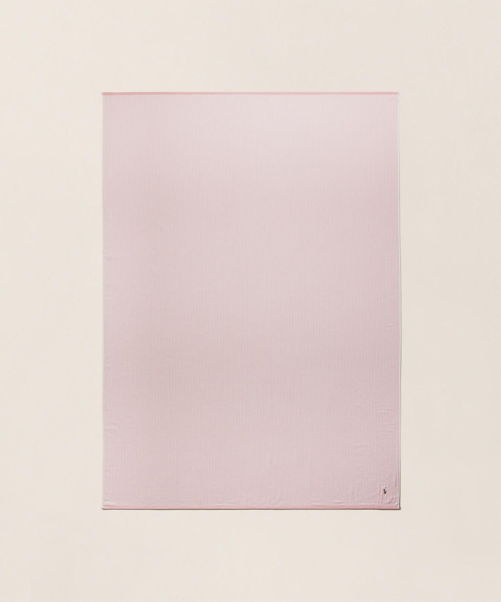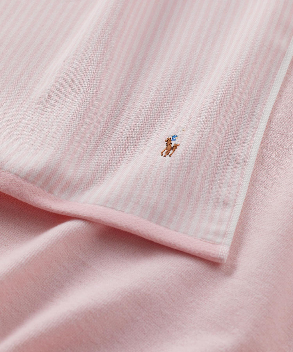 メンズウェア風のシャツストライプが際立つ、コットン製のタオルケット。シグネチャーのポニー刺繍がアクセントをプラス。
