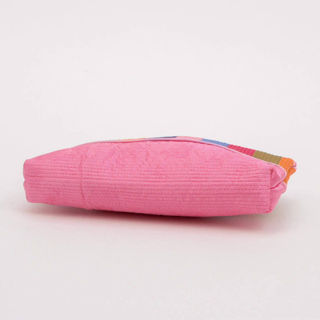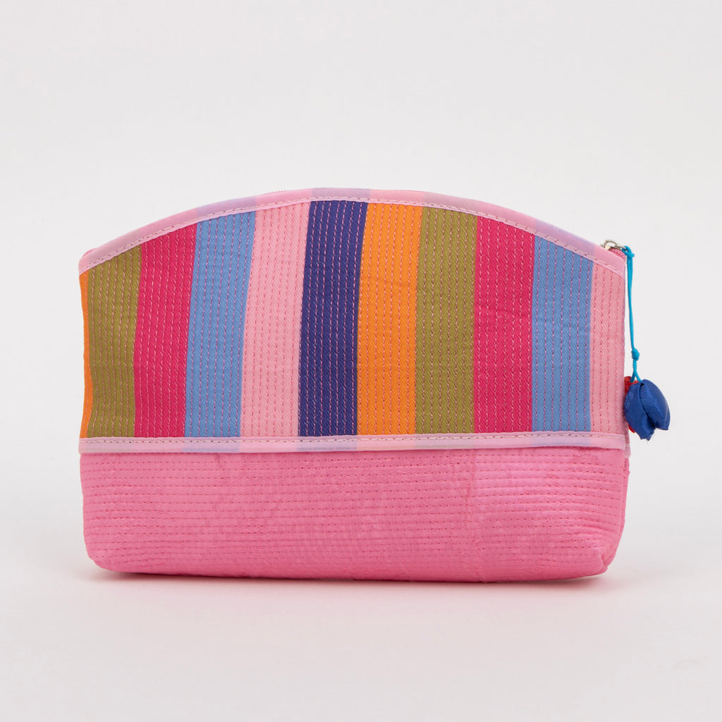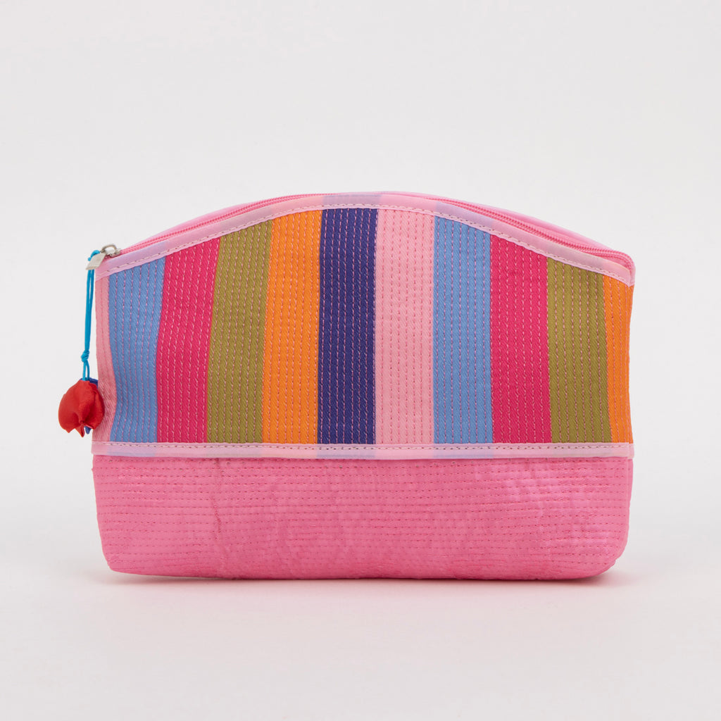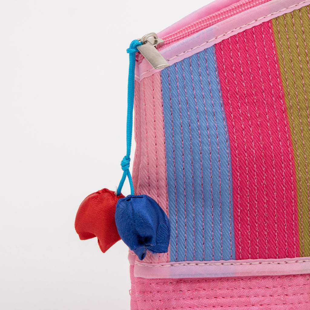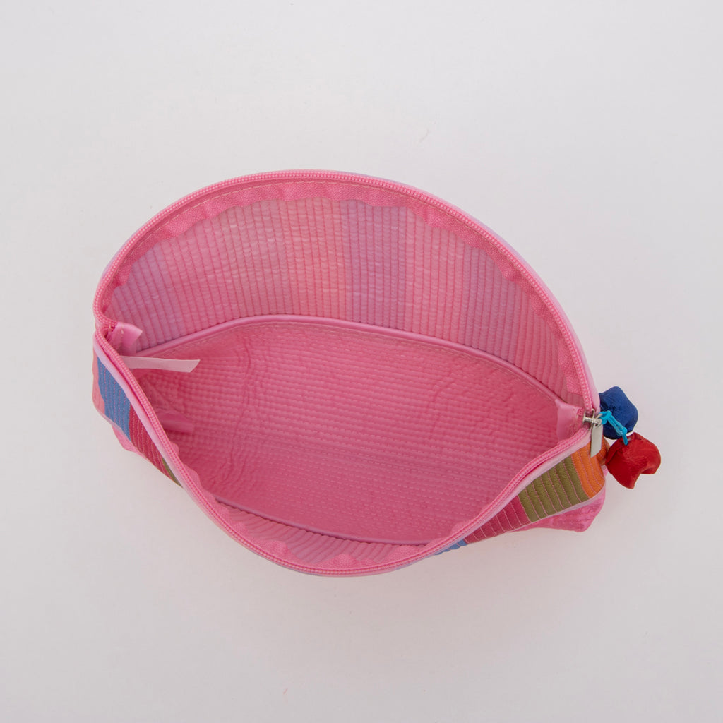 カラフルなストライプ柄が目を引くポーチです。