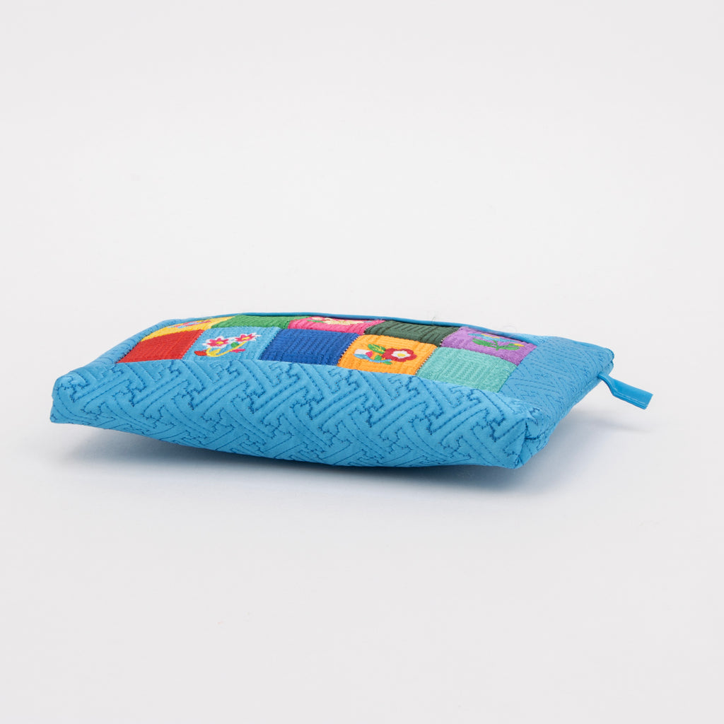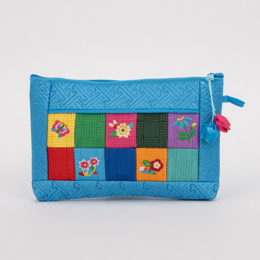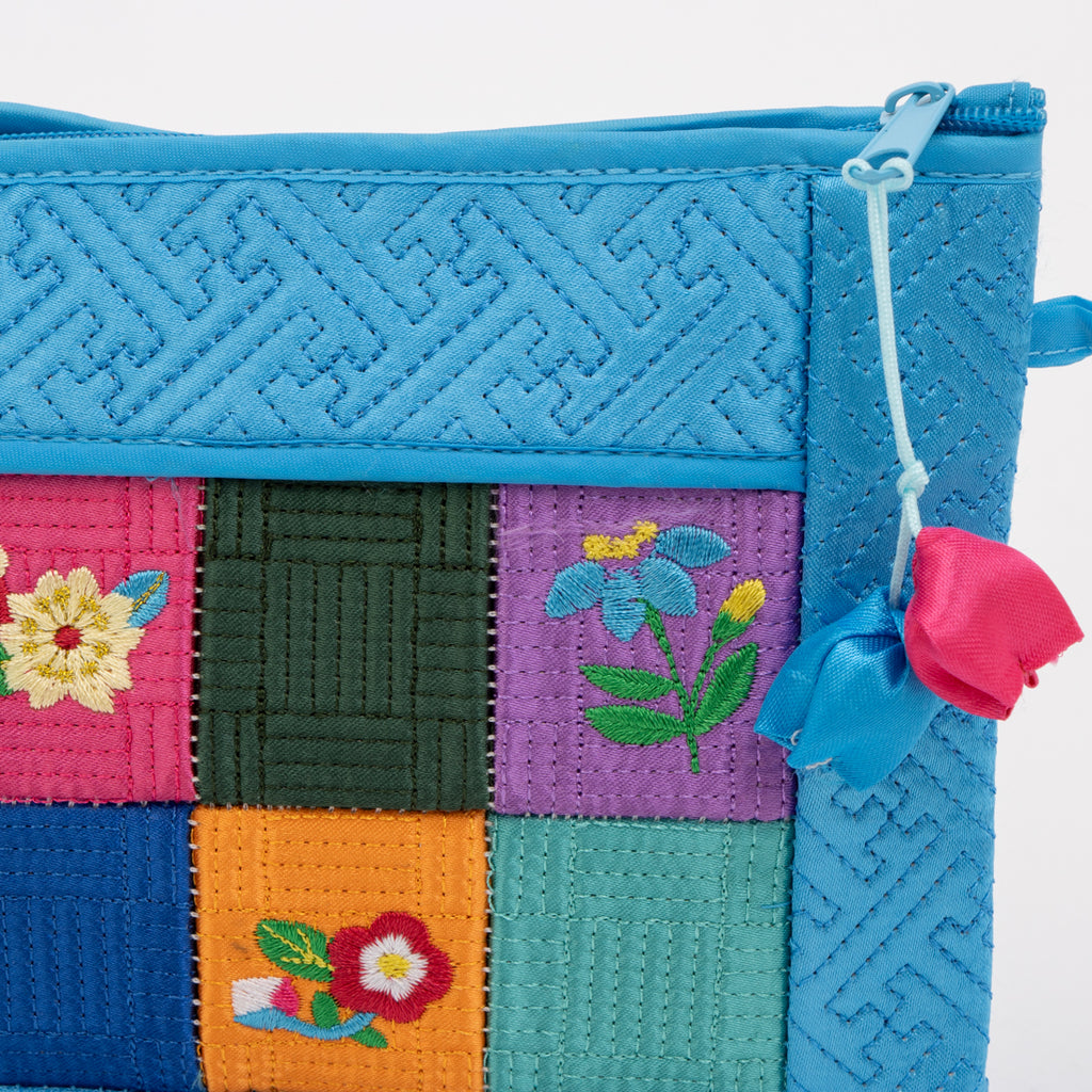 パッチワーク風のデザインには、花や蝶などの刺繍が丁寧に施されており、手作りの温かみが感じられます。