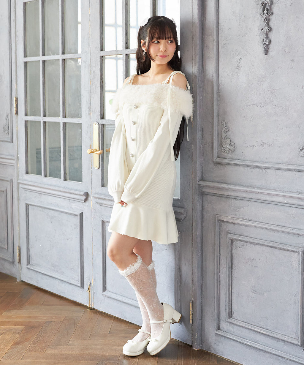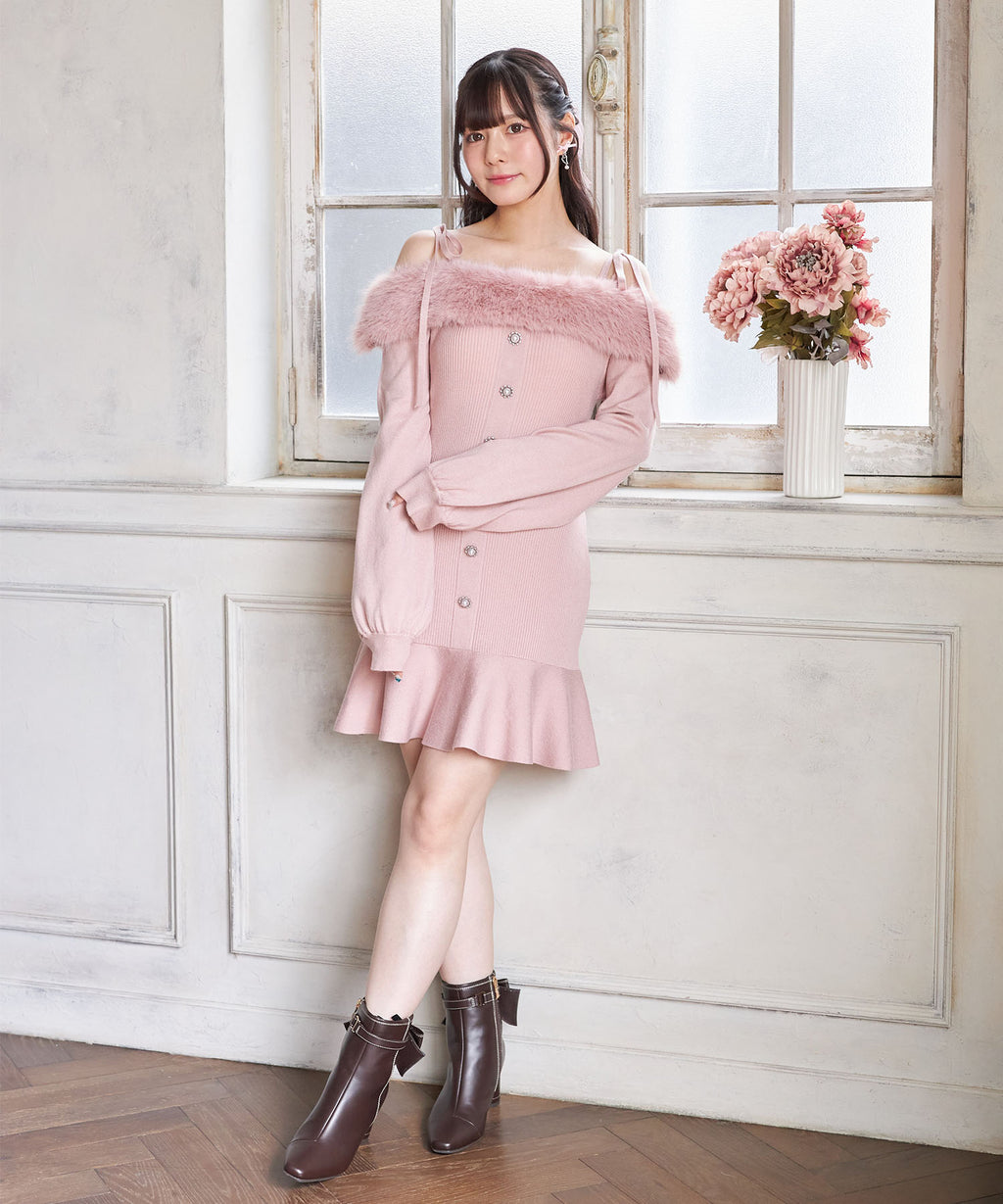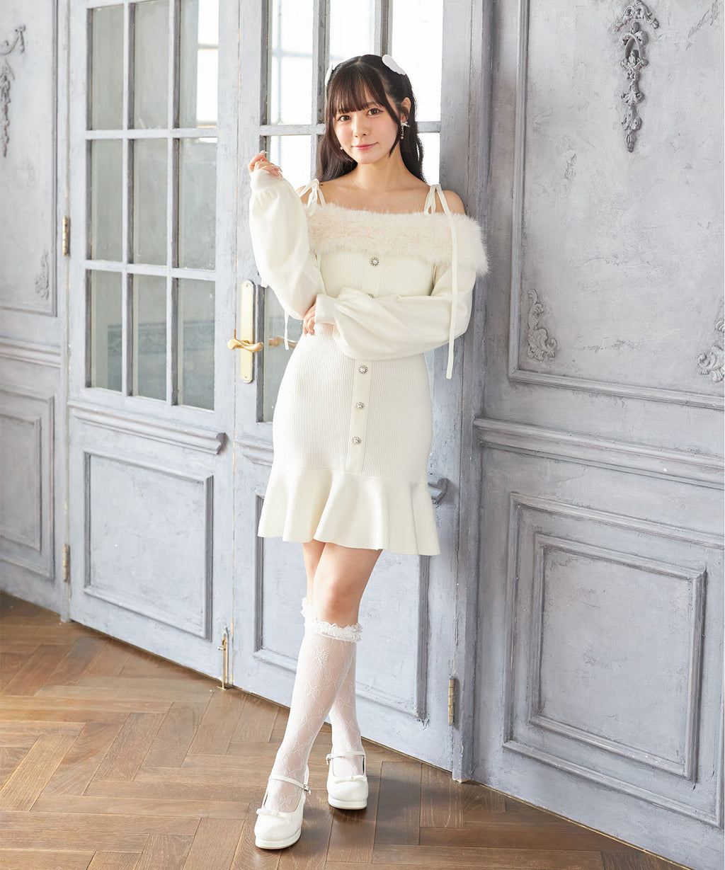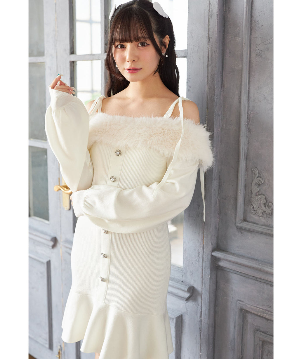 スユン Suyunn ビジュー飾り釦付きオフショルファーニットワンピース