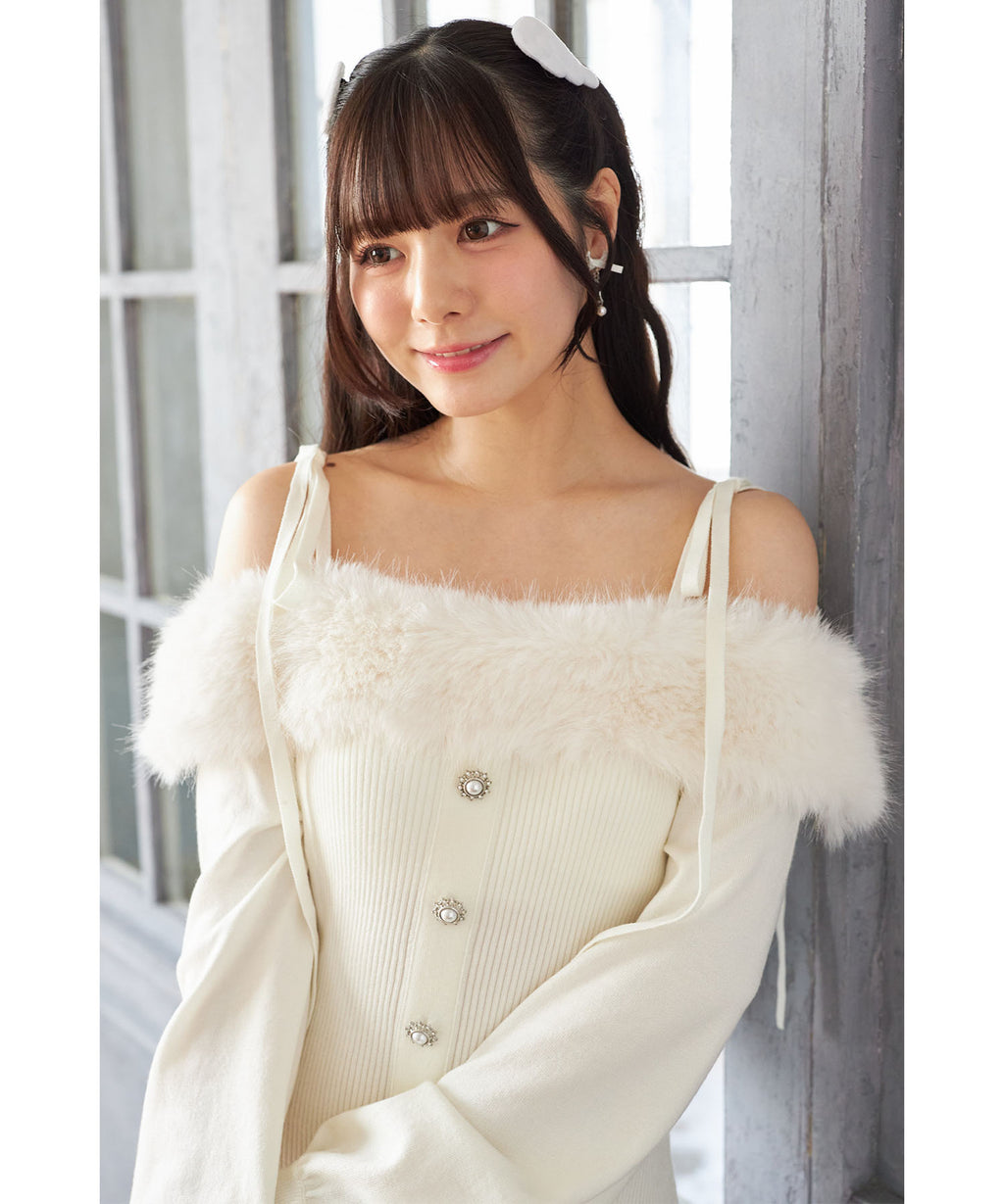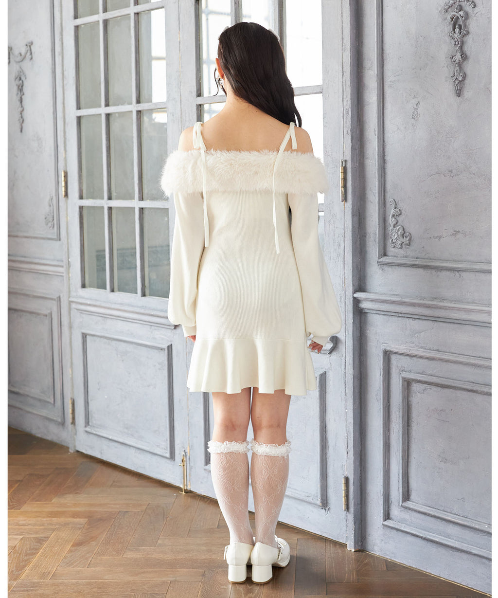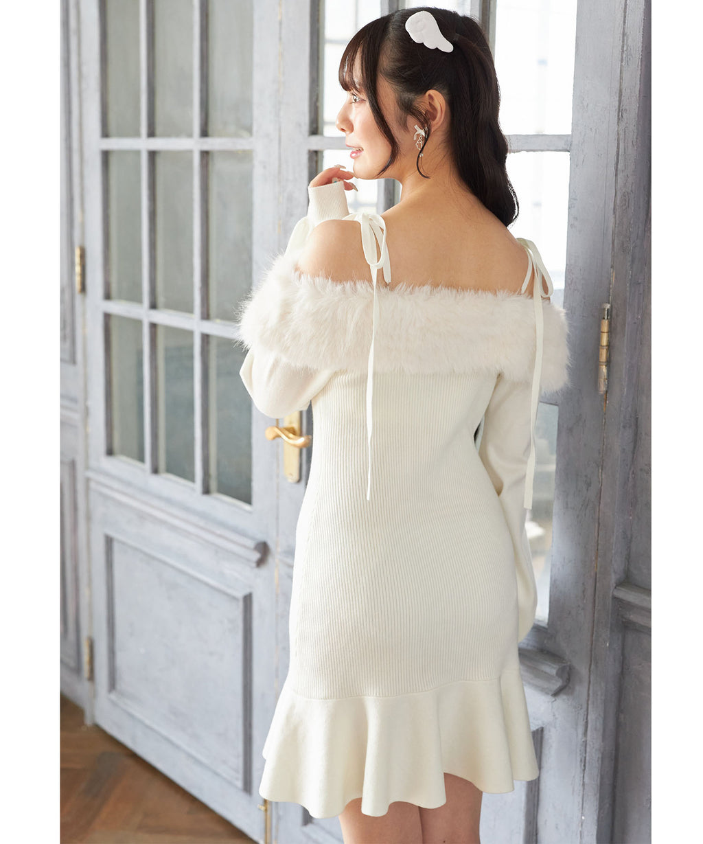 ヘルシーな肌見せができるオフショルデザインにふわふわのファーを施し、シーズンライクに。
