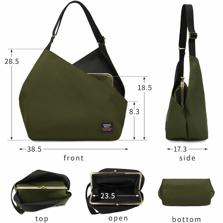 ガバッと大きく開くがま口で中が見やすく、長財布や500mlのペットボトルも楽々収納。お弁当も入るマチの大きさなので通勤・通学にもオススメ。
