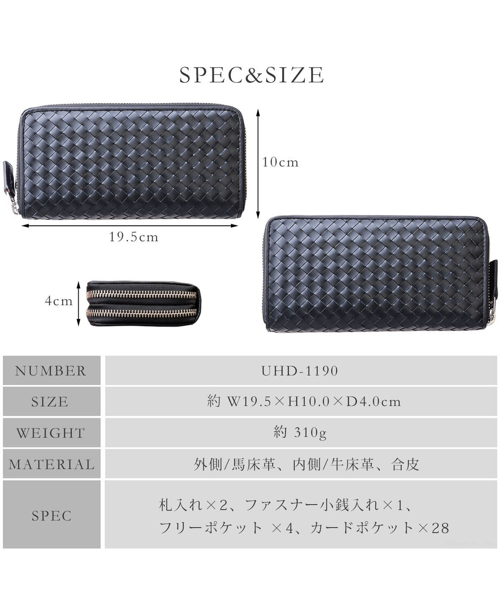 仕様:札入れ×2、ファスナー小銭入れ×1、フリーポケット ×4、カードポケット×28