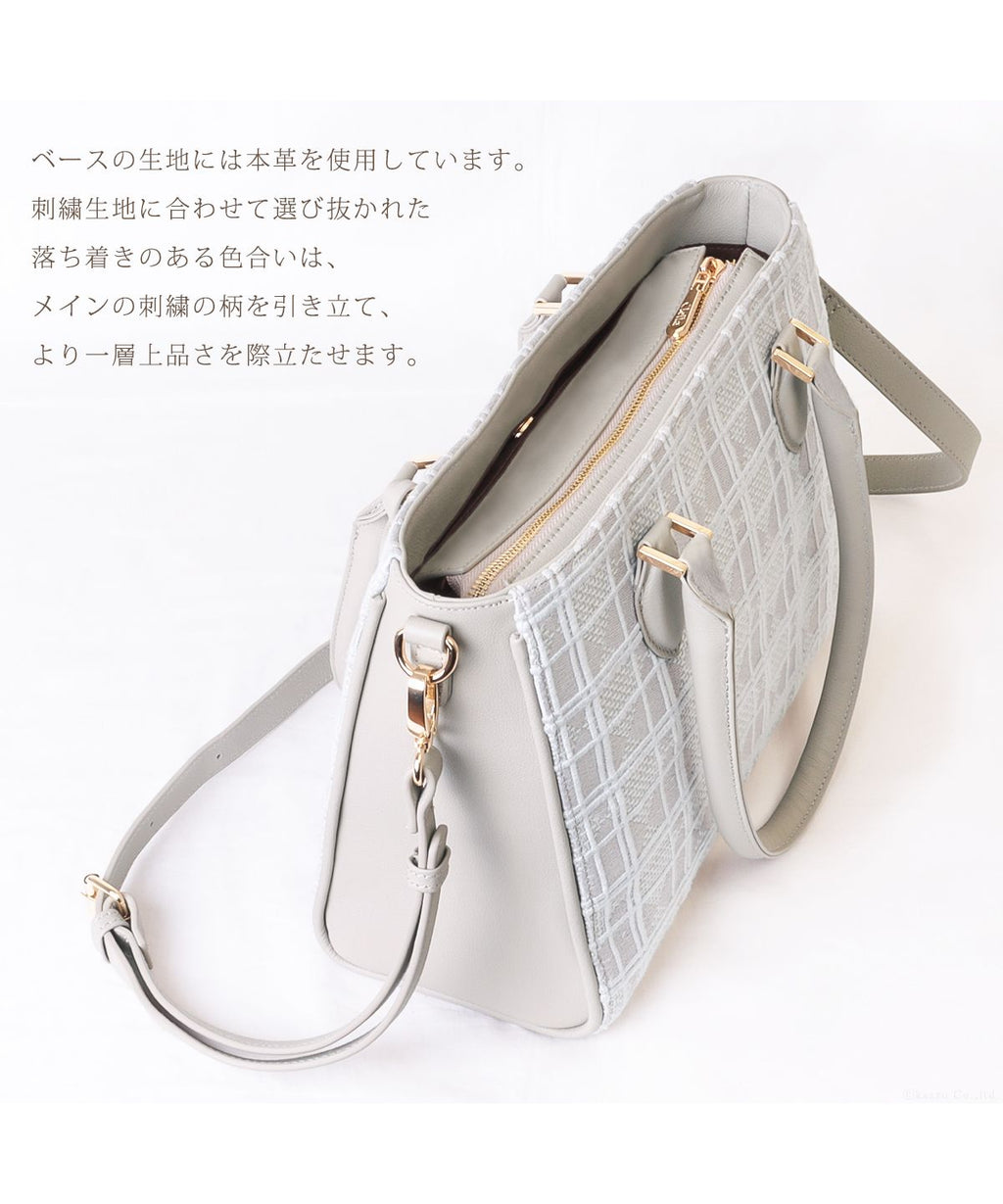繊細で上品な刺繍のデザインが目を惹くトートバッグ。
