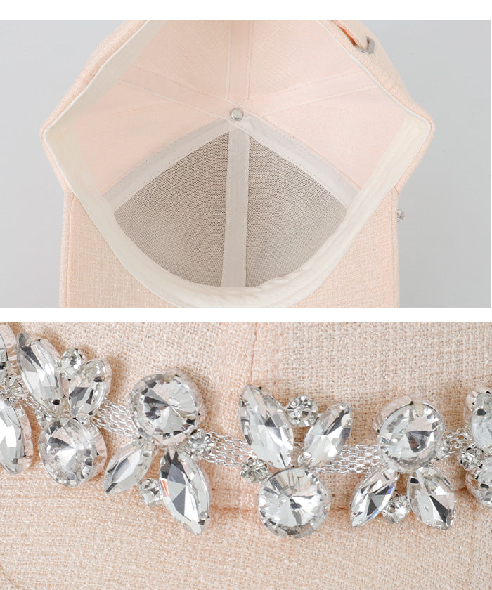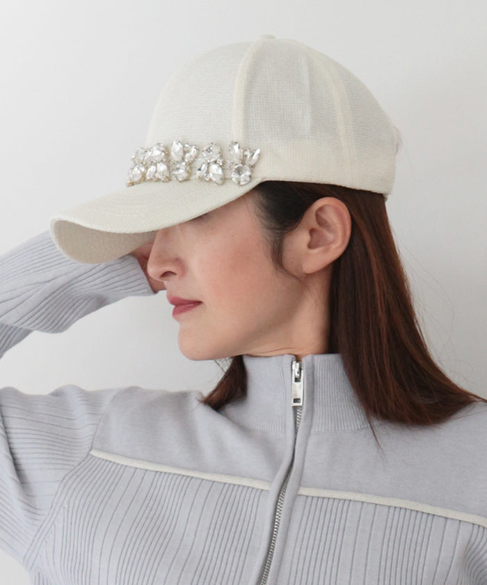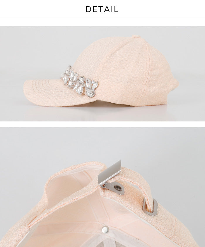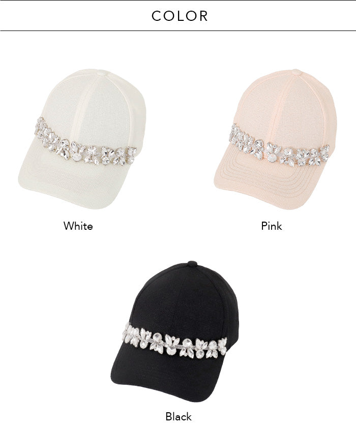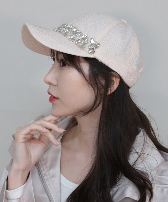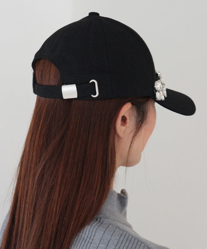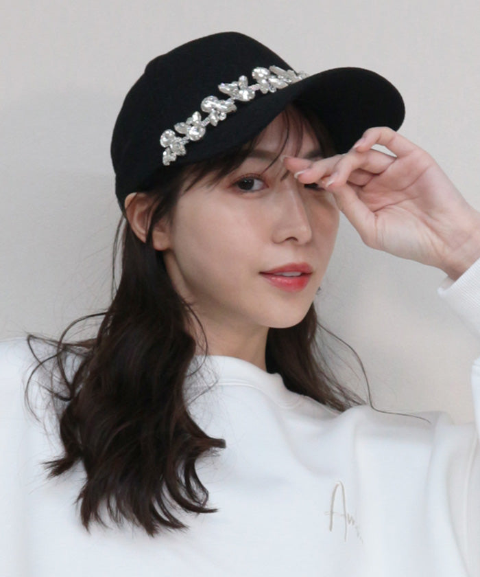 フロントのビジューパーツが特徴の6パネルキャップ。