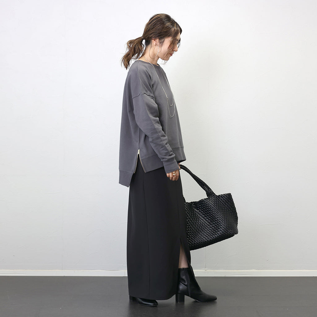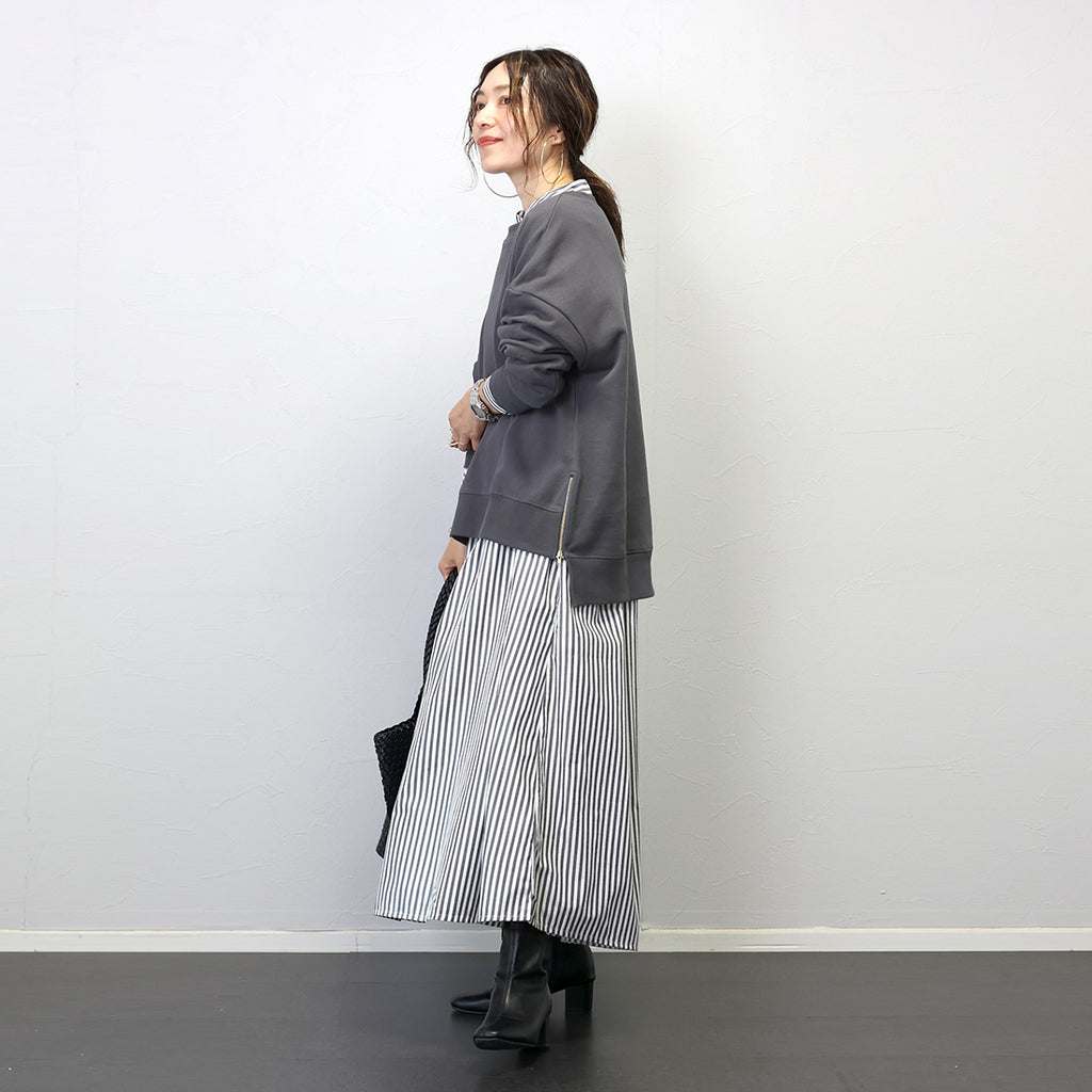 ファスナーを開けてスリット感覚で着こなせば、腰周りに余裕が生まれ軽さもアピール。