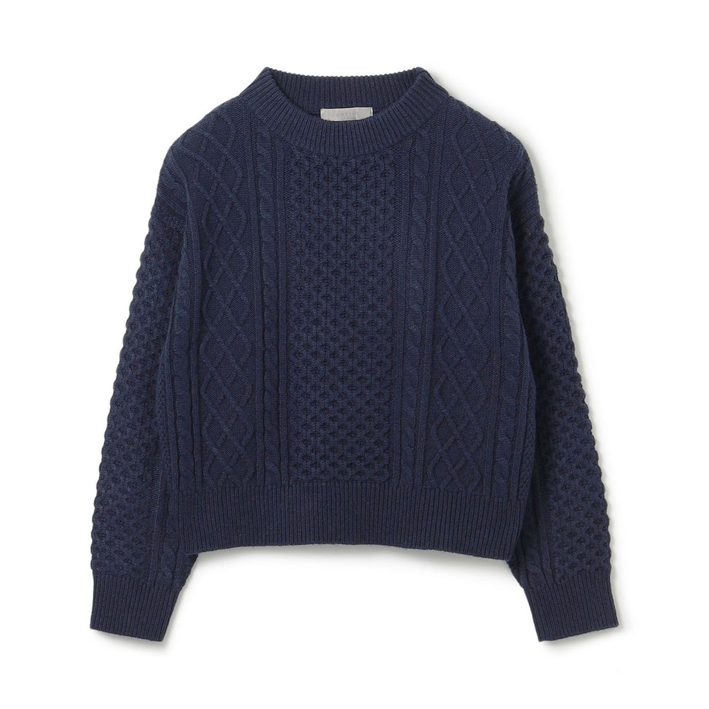 ■デザインアラン柄の編み目がクラシックな印象のプルオーバー。首回りに余裕を持たせたモックネックデザイン、クロップド丈のワイドシルエットにすることで今年らしいシルエットにしています。どんなボトムとも合わせやすく、レイヤードインナー合せもおススメ。