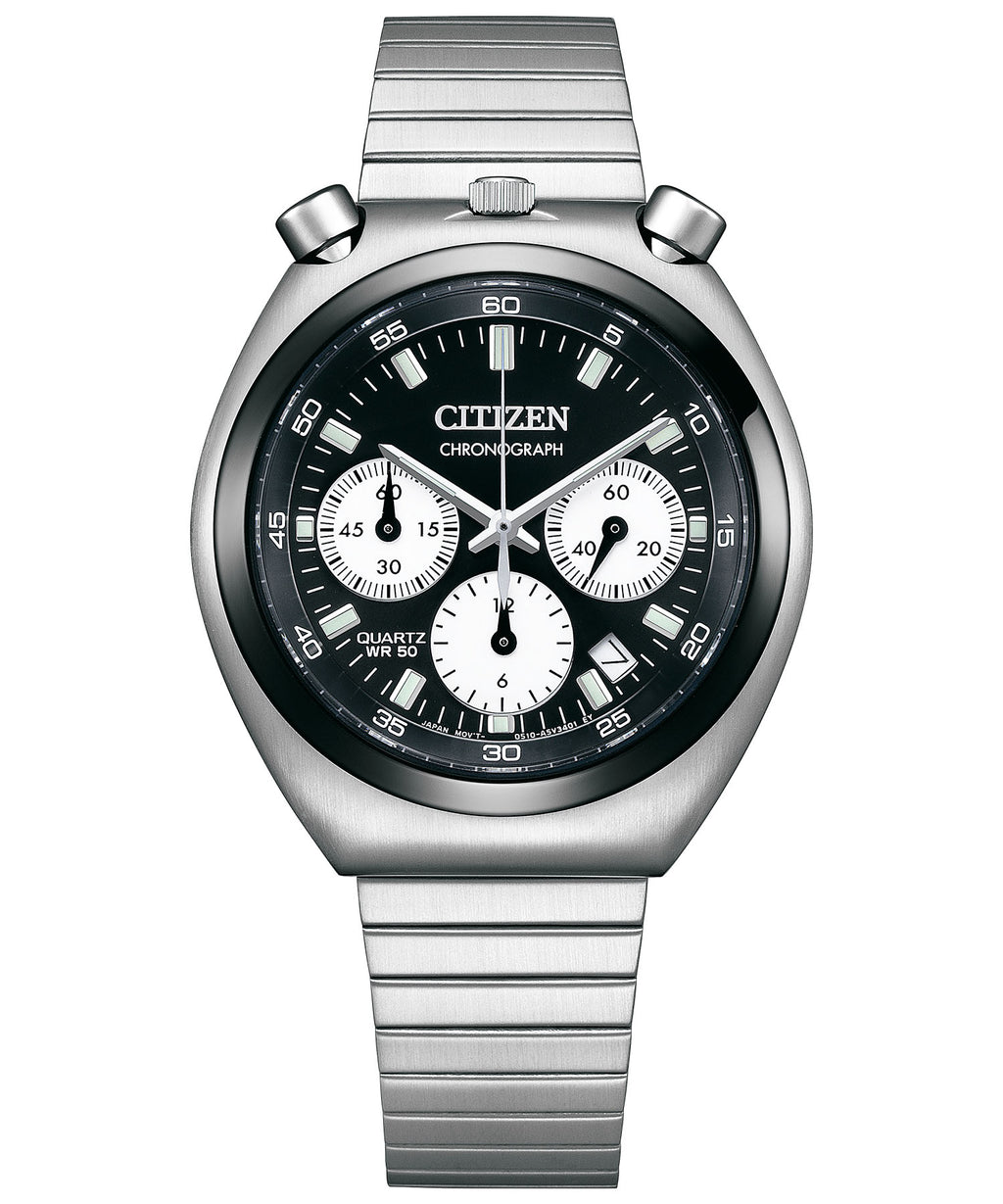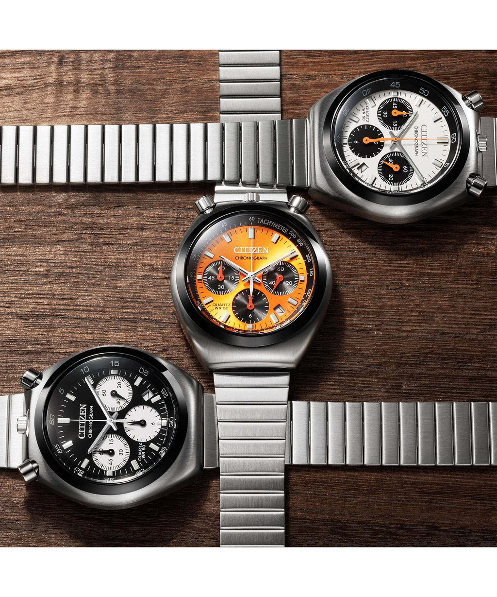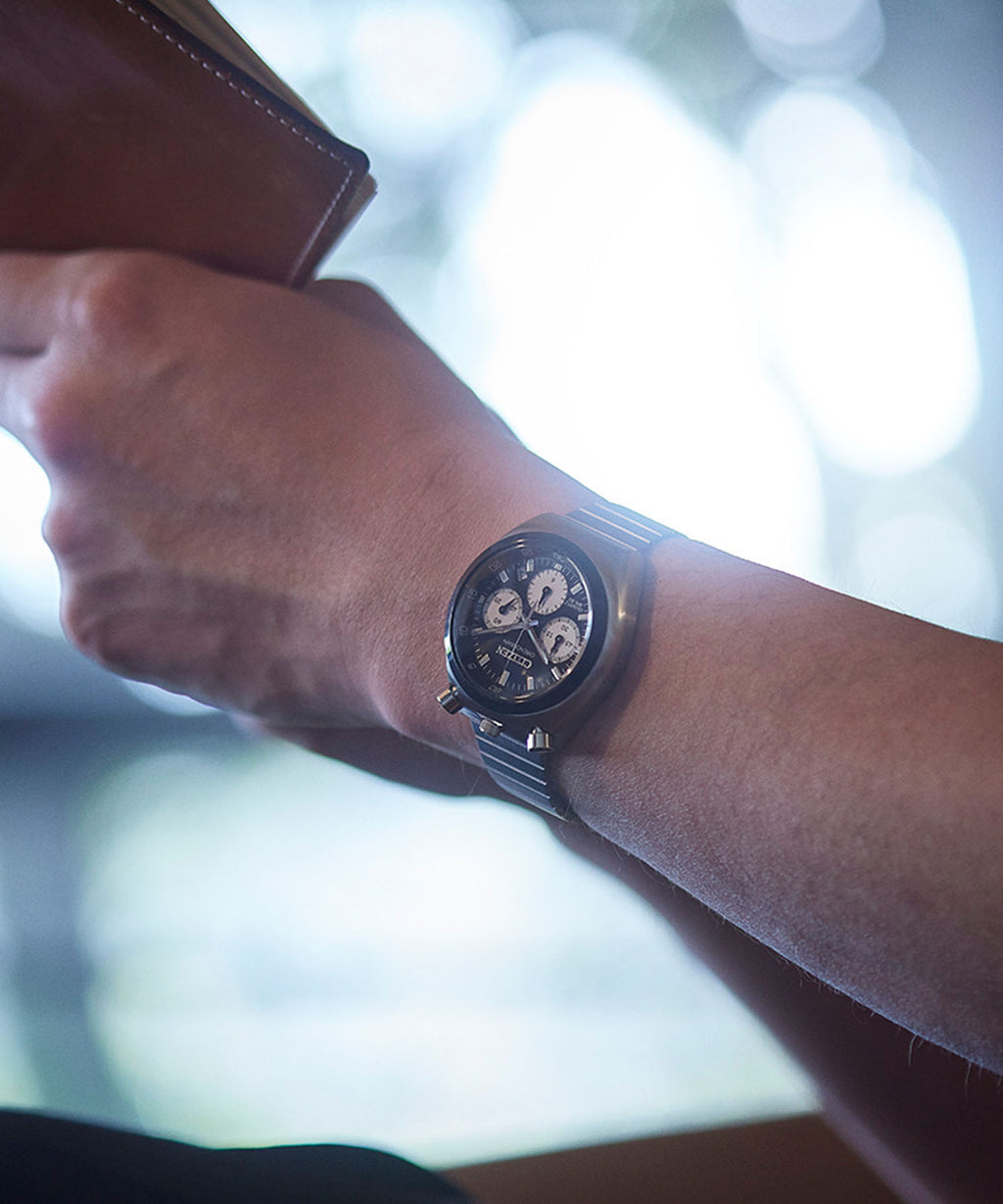 シチズン初の本格クロノグラフ機能付き時計として1973年に登場した「クロノグラフ チャレンジタイマー」のデザインを復刻。ケースの12時側に配置されたプッシュボタンがツノのように見えることで、「ツノクロノ」の愛称で呼ばれてきたアイコンモデルです。ケースサイズは38.0mmと、手首に心地よく収まるサイズ感。