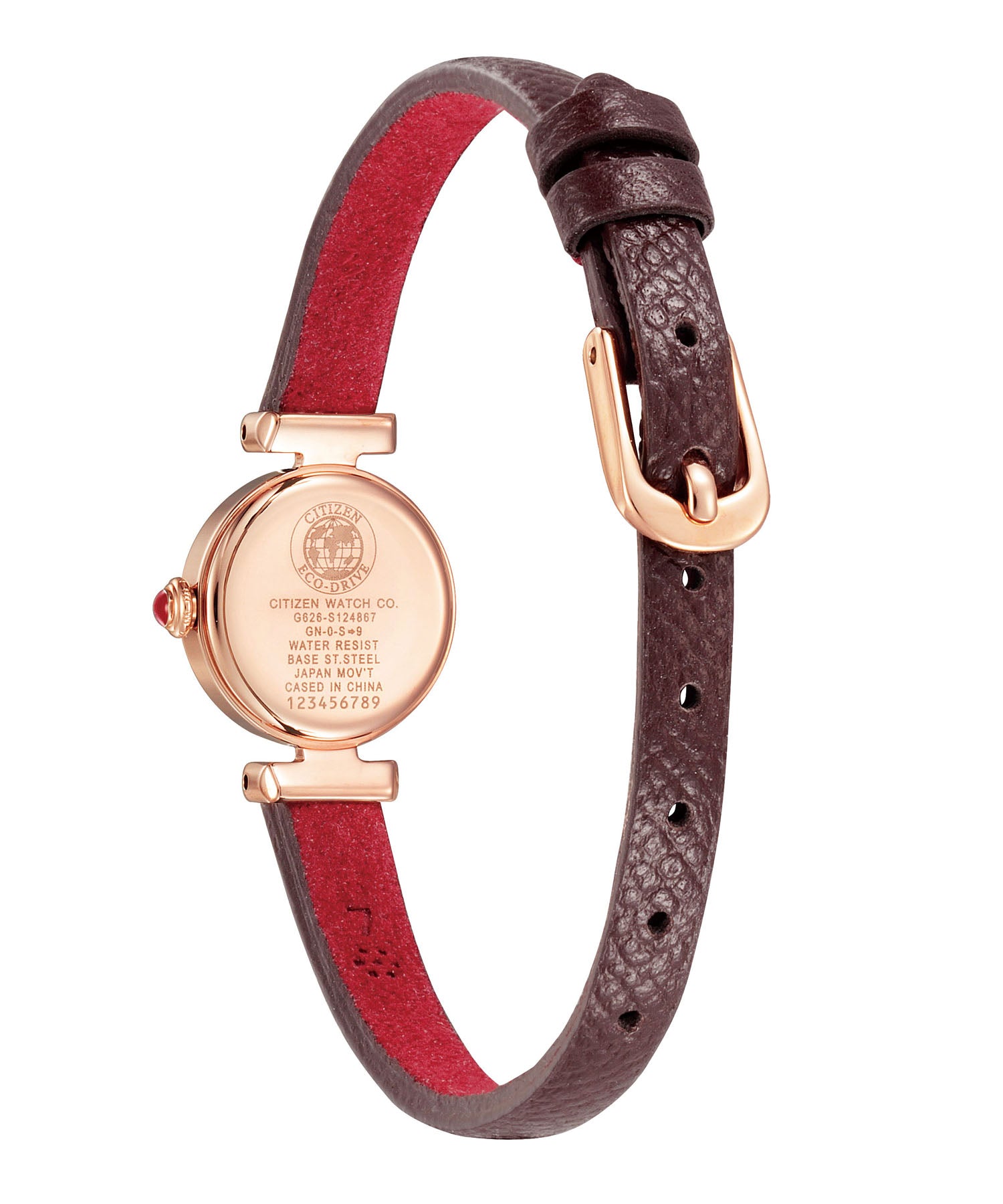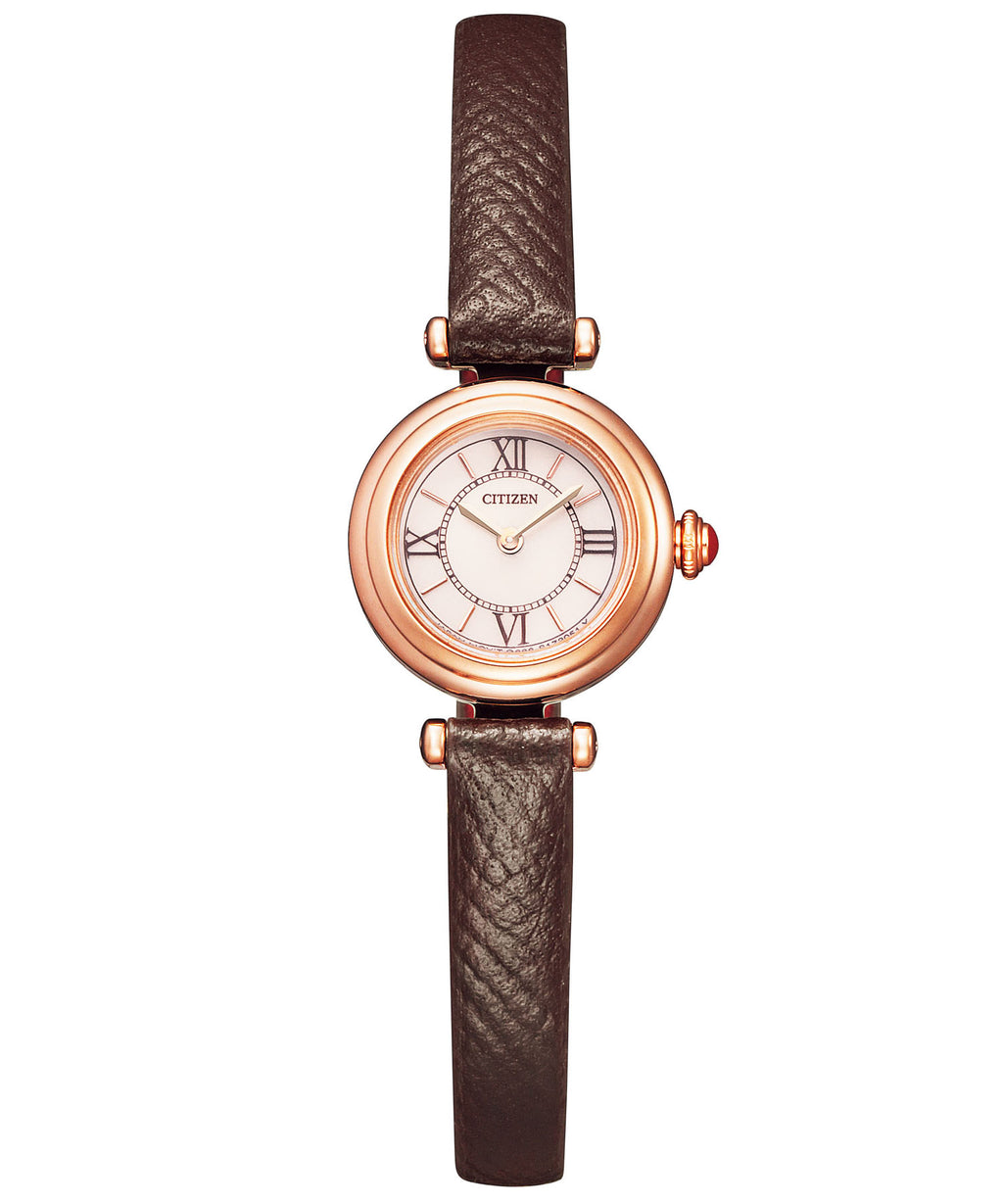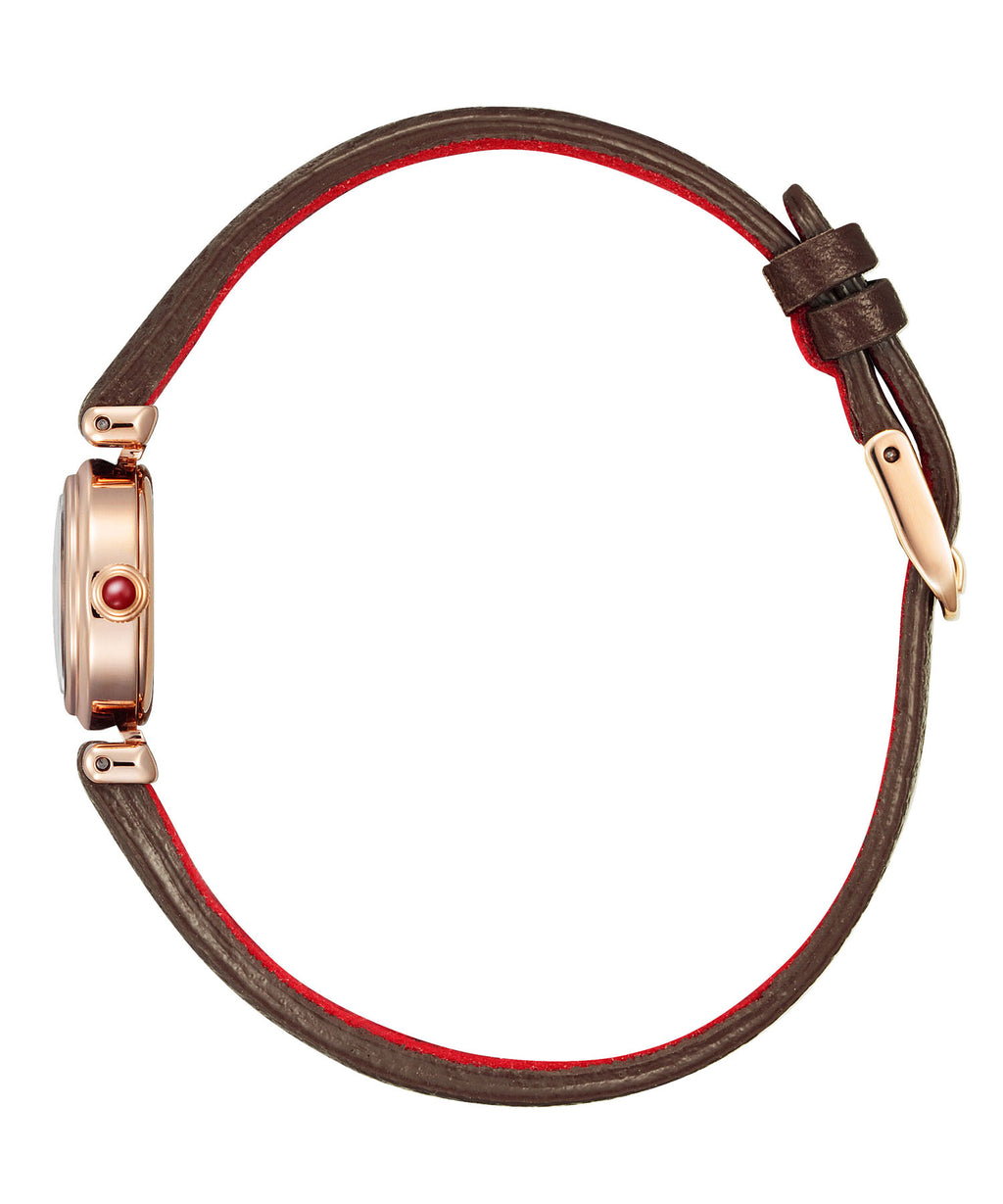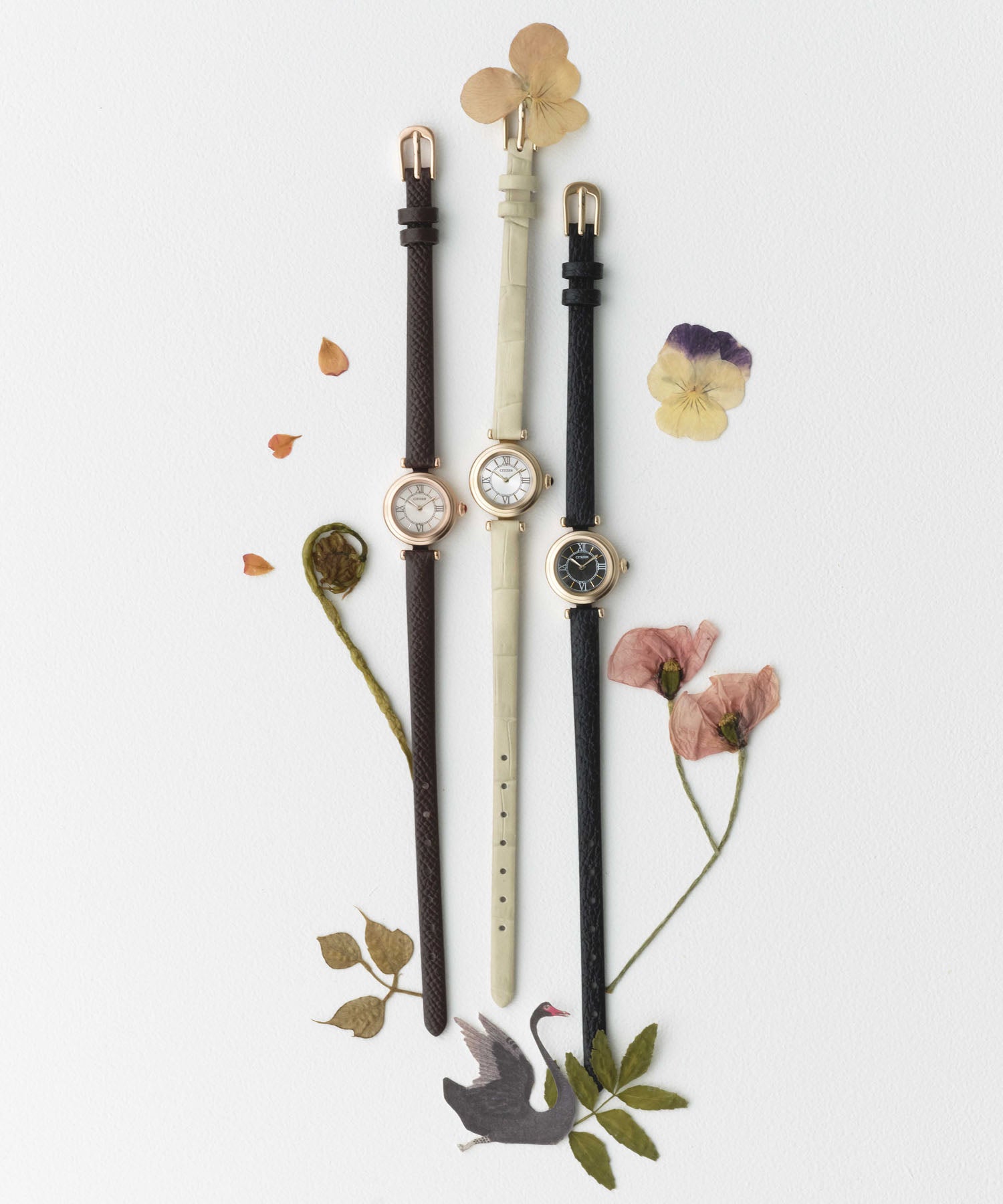ころんとした可愛いフォルム、華奢な印象のラウンド型ケース。飾りピンに見立てたアクセントパーツがシックでアンティークな印象を演出します。インデックスはクラシカルでマニッシュな印象のローマ字フォントを採用し、秒単位で時間が確認できるレール切分をプリント。小さめの文字板でありながらも見やすく、おしゃれ感のあるデザインです。風合いのあるカーフ革バンド。裏地のカラーリングにもこだわり、細部までおしゃれ感を追求しています。長くご愛用いただけるよう、市販の革バンドへの付け替えも可能です。