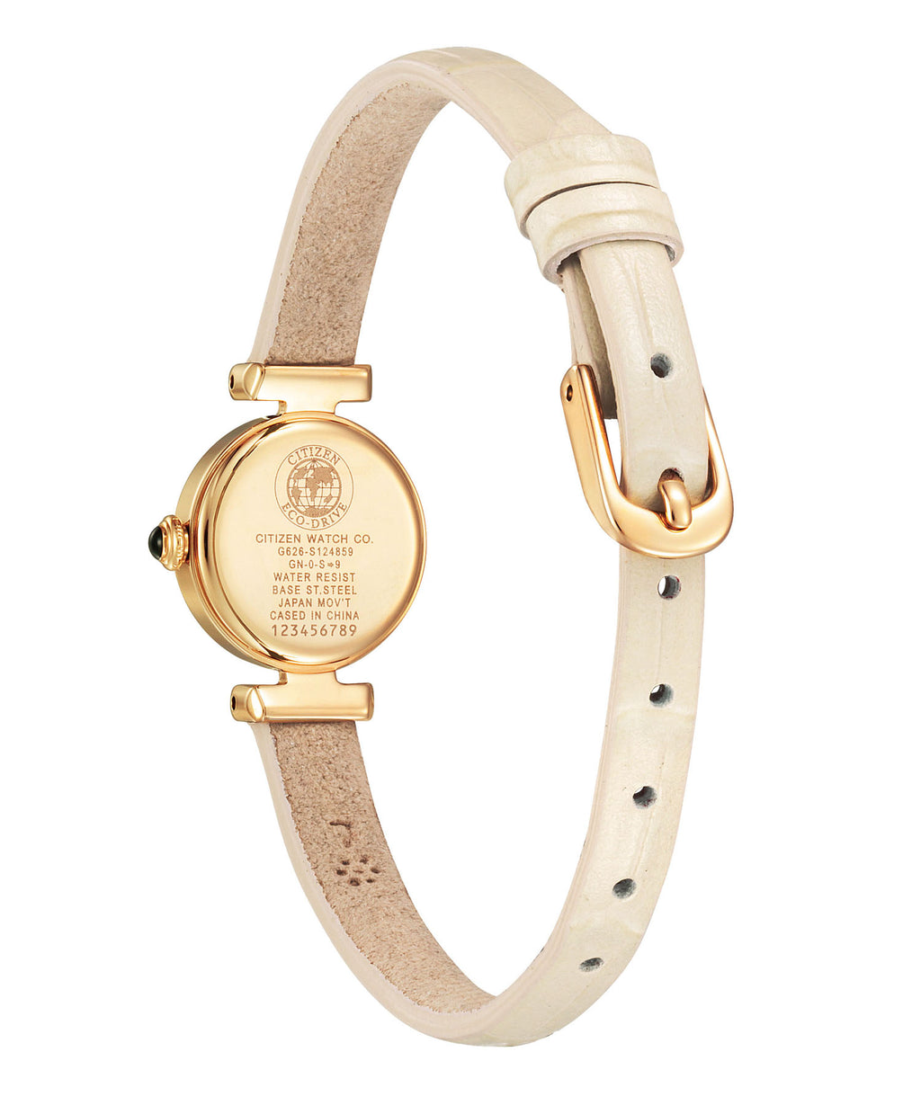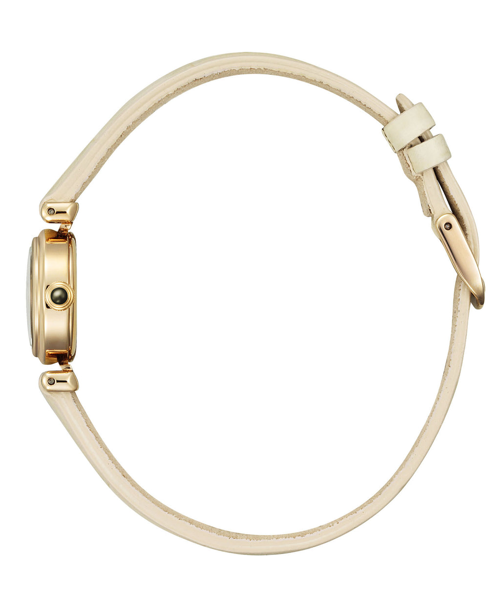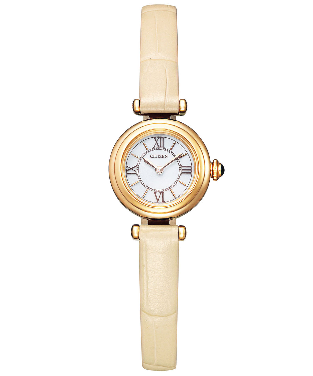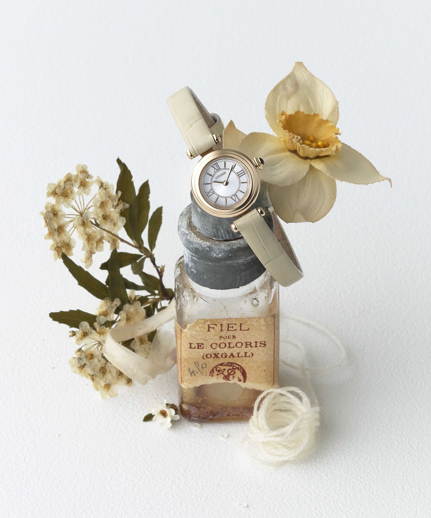ころんとした可愛いフォルム、華奢な印象のラウンド型ケース。飾りピンに見立てたアクセントパーツがシックでアンティークな印象を演出します。インデックスはクラシカルでマニッシュな印象のローマ字フォントを採用し、秒単位で時間が確認できるレール切分をプリント。小さめの文字板でありながらも見やすく、おしゃれ感のあるデザインです。風合いのあるカーフ革バンド。裏地のカラーリングにもこだわり、細部までおしゃれ感を追求しています。長くご愛用いただけるよう、市販の革バンドへの付け替えも可能です。