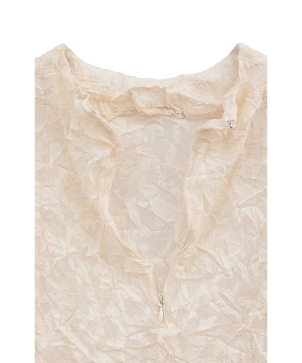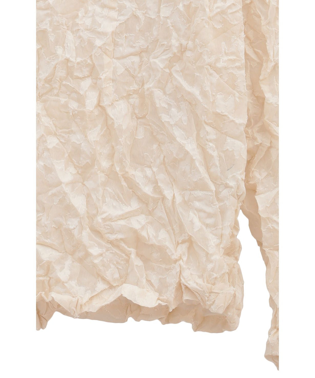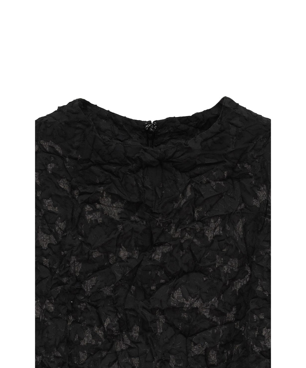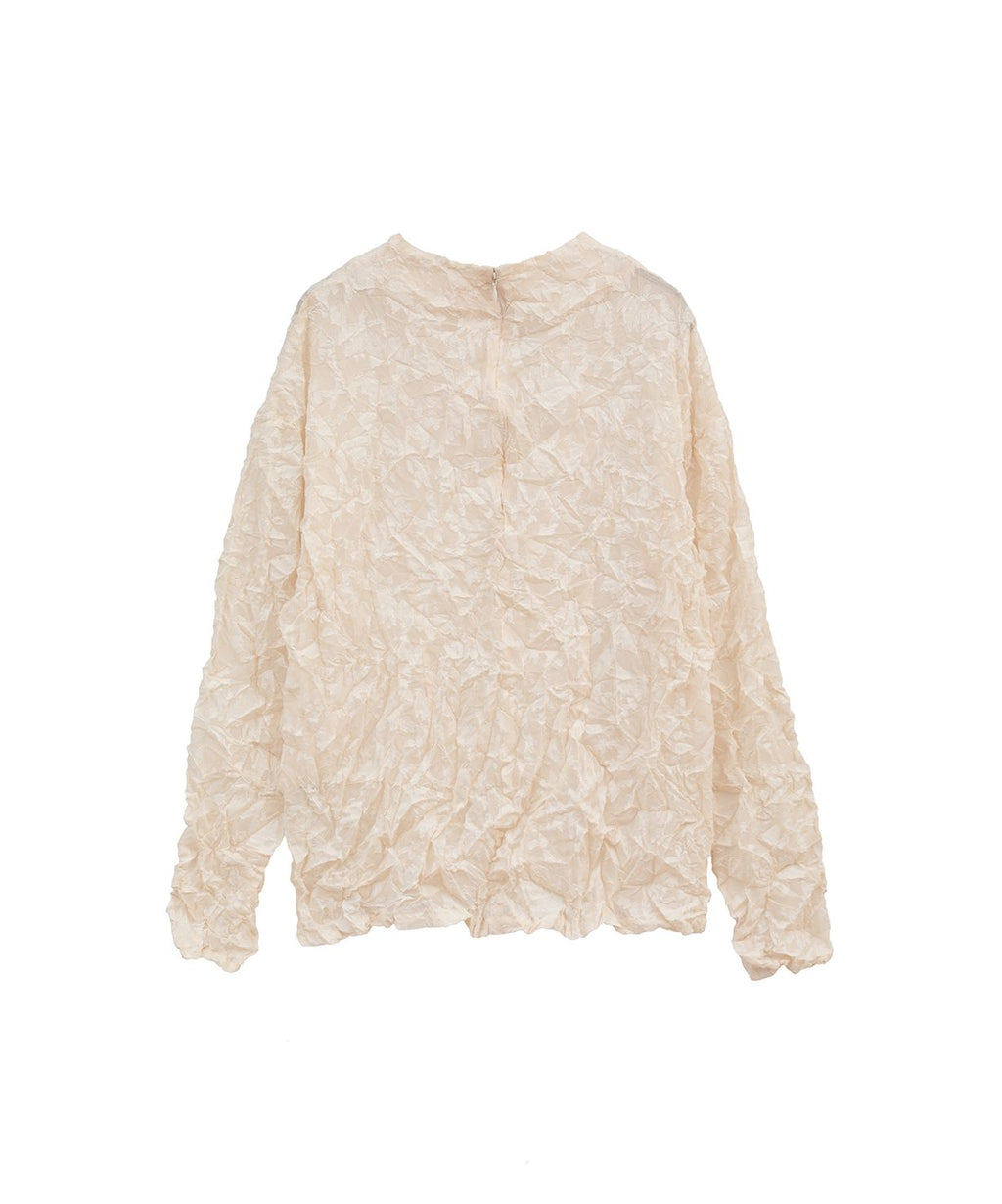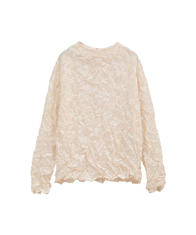 シワ感のある表情豊かでレーシーなテキスタイルが、大人のセンシュアルとモードを両立するプルオーバー。すっきり詰まったネックラインが顔周りをスタイリッシュに引き締めてくれるから、ノーブルなイメージもキャッチした着こなしが叶いそう。