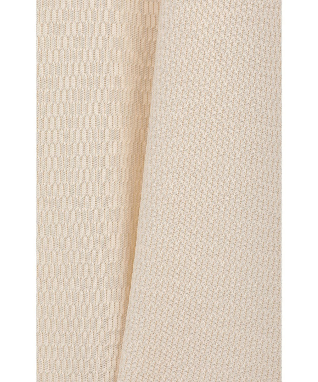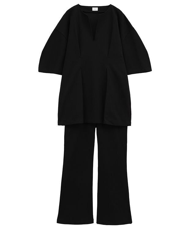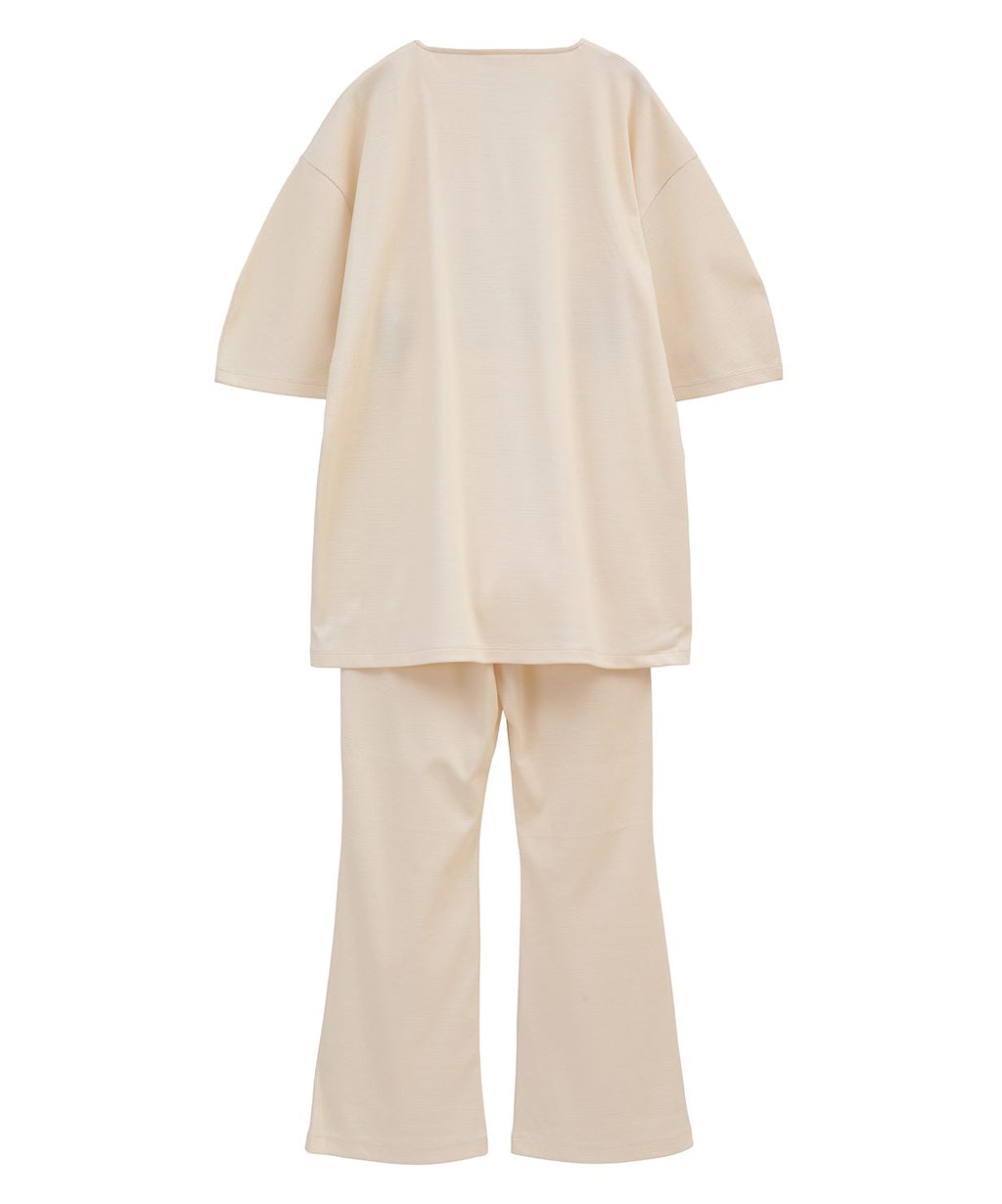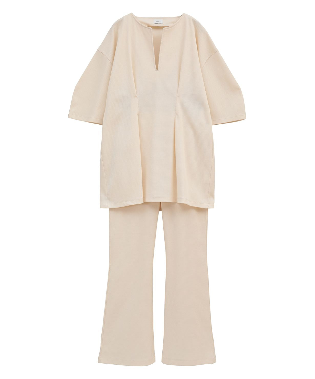 カジュアルすぎず綺麗見えするハニカム素材で、トップスはウエストにタックが入っていて、スタイルアップ効果が期待できます。パンツはストレートシルエットで、シルエットが綺麗に見えるように拘ったセットアップアイテムです。
