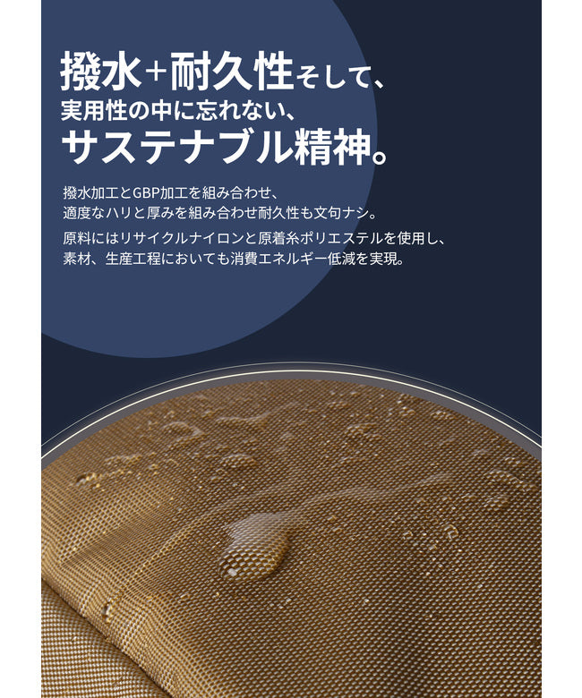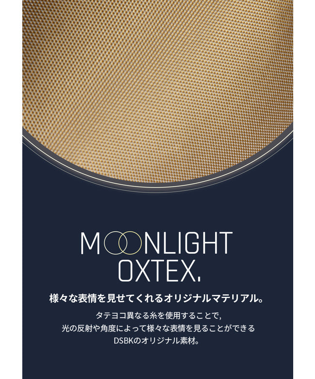 MOONLIGHT OXTEX.はリサイクルナイロンと原着糸ポリエステルを使用した糸、及び生地生産時に消費するエネルギーを抑え、環境負荷を低減した素材です。また表面には撥水加工を施し、裏面にはGBP加工という最新の加工を施し生地に適度なハリ感や厚みを持たせ耐久性もUPさせた、オリジナル素材になります。