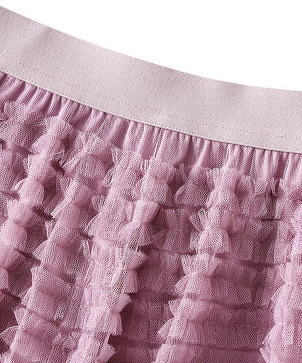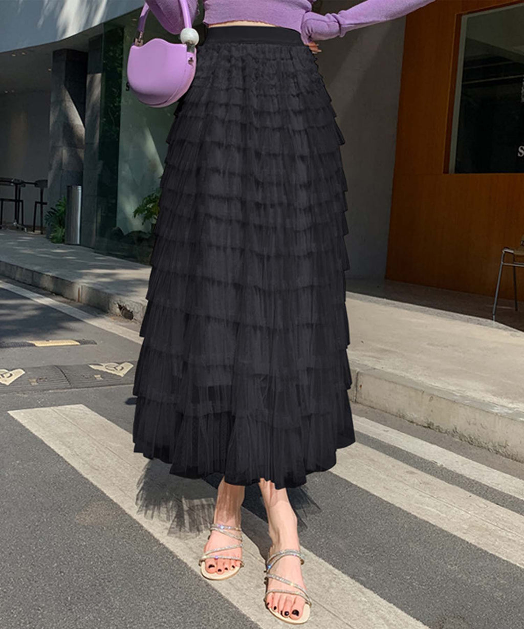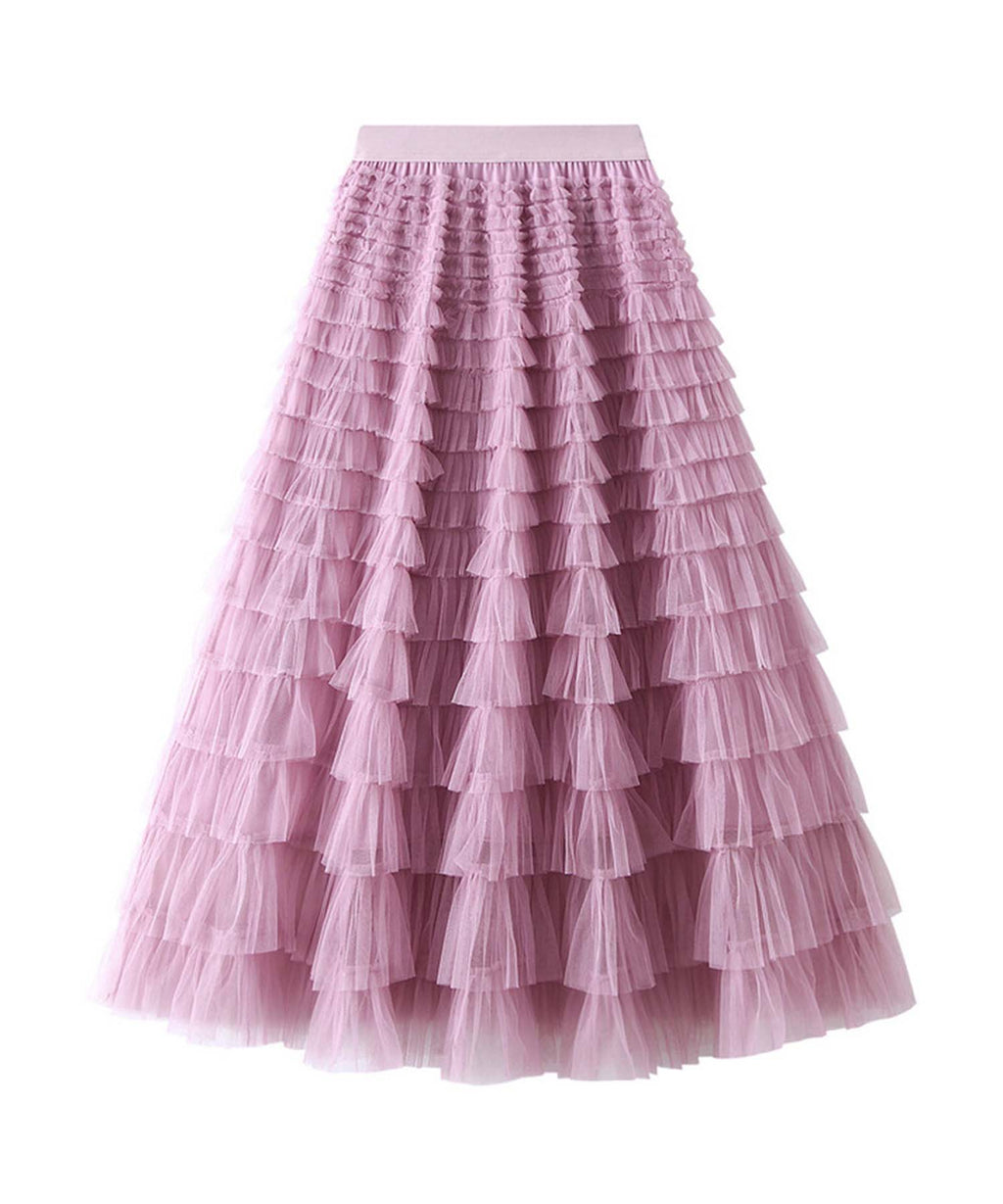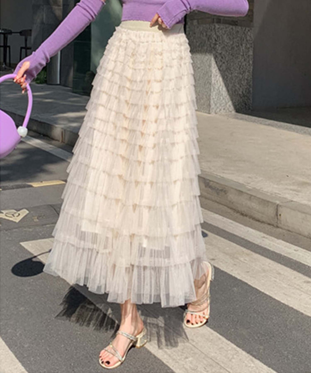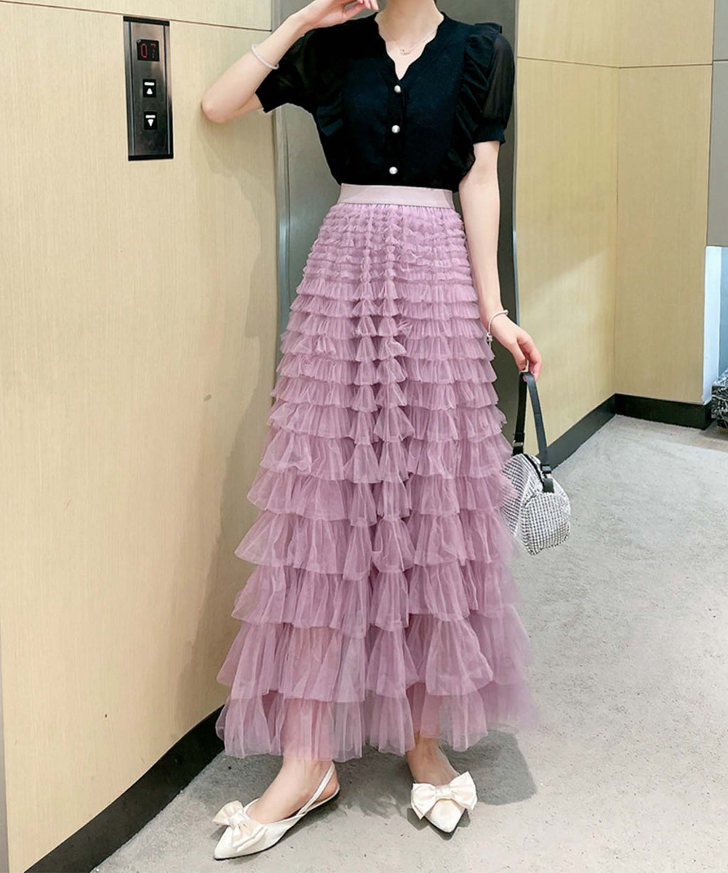 【●何十枚ものパーツをつなぎ合わせ、立体的なボリュームシルエットで、ボディ全体を華奢に見せてくれるティアードスカート】
