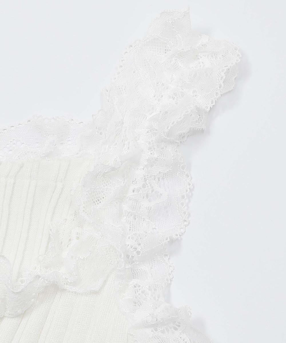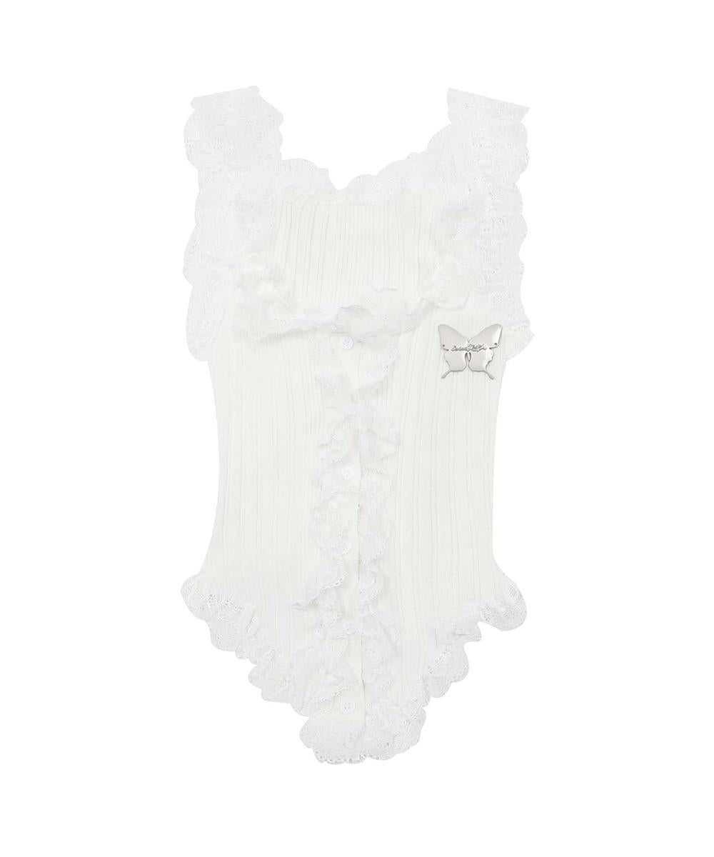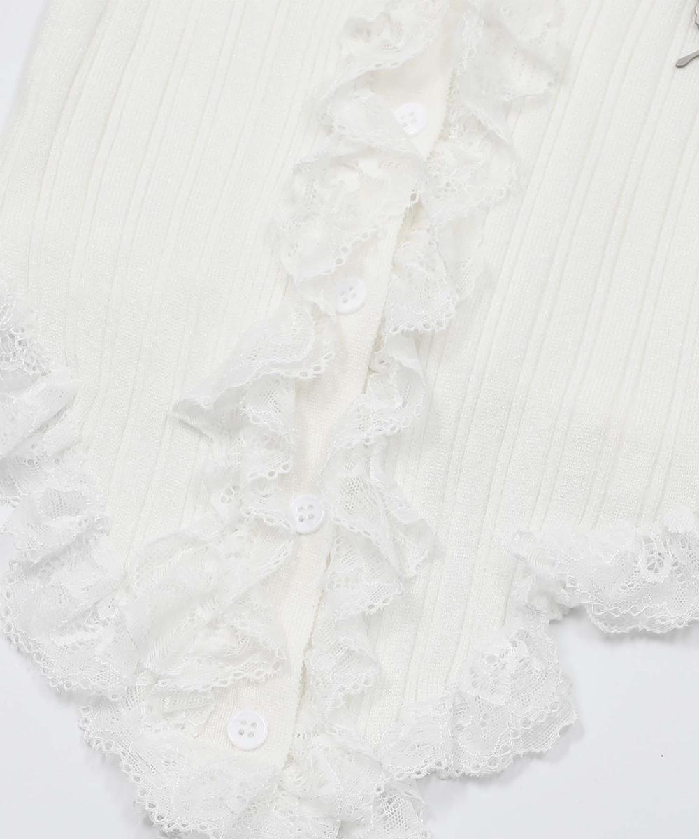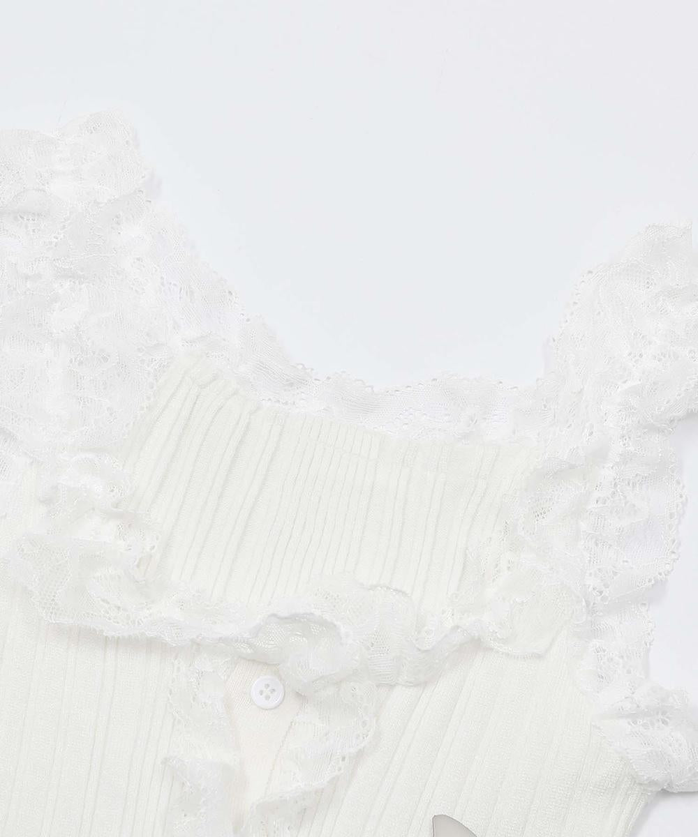 フロントにたっぷりとあしらわれたフリルと、縁を飾る繊細なレースが特徴的なビスチェ。