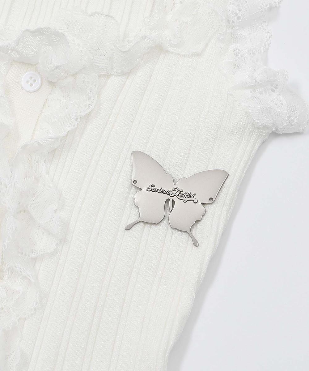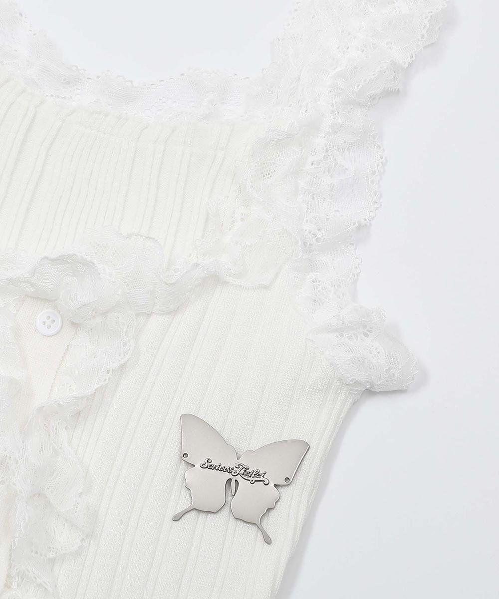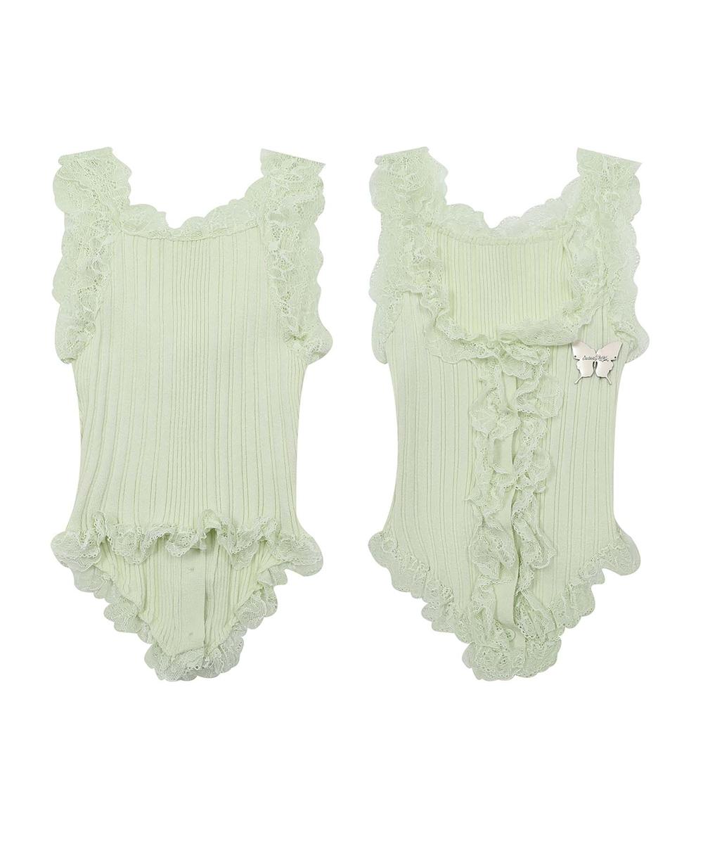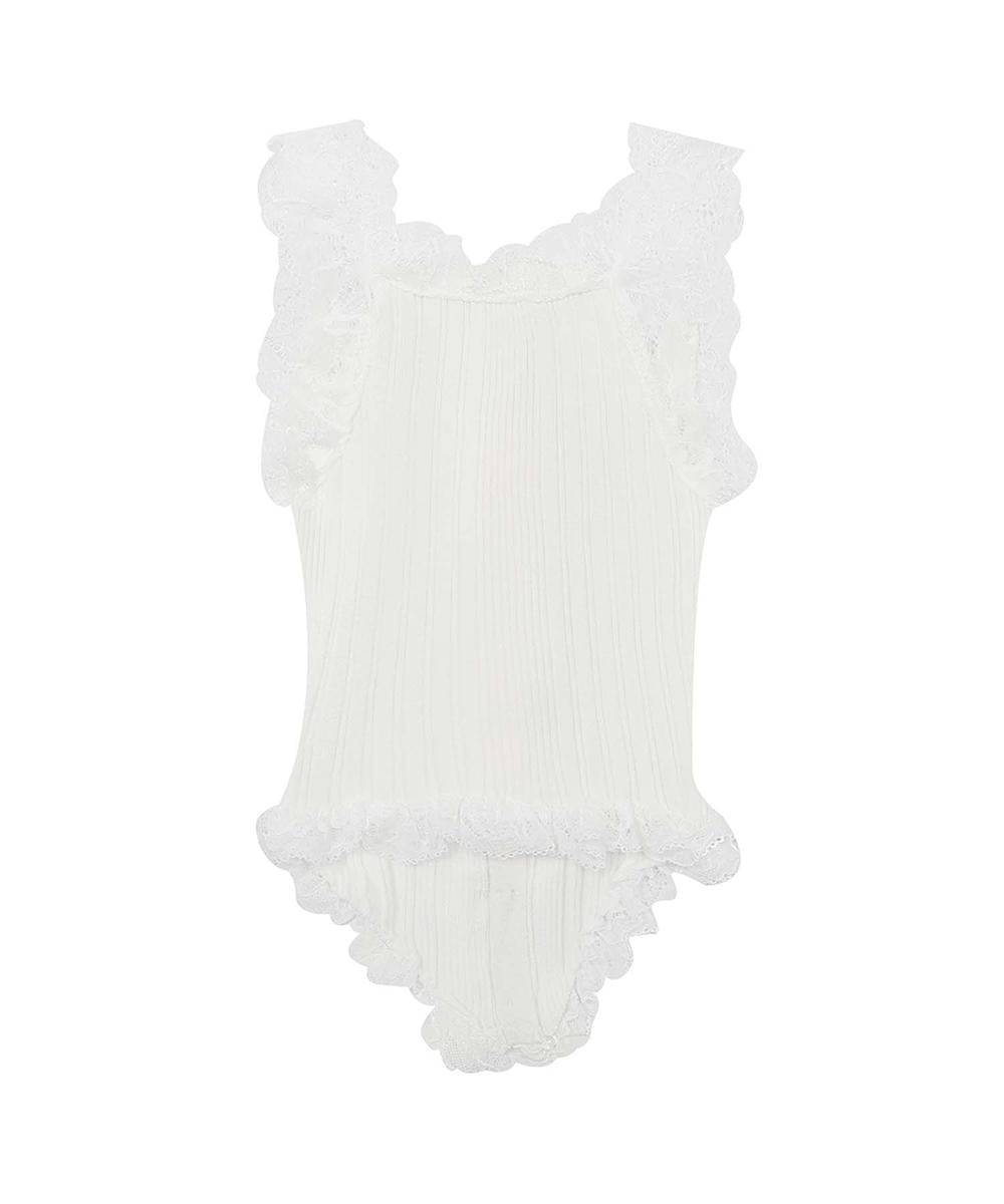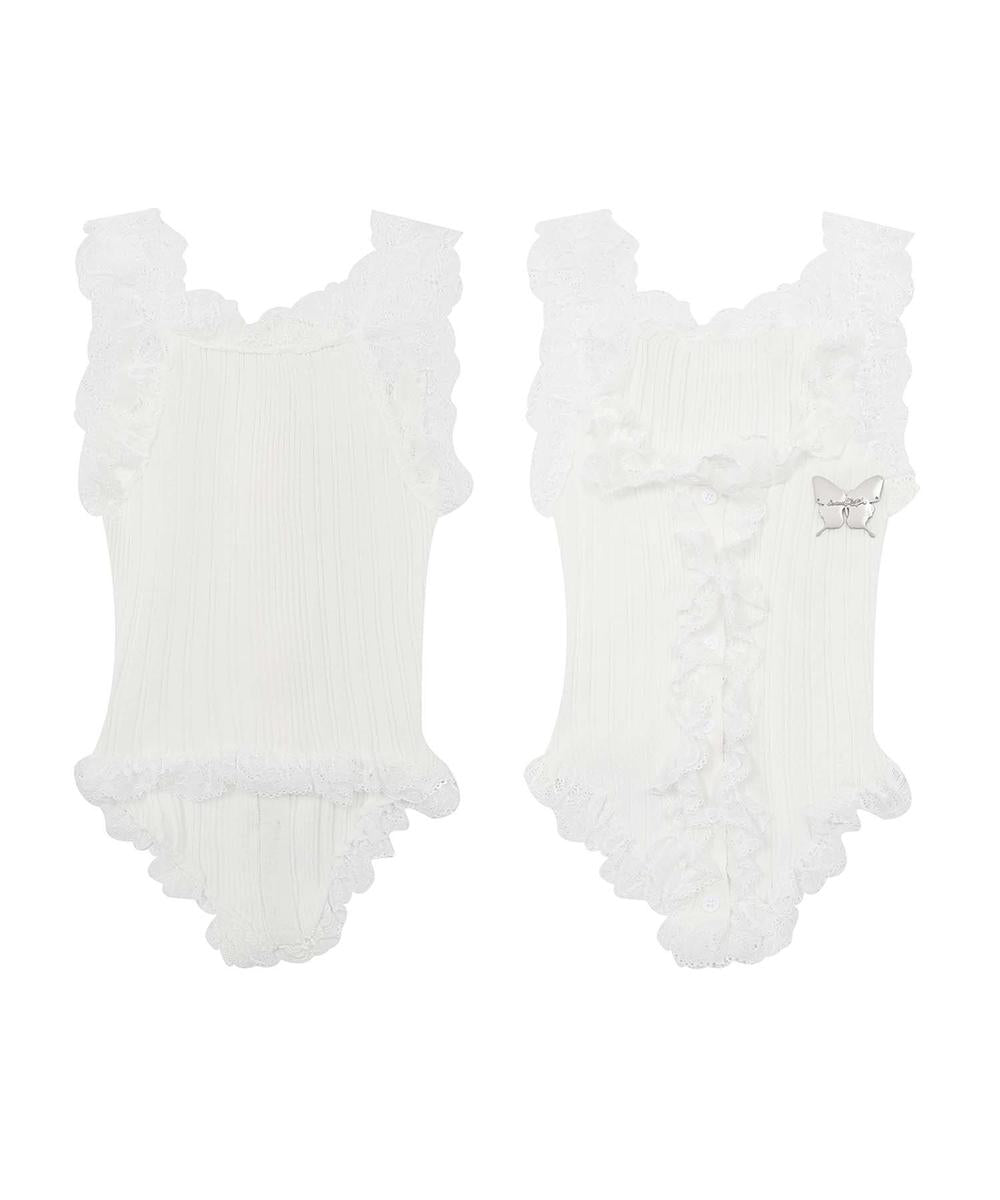 フロントにたっぷりとあしらわれたフリルと、縁を飾る繊細なレースが特徴的なビスチェ。