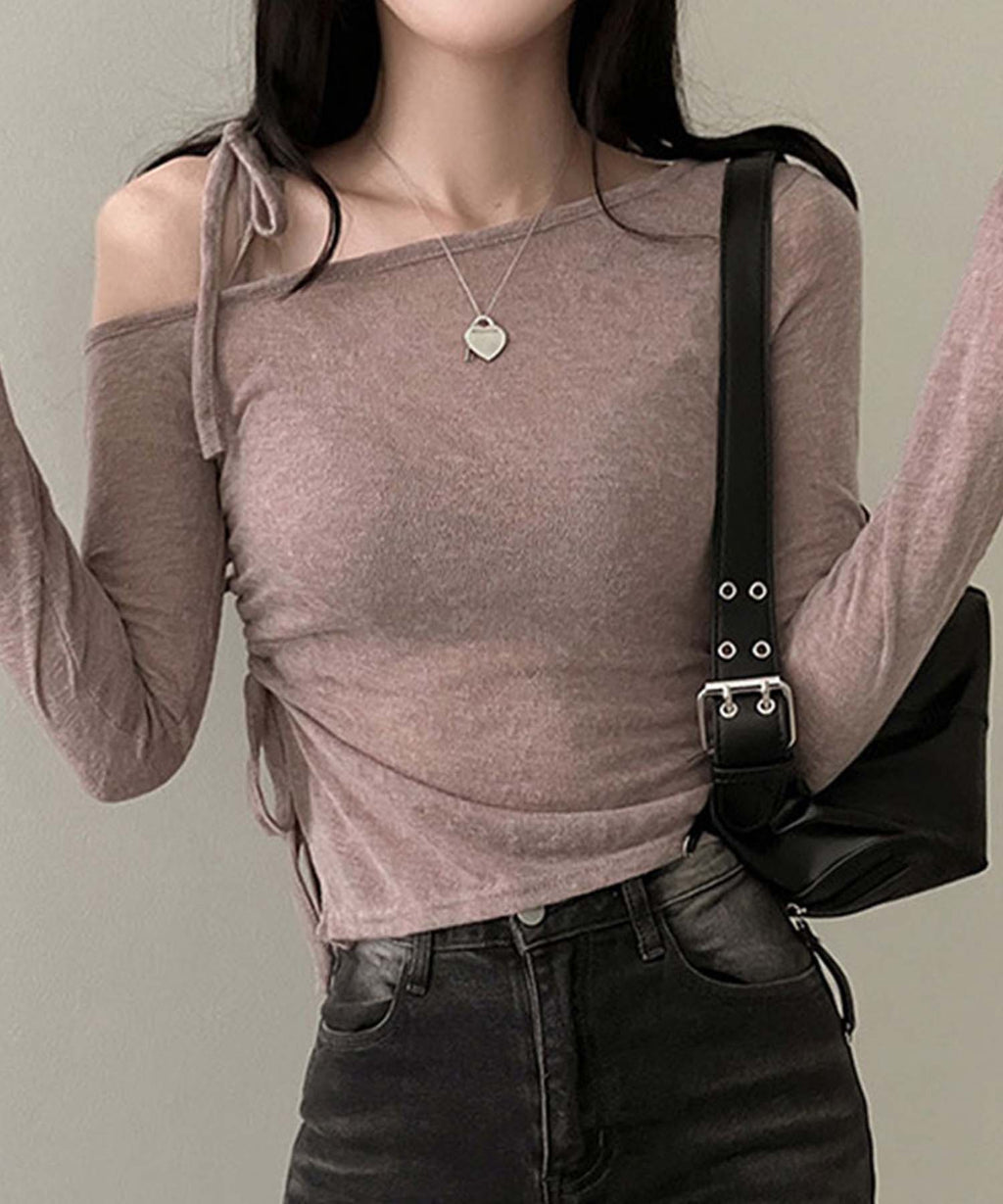 トレンド感溢れるデザインで、女性らしさを引き立てる肩見せショートトップス。