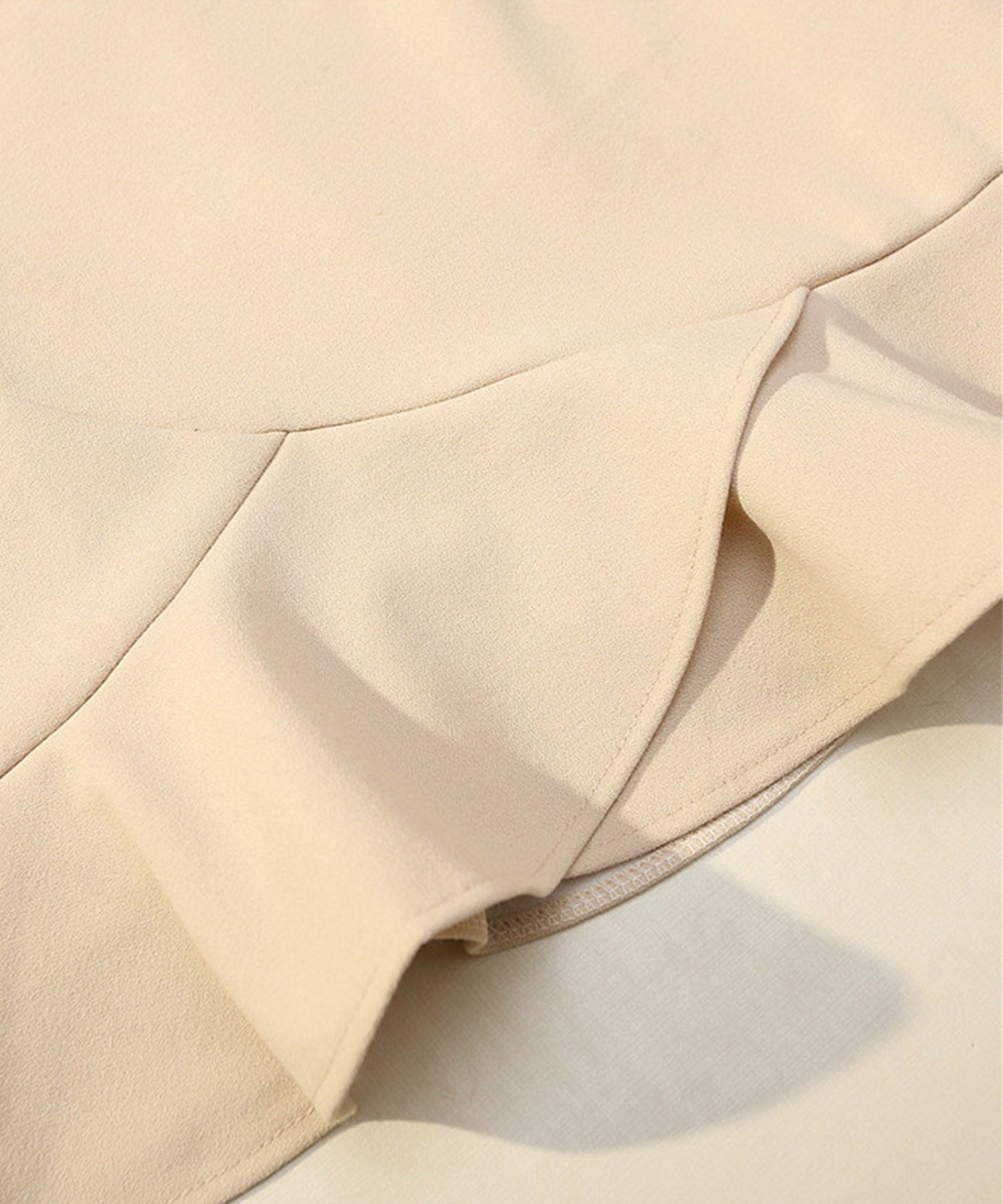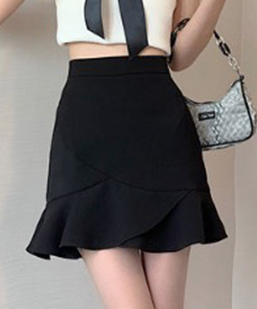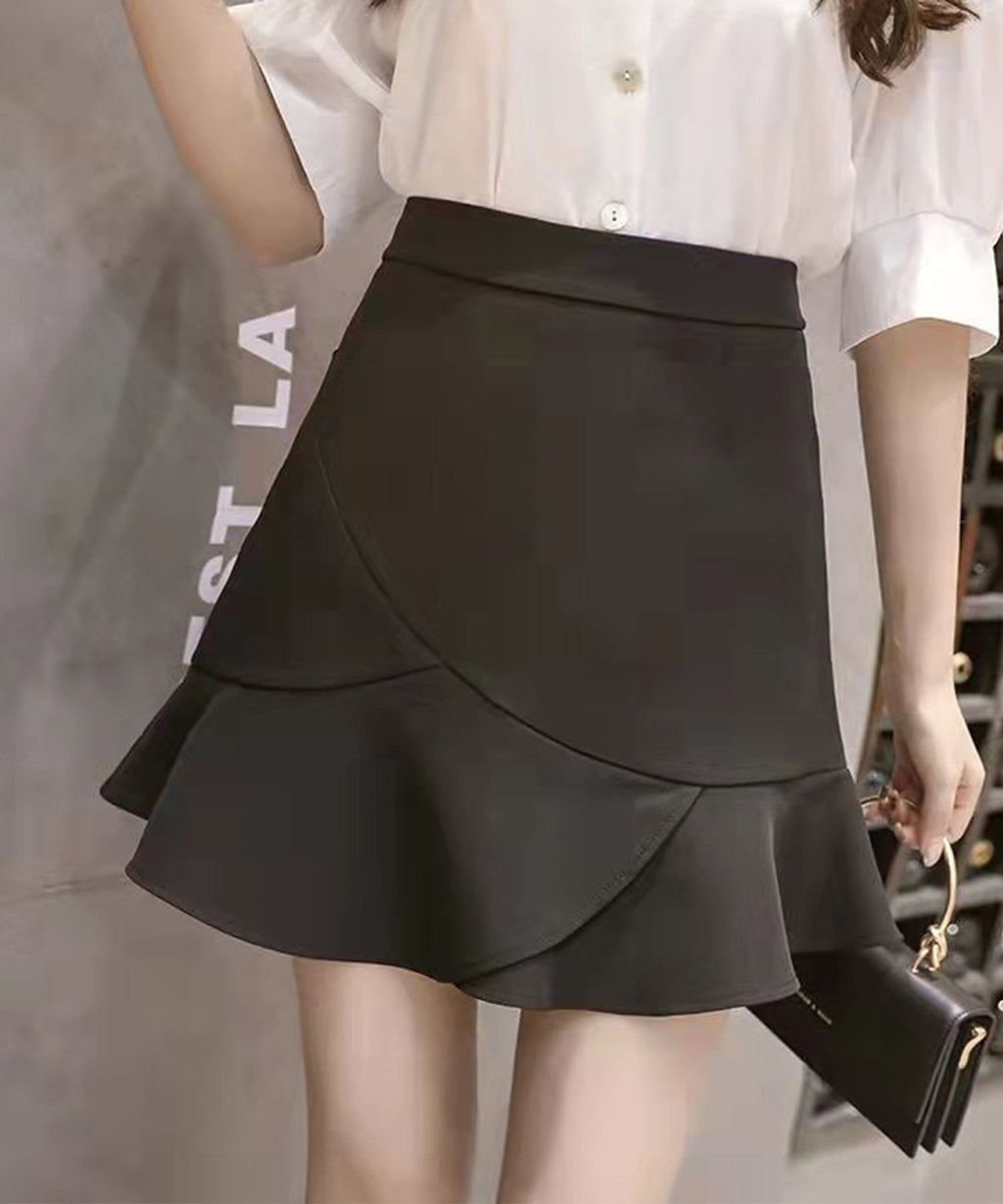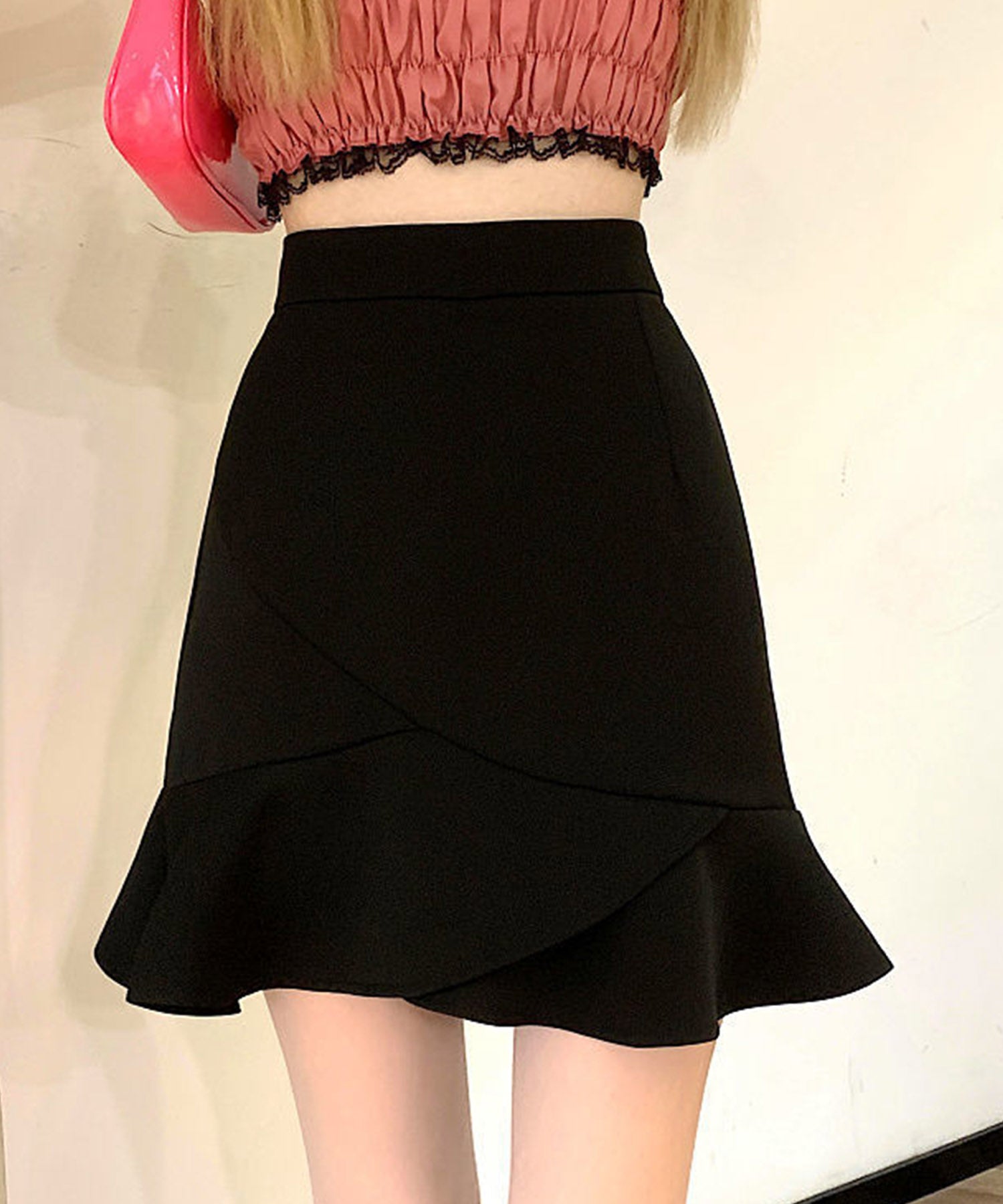 シンプルでありながら、フェミニンさを引き立てる裾フレアデザインが魅力的なミニマーメイドスカート。
