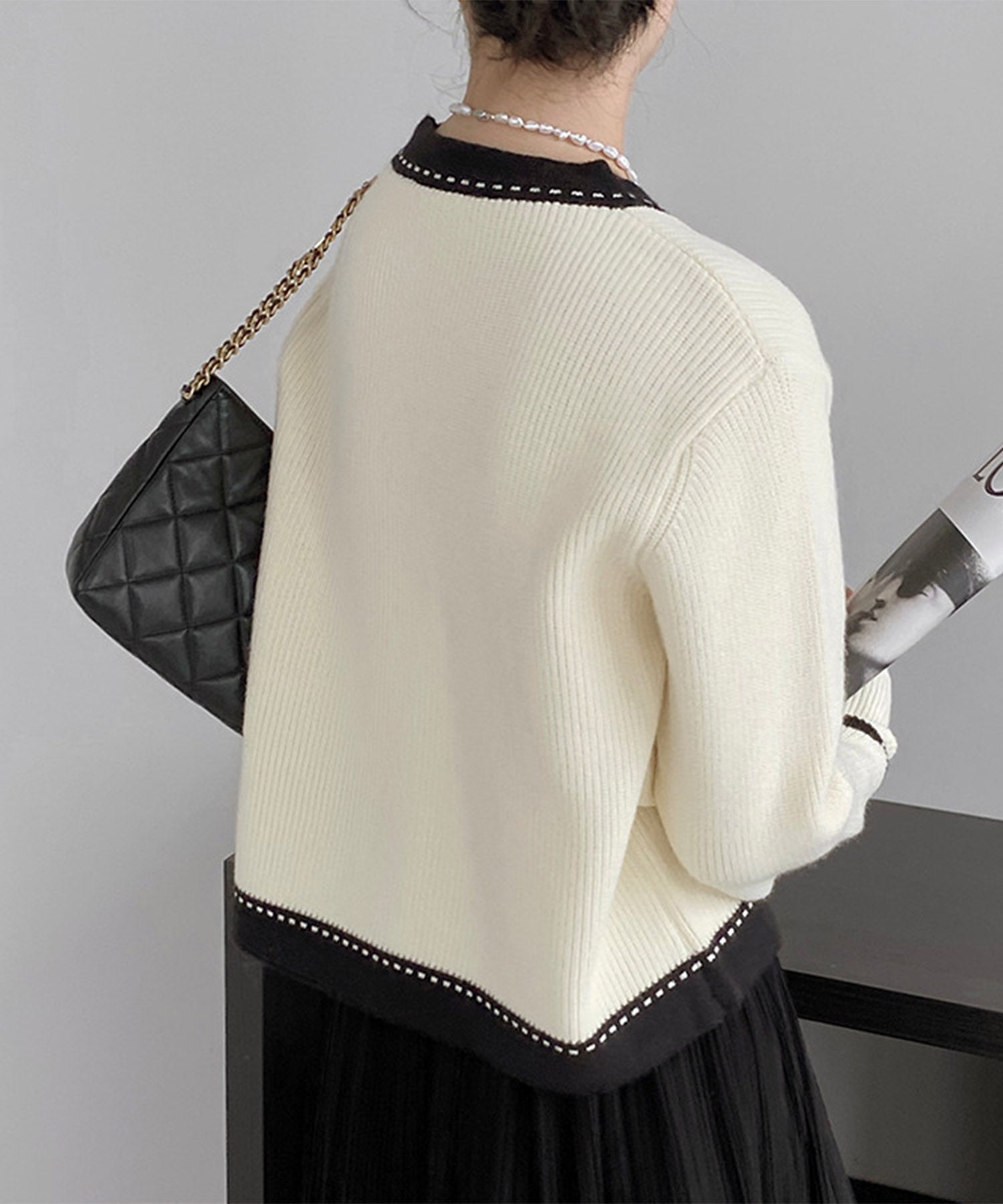 Vネックで鎖骨をきれいに見せたり、インナーを印象的に見せる。