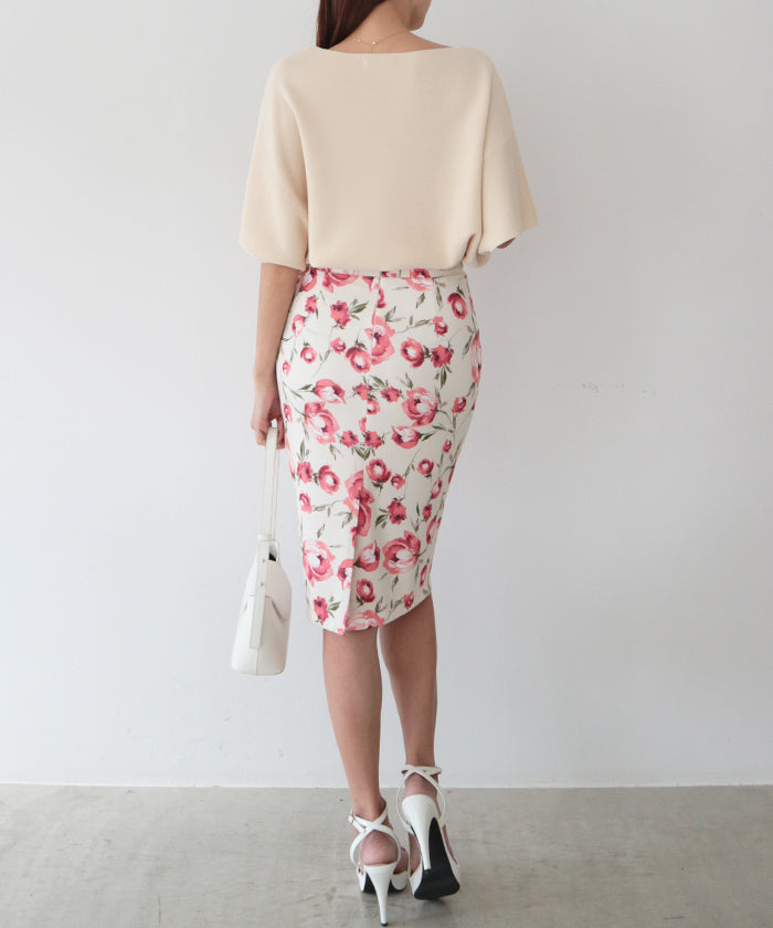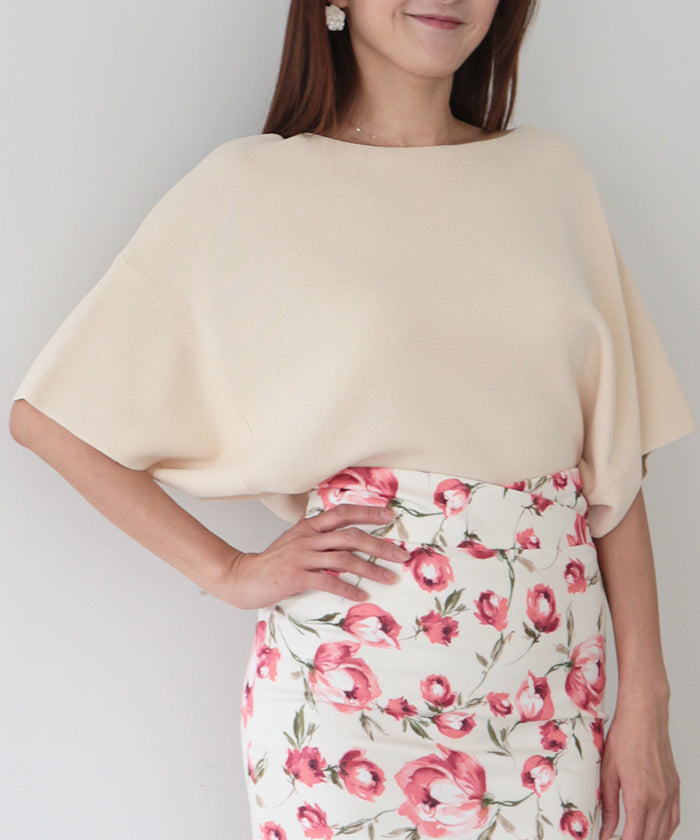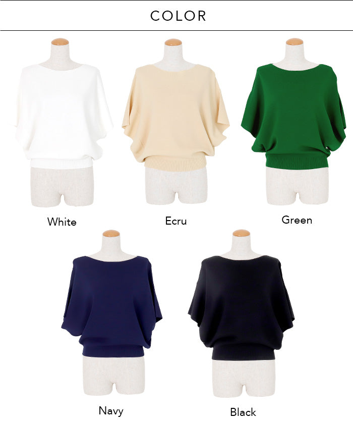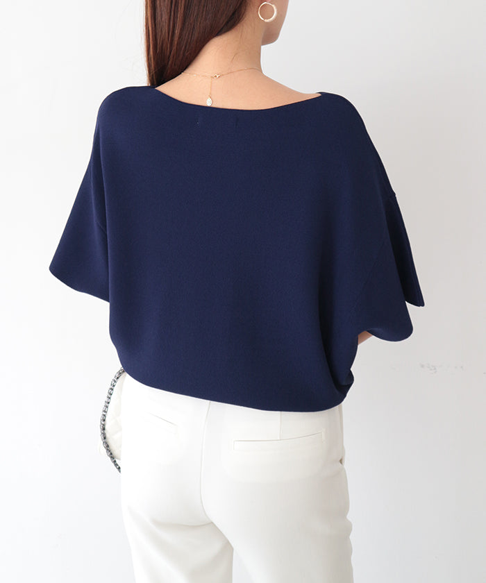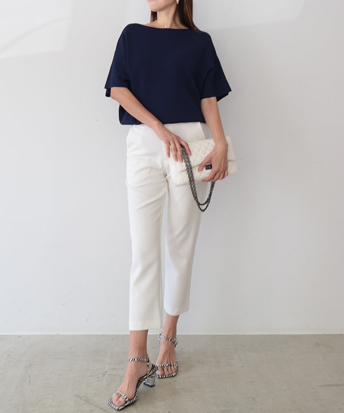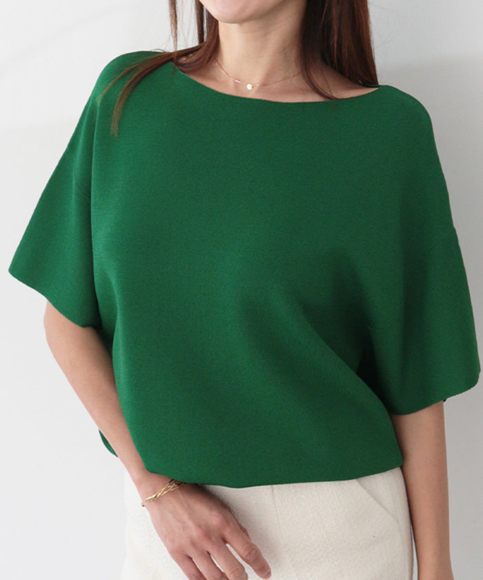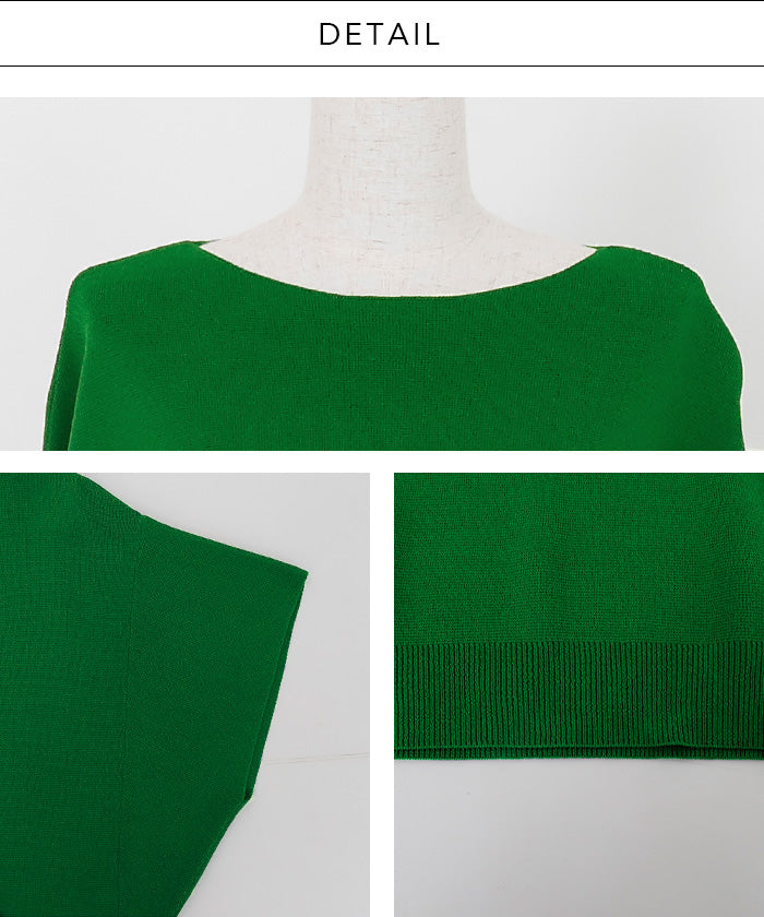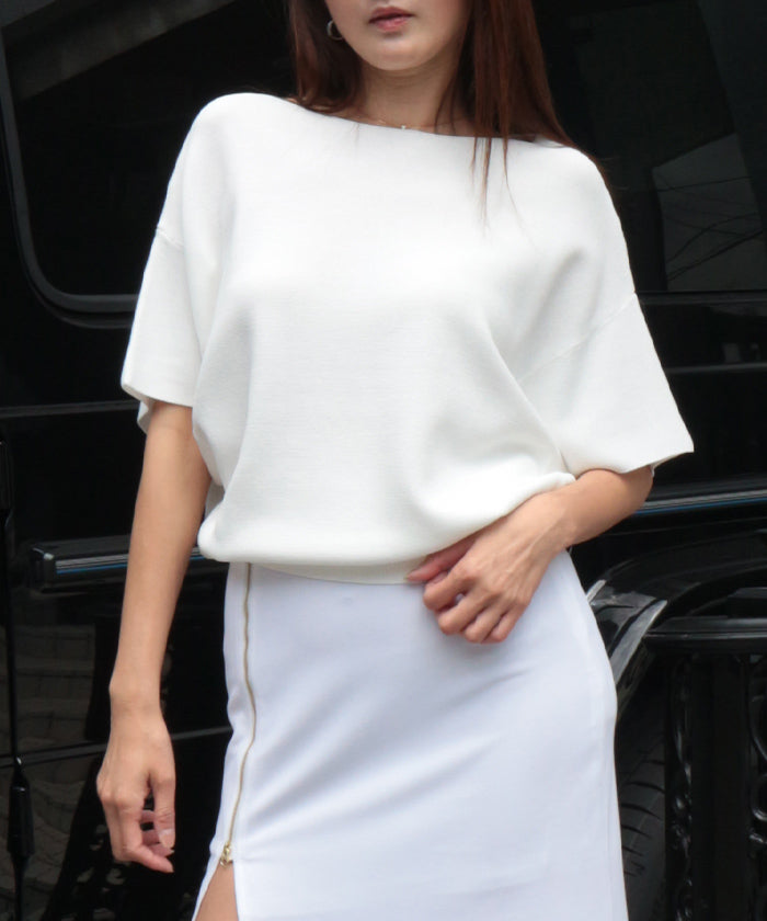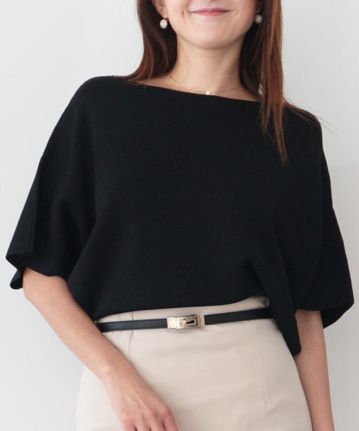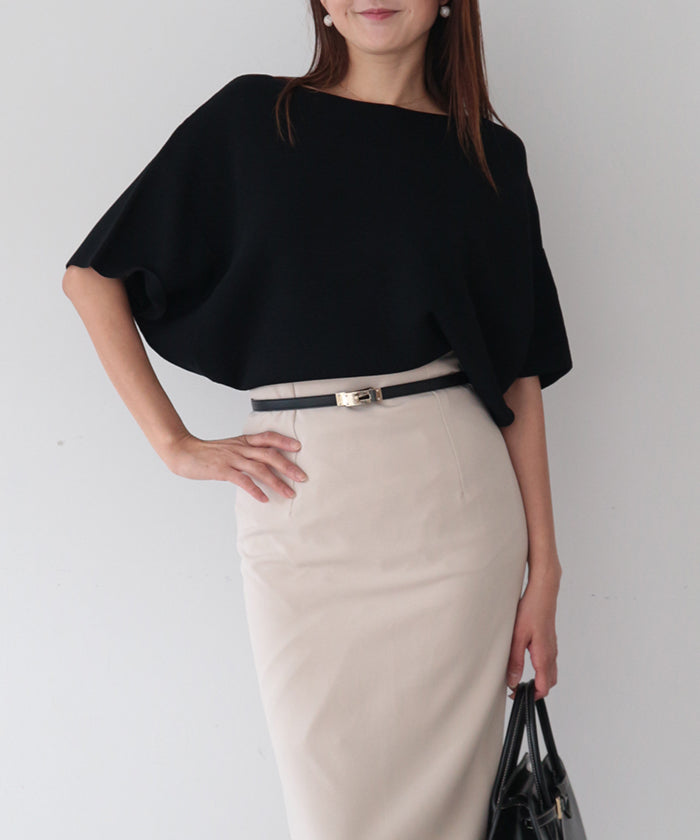 露出を抑え、すっきりとしたボートネックと袖丈を活かしたドルマンスリーブ。