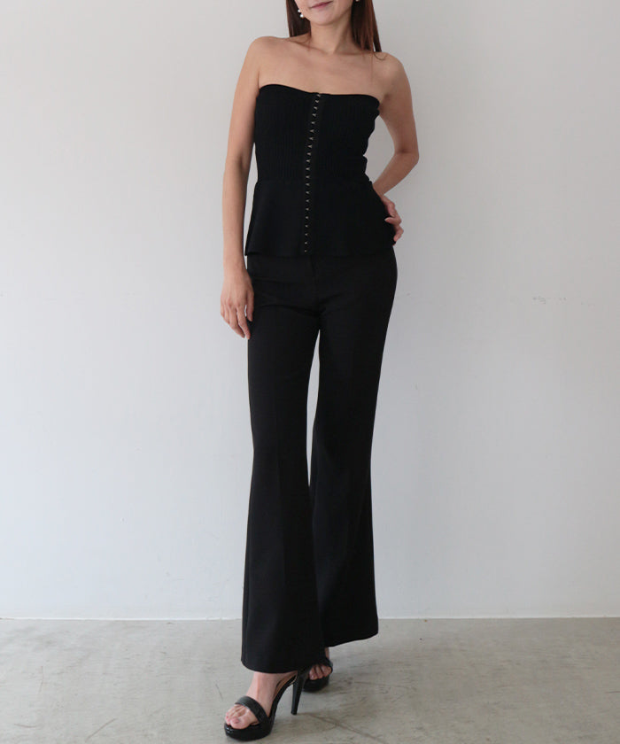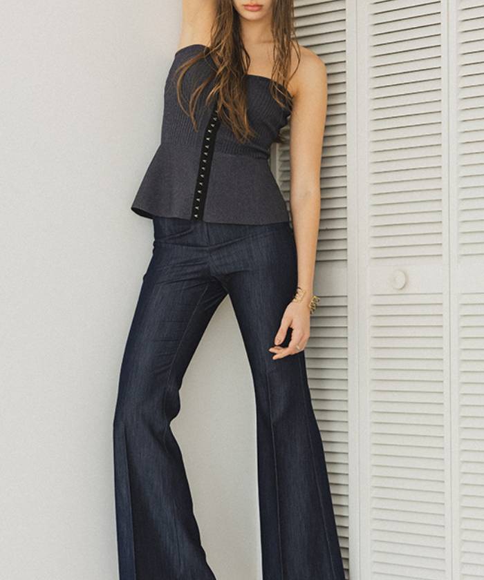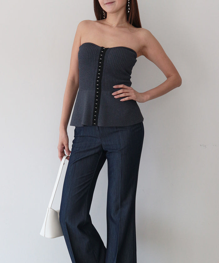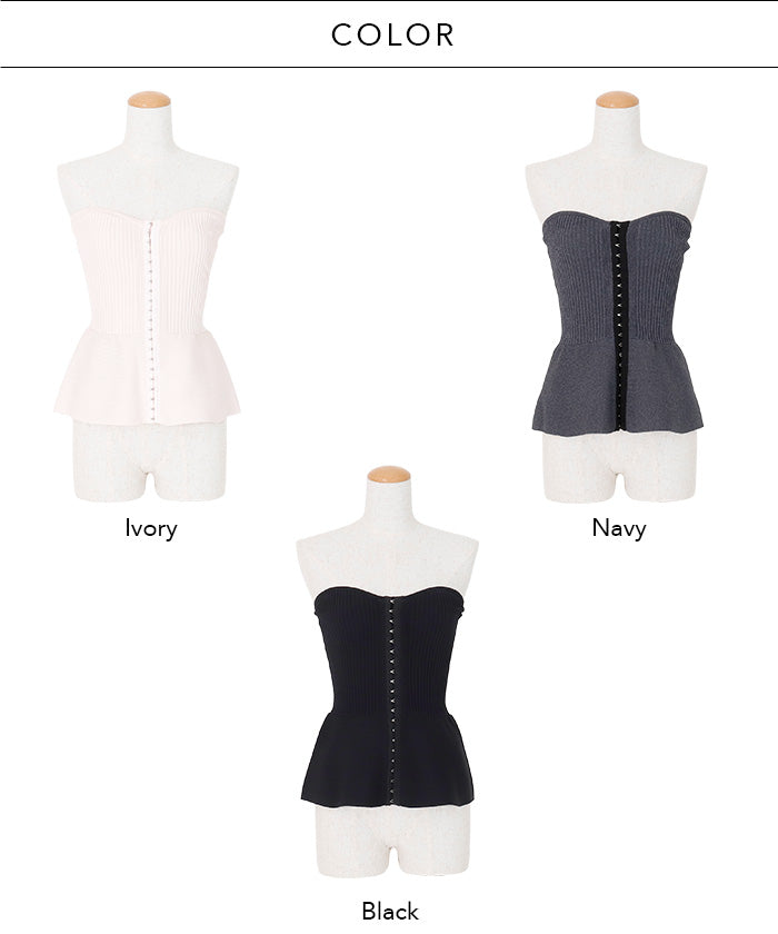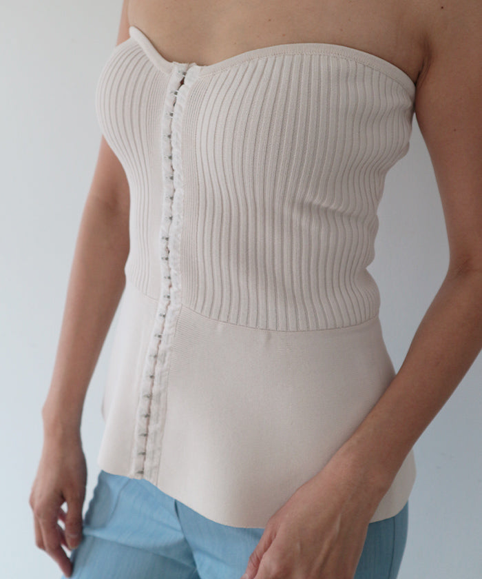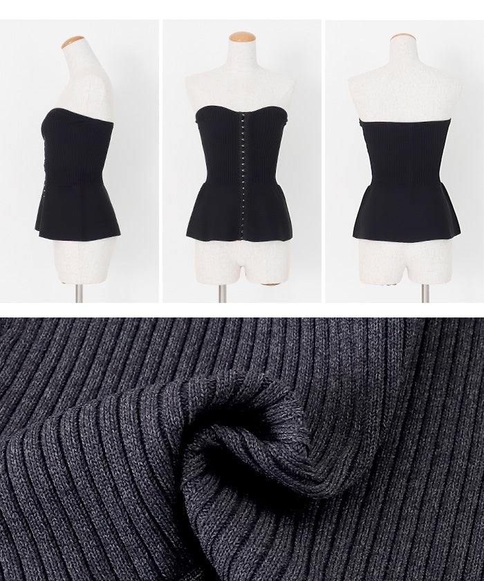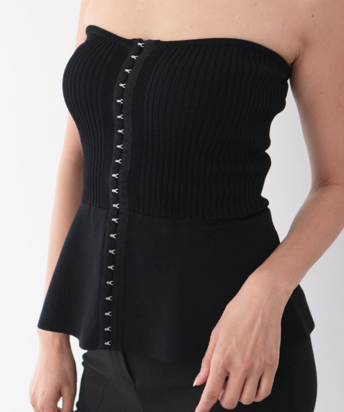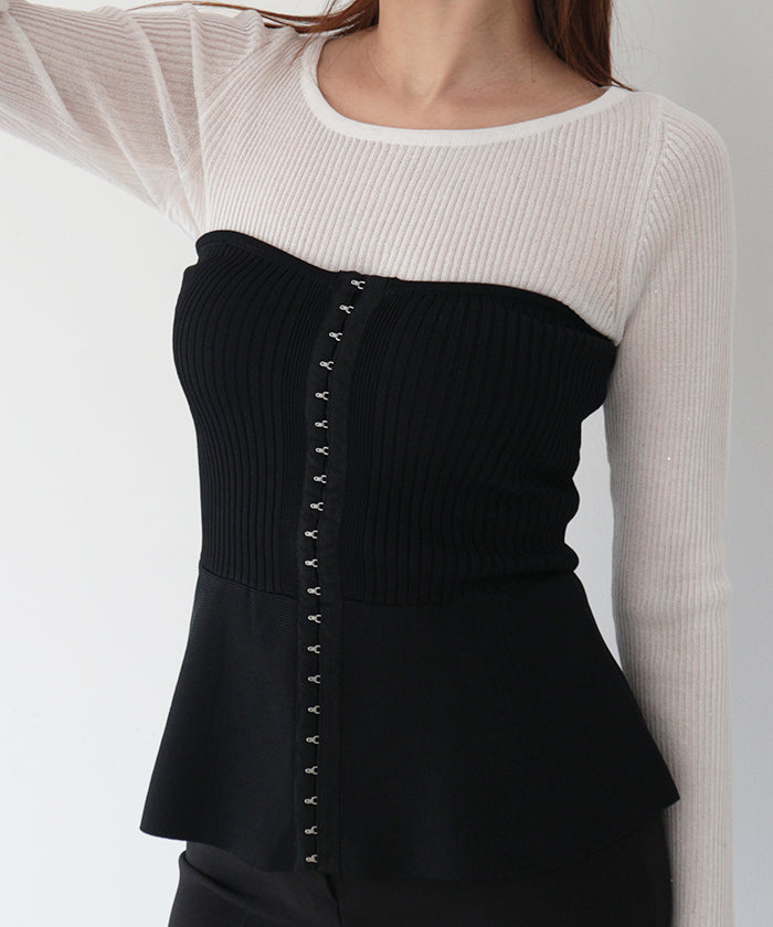リブ組織と、裾側は総針編みで組み合わせて仕上げ、あえて表に出しデザイン性を兼ね備えたフロントホックがアクセントになる逸品。