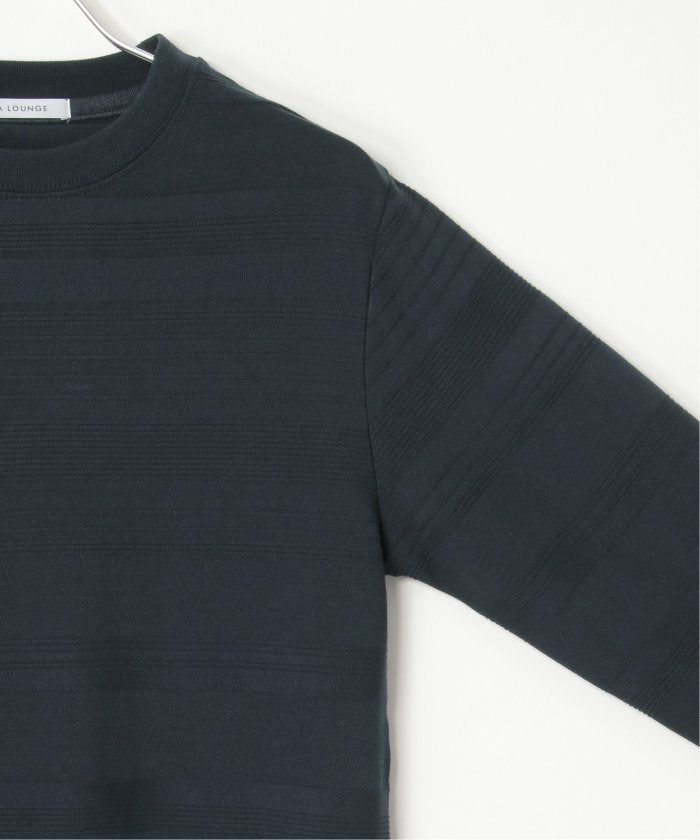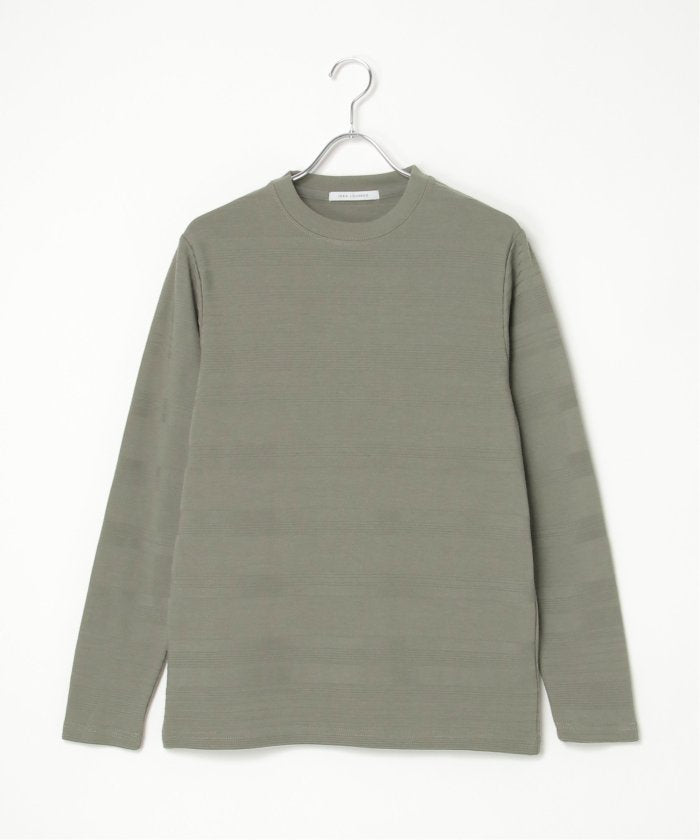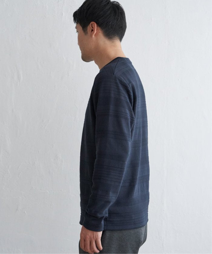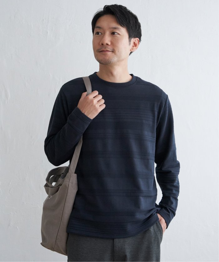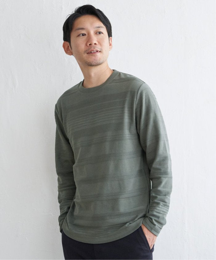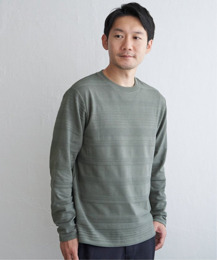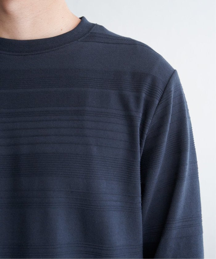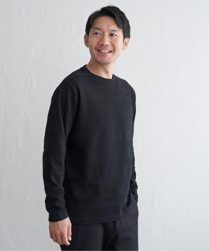 シンプルな長袖のクルーネックTシャツですが、生地の表面に凹凸のある地柄のランダムボーダーが特徴です。