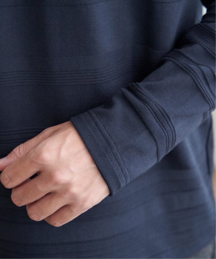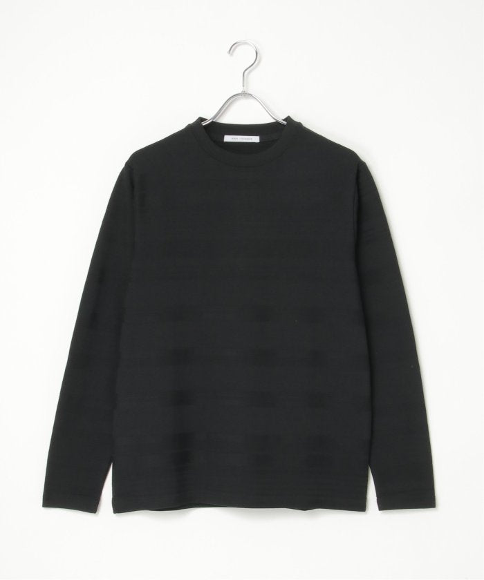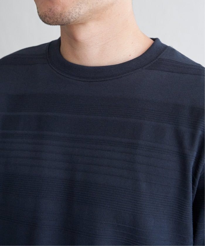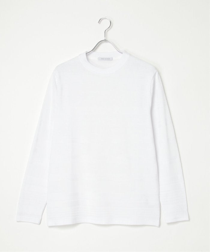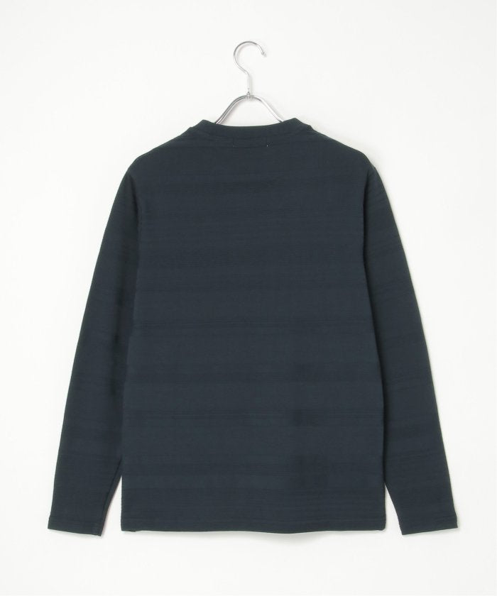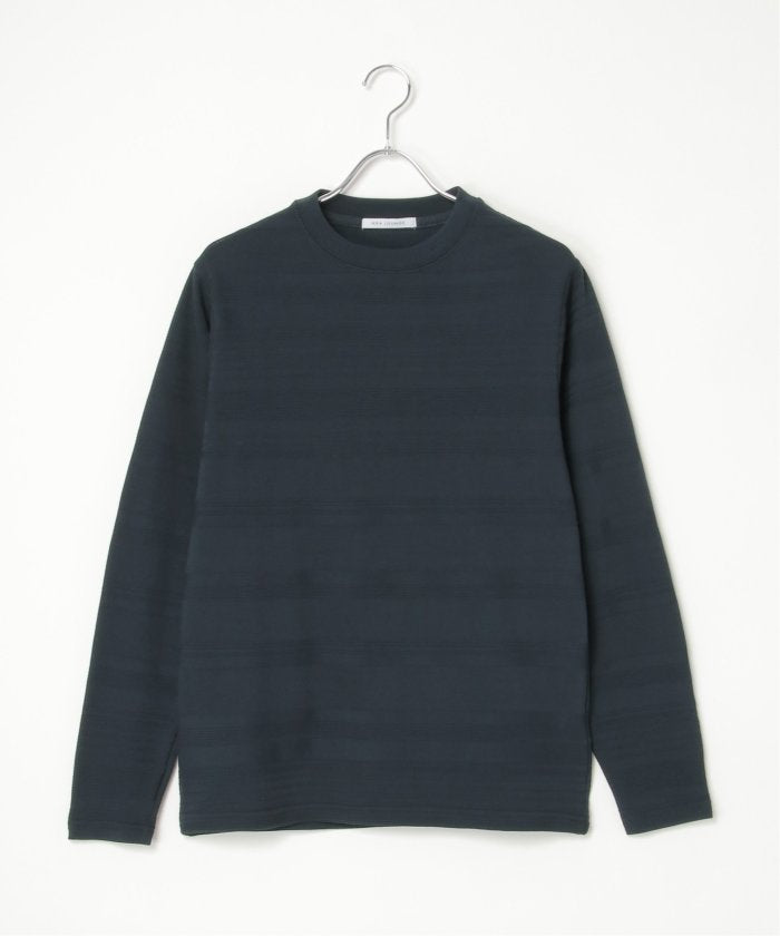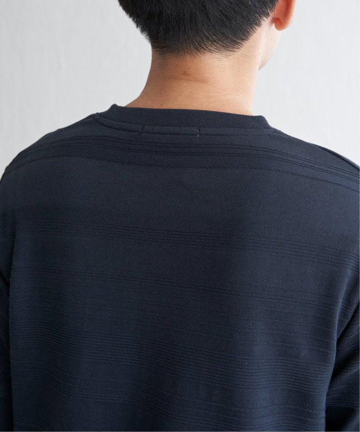 シンプルな長袖のクルーネックTシャツですが、生地の表面に凹凸のある地柄のランダムボーダーが特徴です。