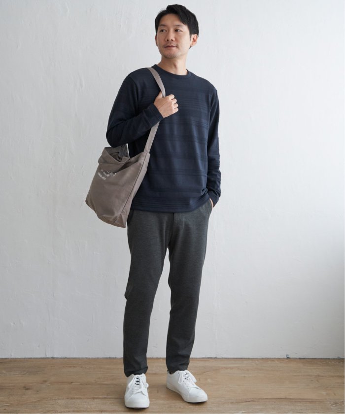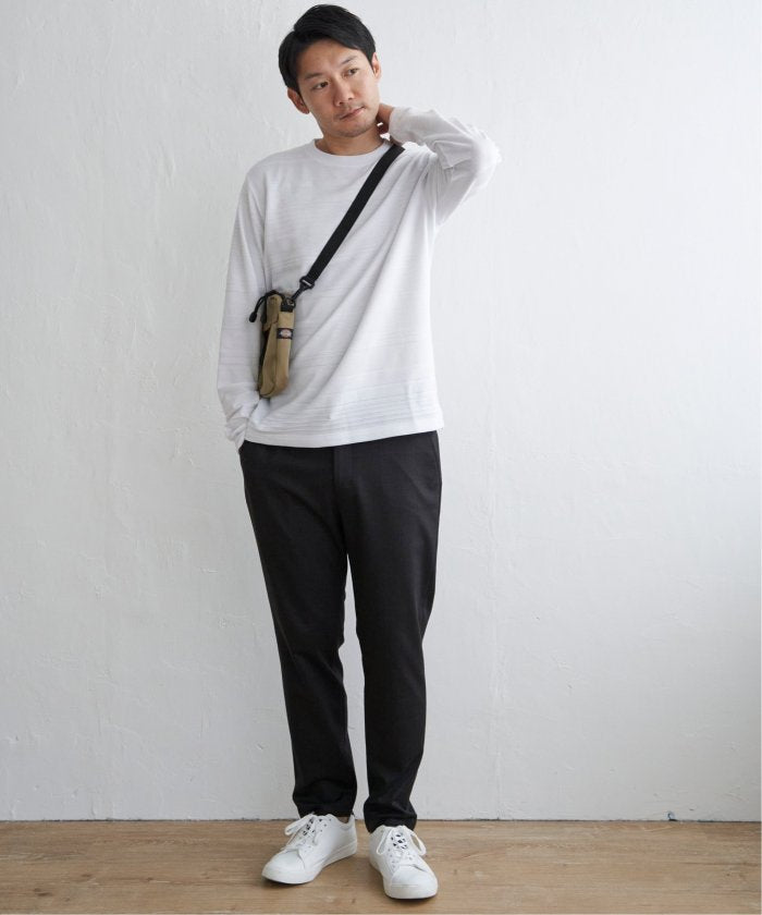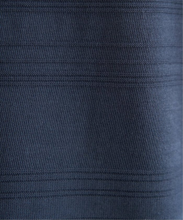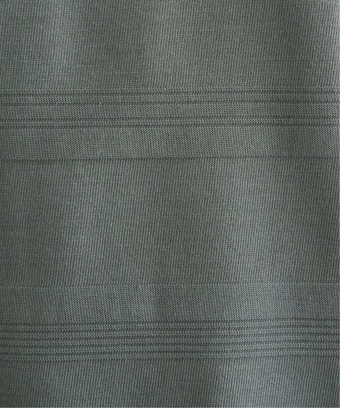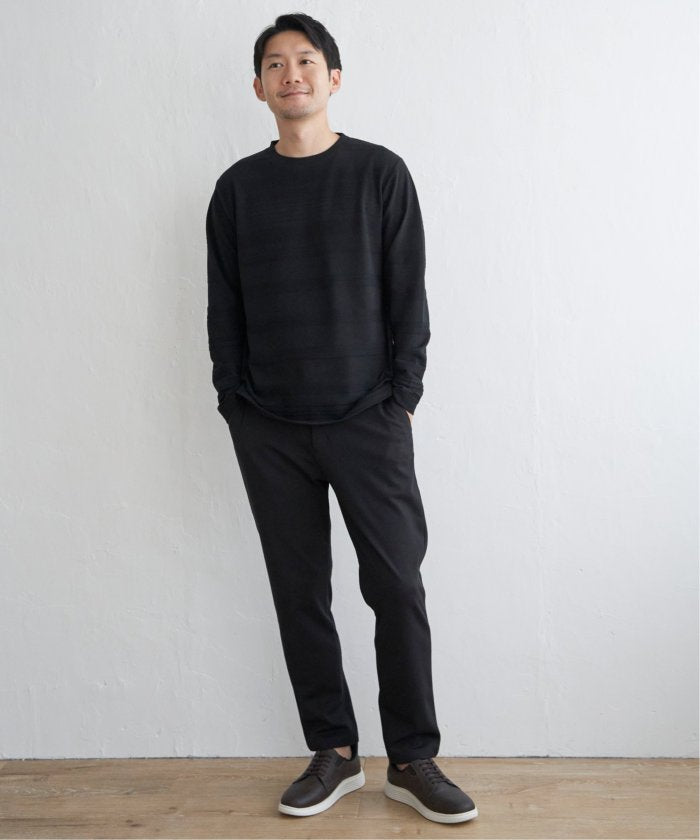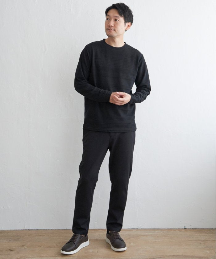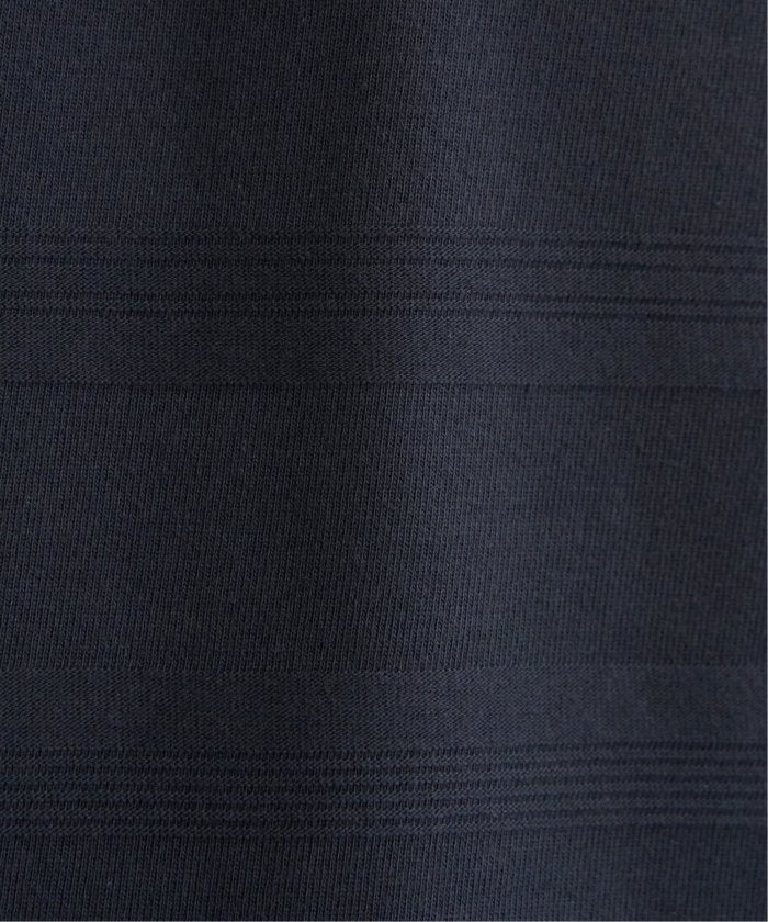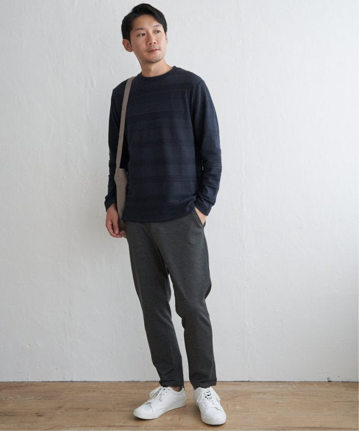 シンプルな長袖のクルーネックTシャツですが、生地の表面に凹凸のある地柄のランダムボーダーが特徴です。