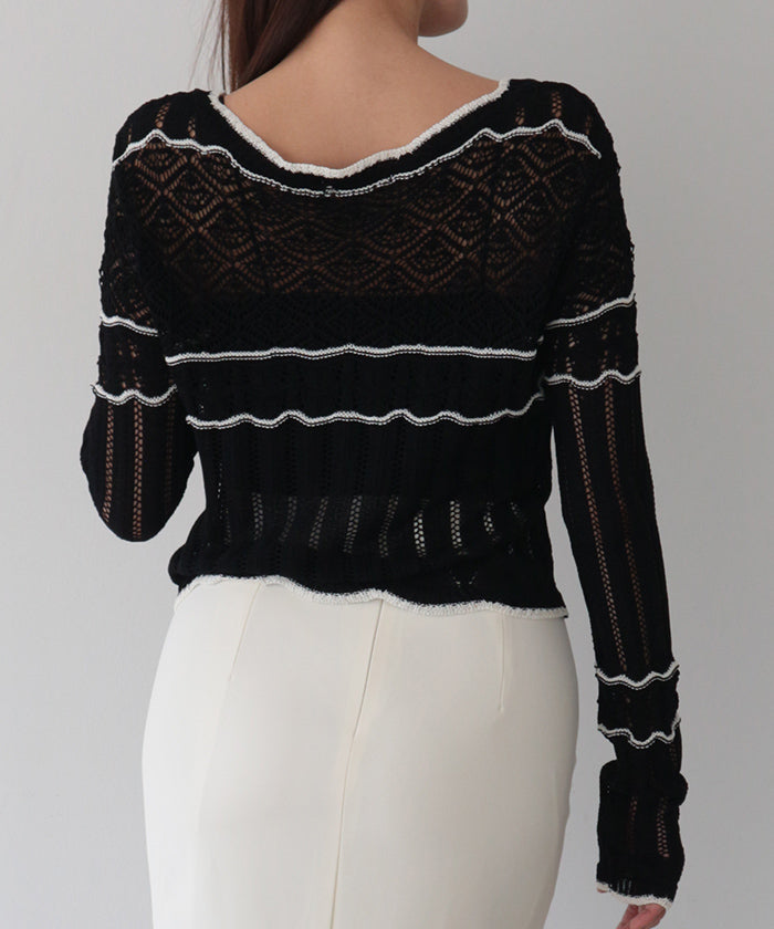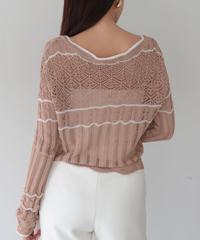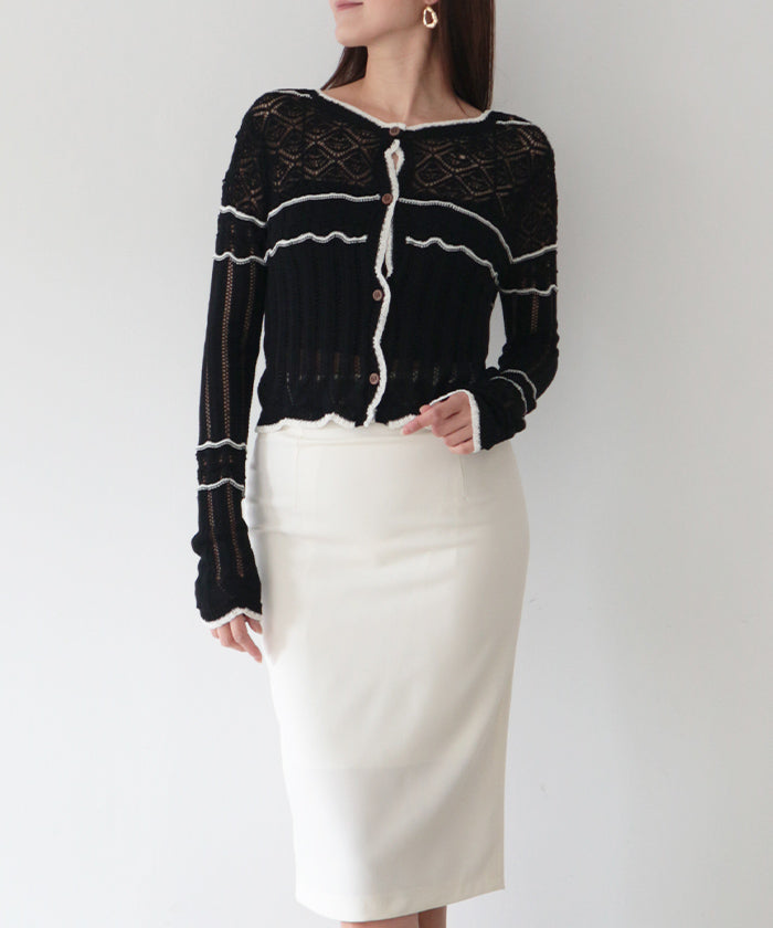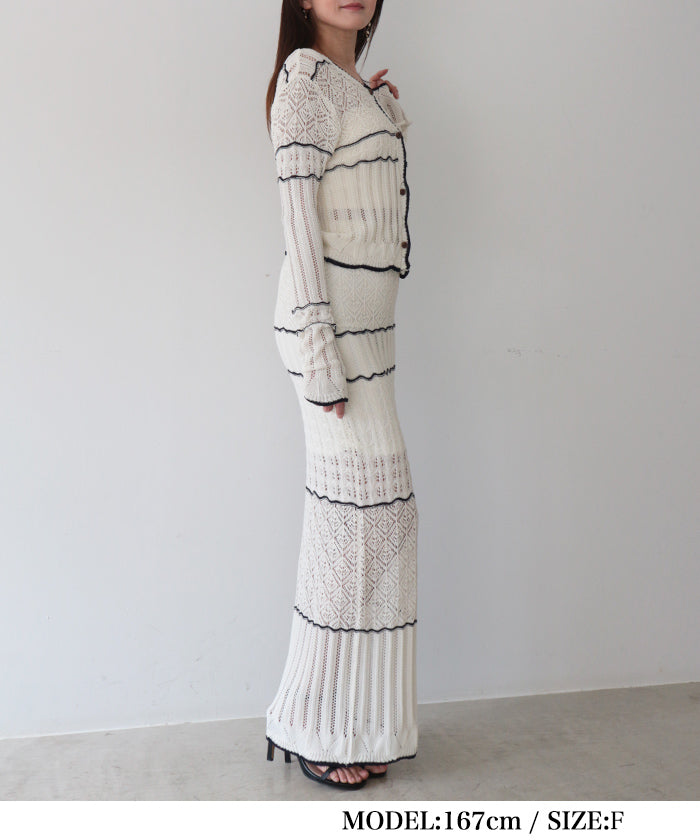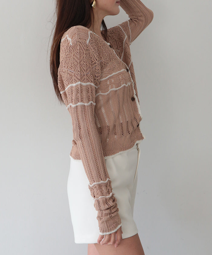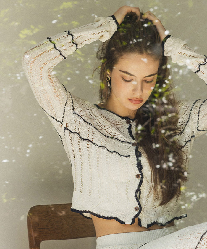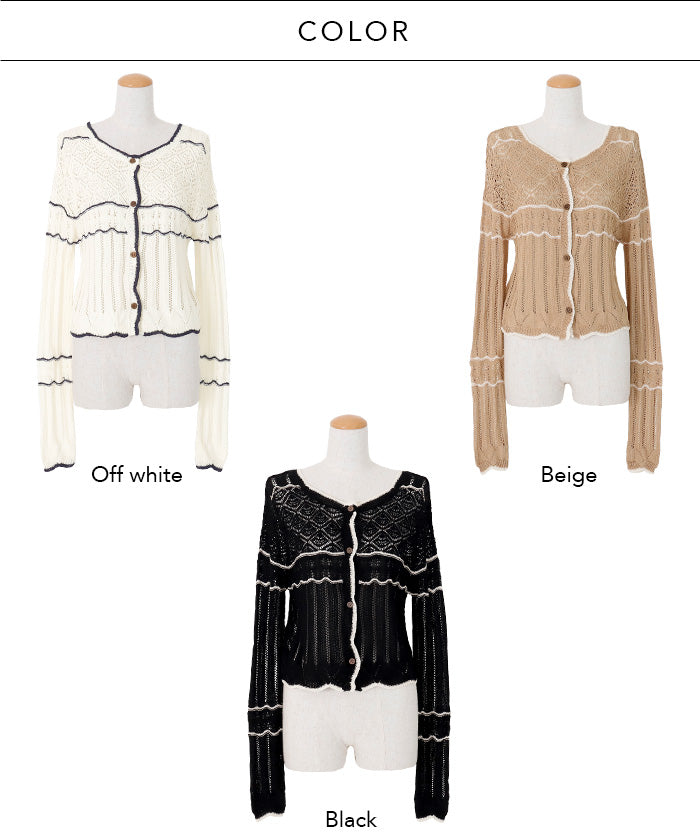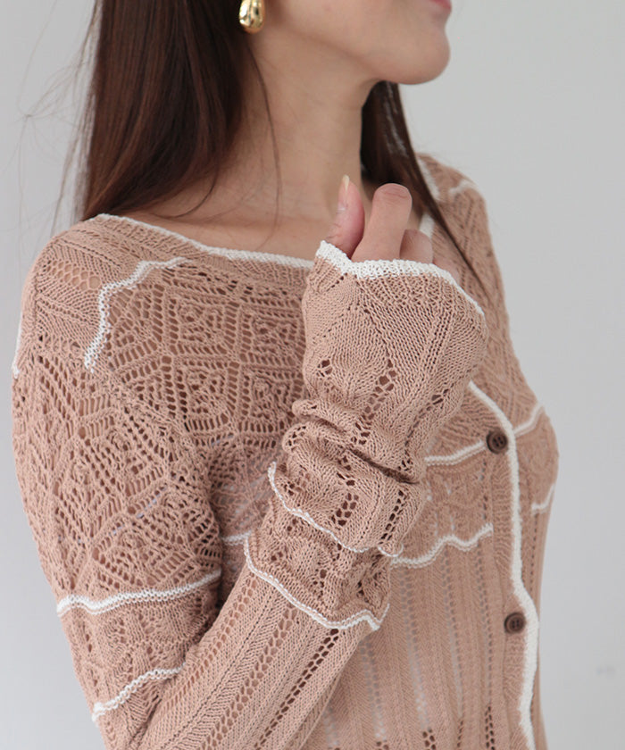 ナチュラルな風合いと細やかな4種の透かし柄がマッチした、優雅で美しいクロシェニットシリーズのロングスリーブカーディガン。