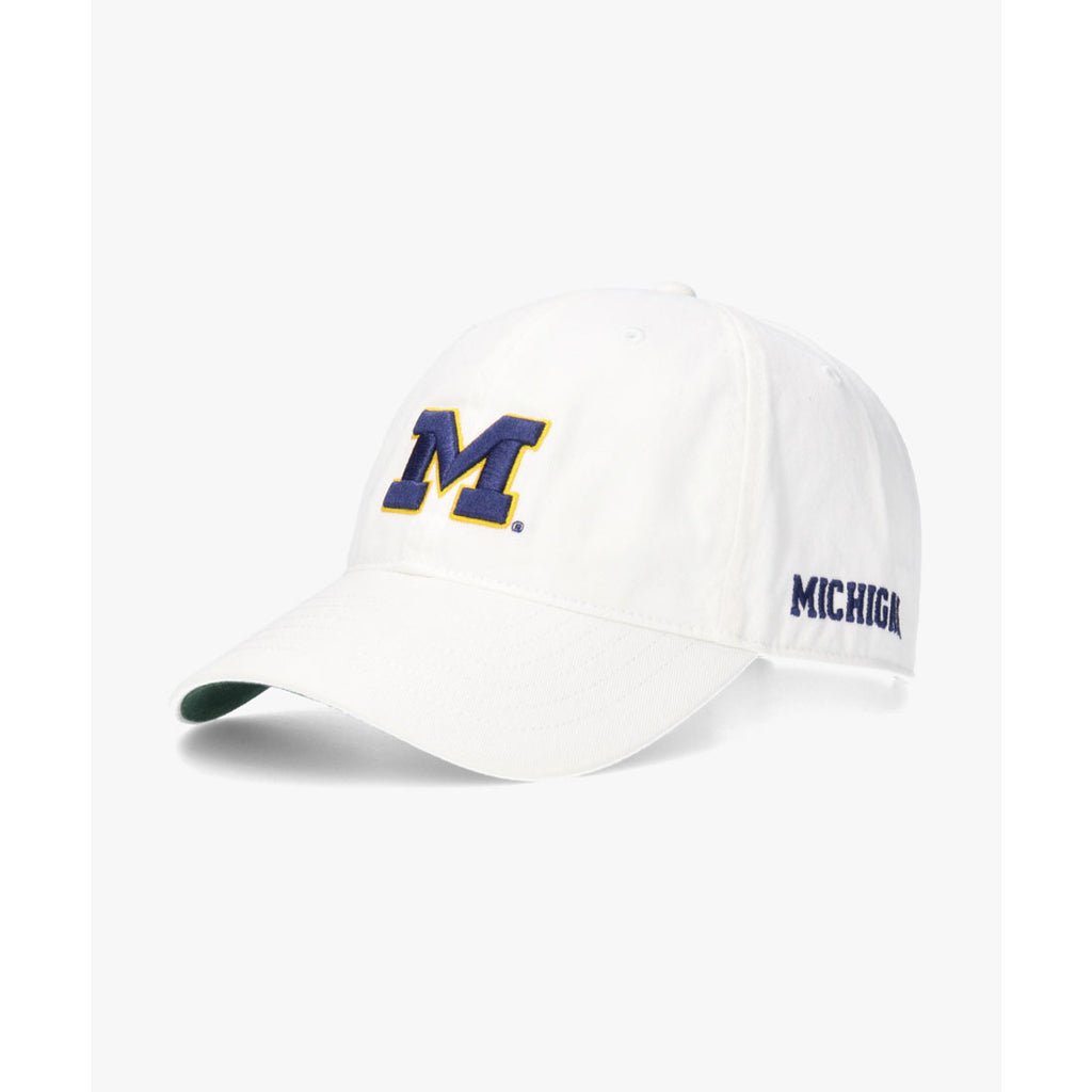 ミシガン大学 / University of Michigan ウォッシュキャップ1817年設立(1821年現名称に)でミシガン州アナーバーにある州立大学でアメリカンフットボールの強豪校である[ミシガン大学/University of Michigan]。綿ツイル地の帽子前面に大学オリジナルロゴを立体刺繍、左横にワードロゴを平面刺繍しています。製品にしてから洗いをかけ、風合い良く仕上げています。カジュアルにかぶれるベーシックアイテムです。サイズ調整 手洗い可