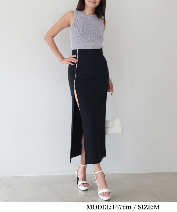 センター脇の金属ジップがキラリと光り、シンプルなトップスと合わせる際にもアクセントになる一着です。
