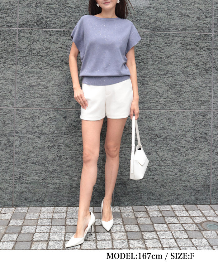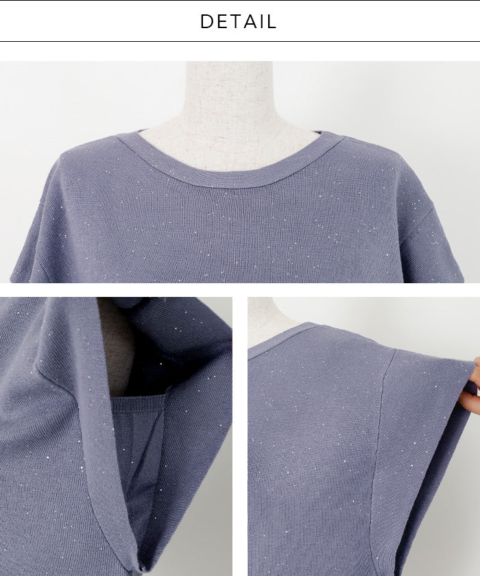 レーヨンナイロンのさらりとした質感のサマーニットに小さなスパンコールが上品に輝き、1枚で華やかに、真夏も涼しげにご着用いただけます。