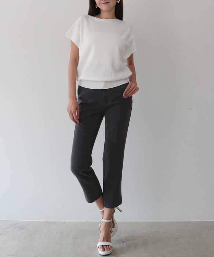 ラインが響かないリラクシーなシルエット、すっきりとしたネックラインで優雅な印象をもたらす大人なニットトップス。