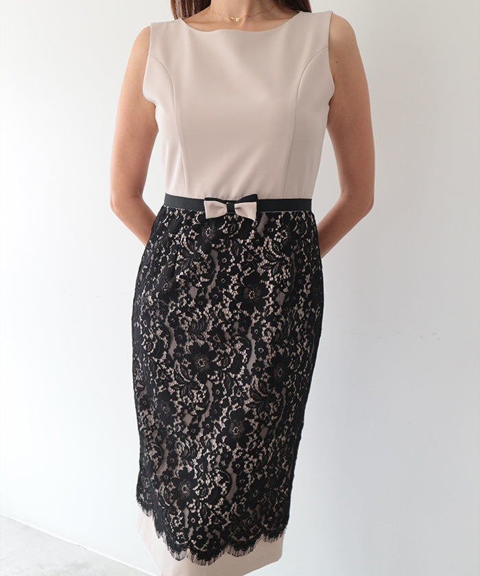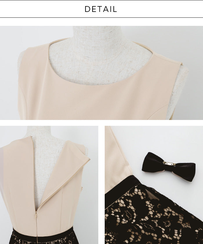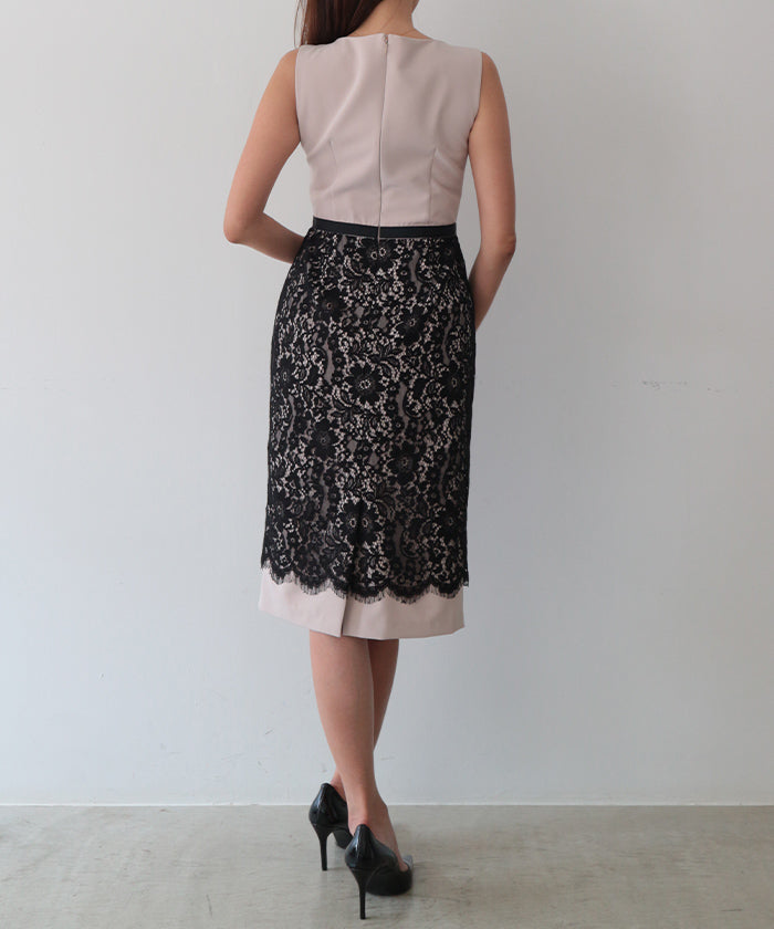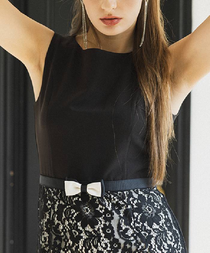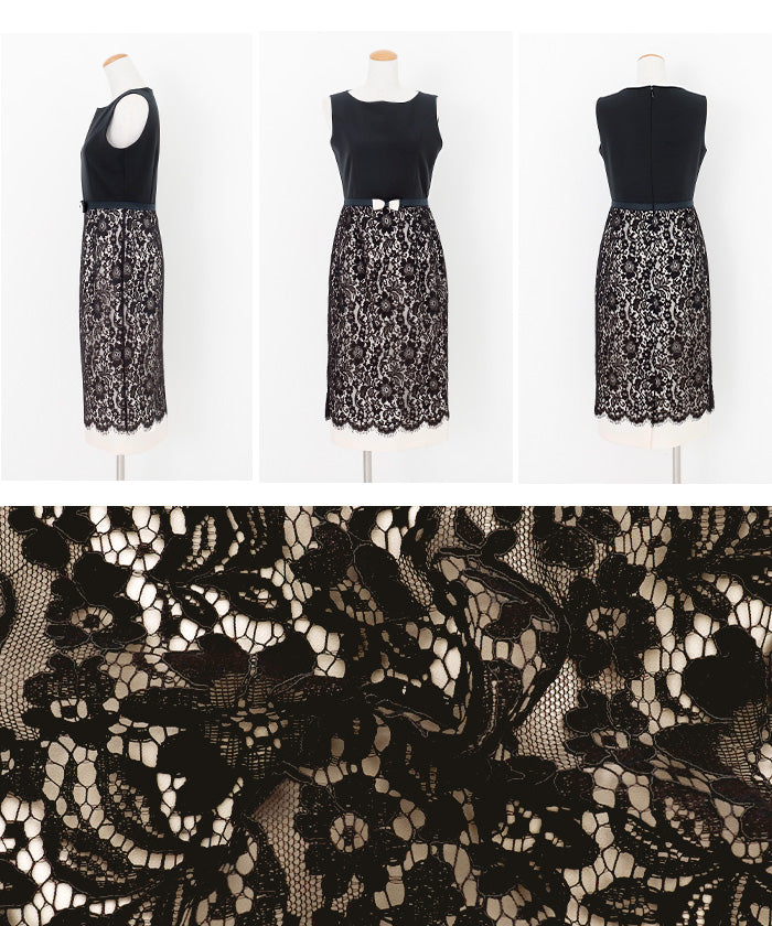 伸縮性に富んだ布帛生地と上品で高貴なコードレースをドッキングさせたノースリーブドレス。