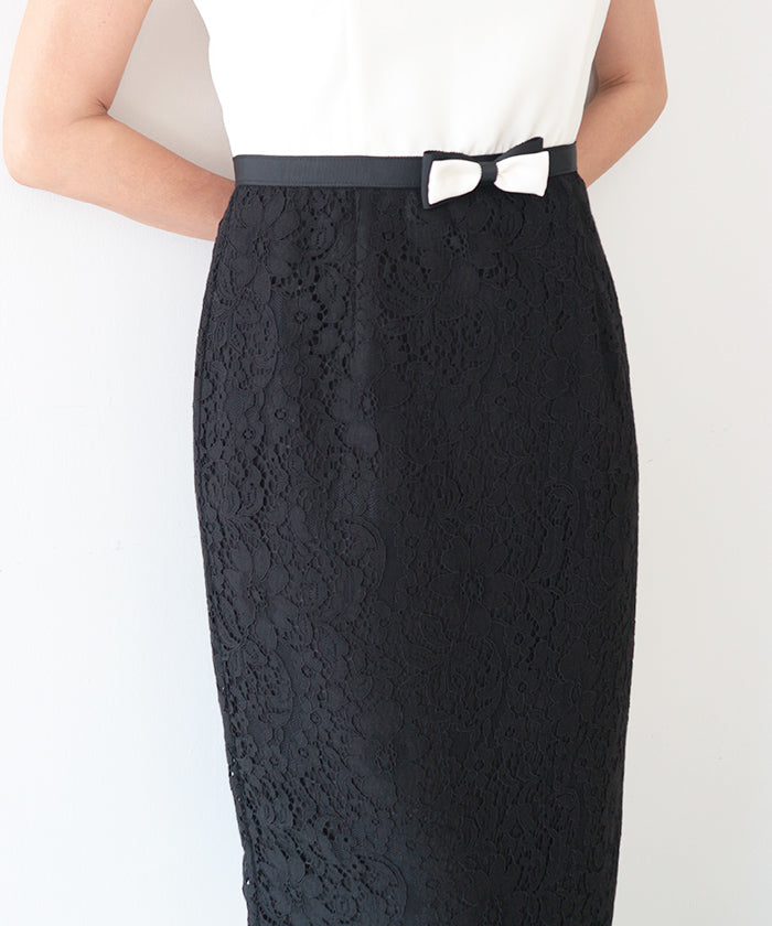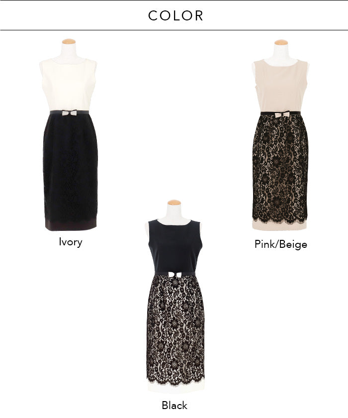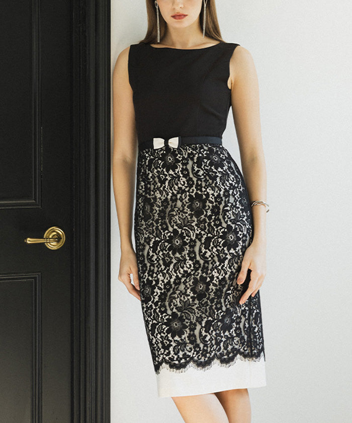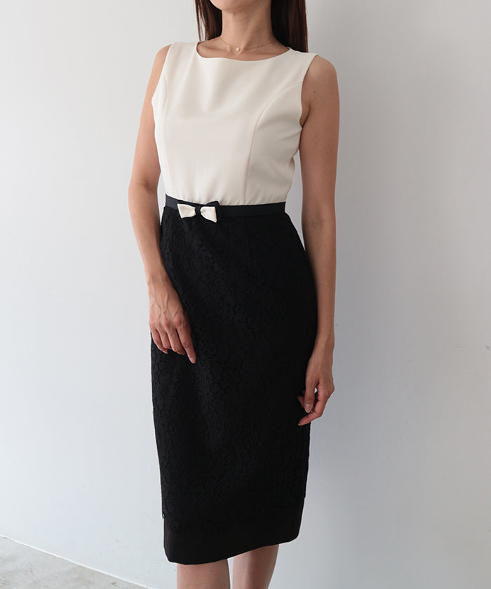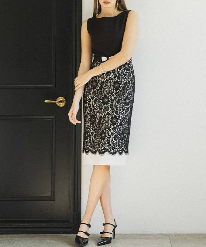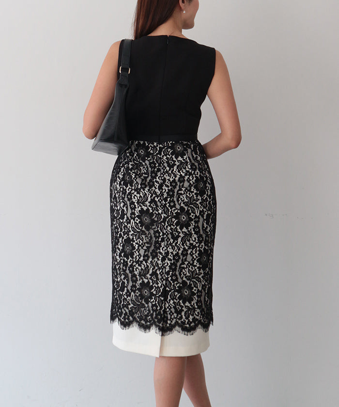 伸縮性に富んだ布帛生地と上品で高貴なコードレースをドッキングさせたノースリーブドレス。