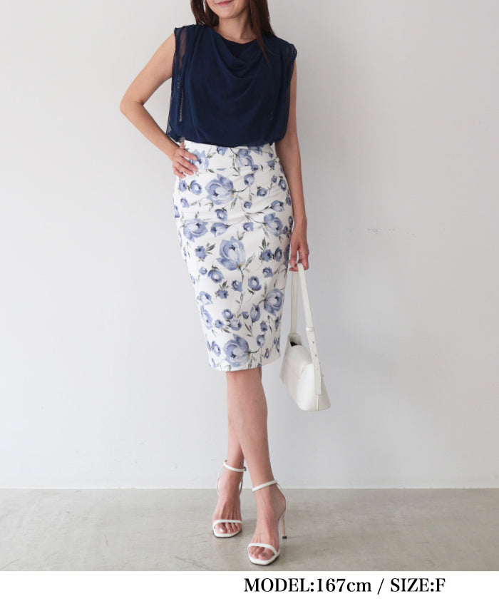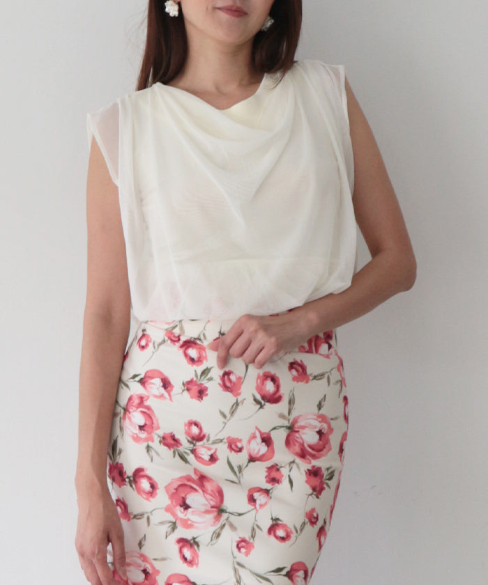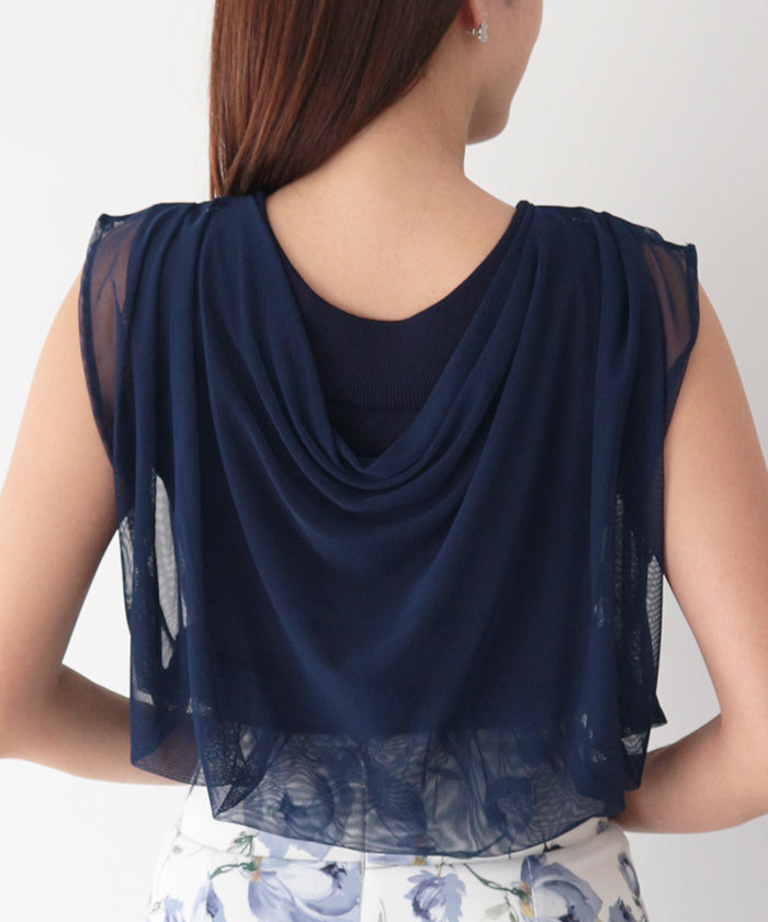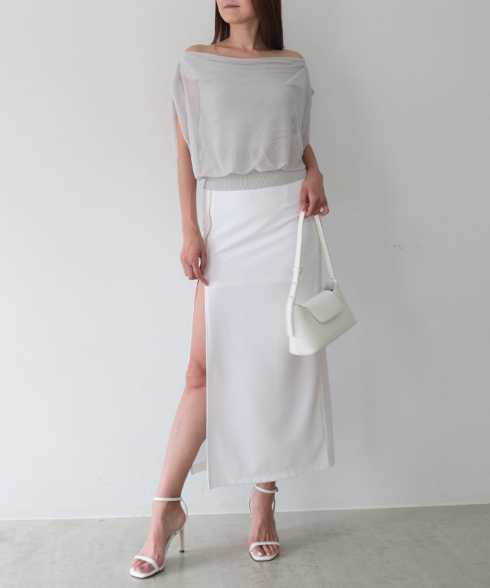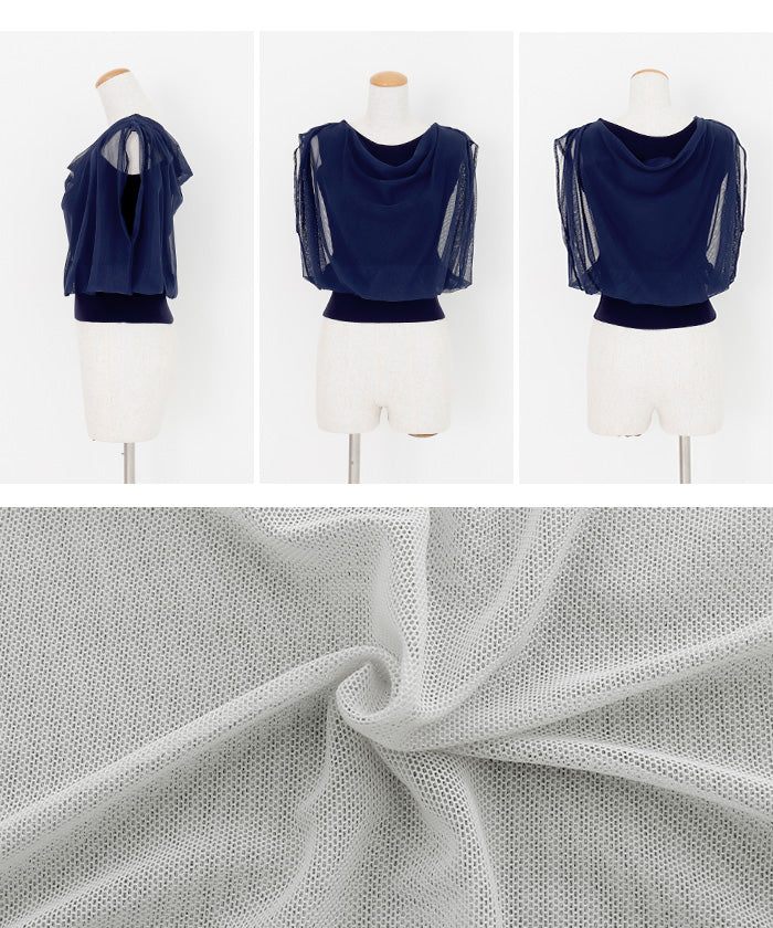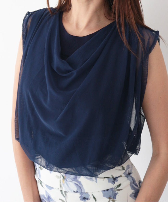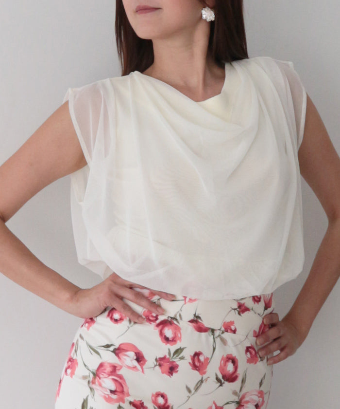 衿はボートネックに仕上げ、重ねたチュールがとろみのあるドレープとなり上品で女性らしく。