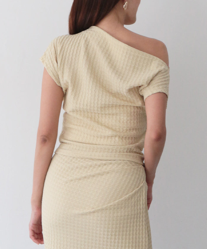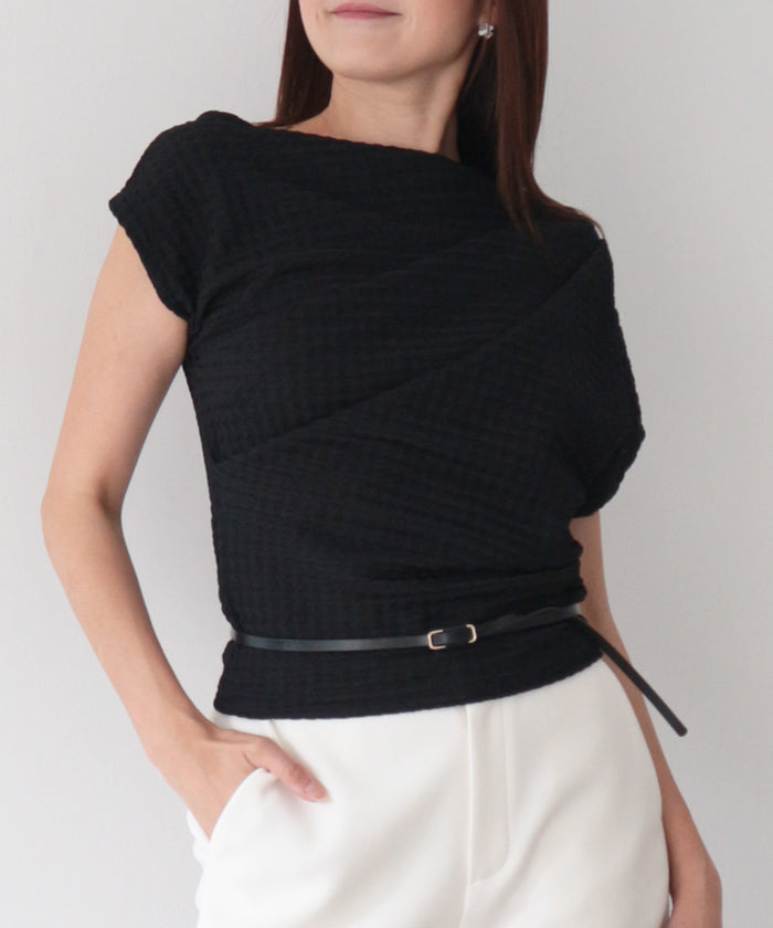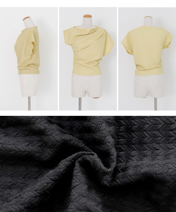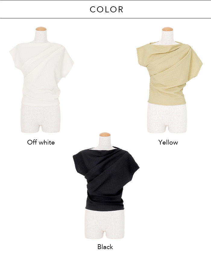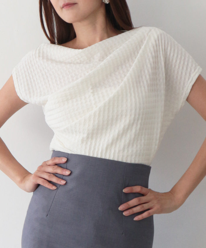 伸縮性のある生地に凹凸ある立体加工を施し、リラクシーに纏えるギャザートップス。