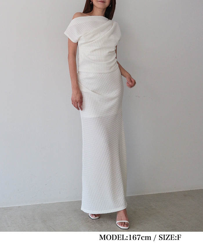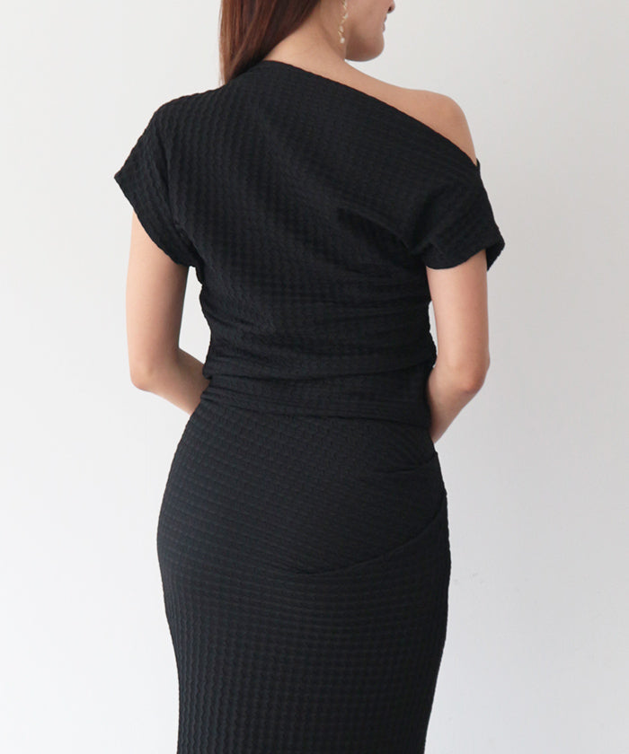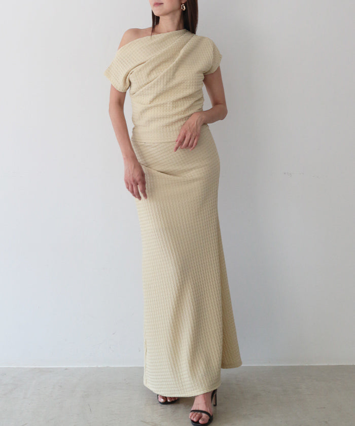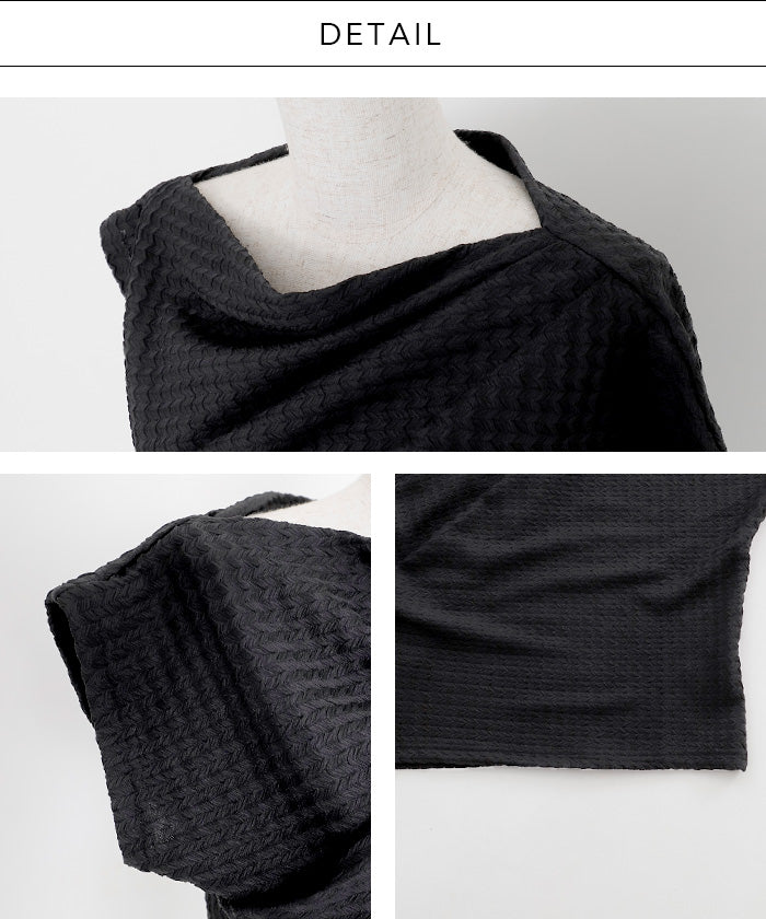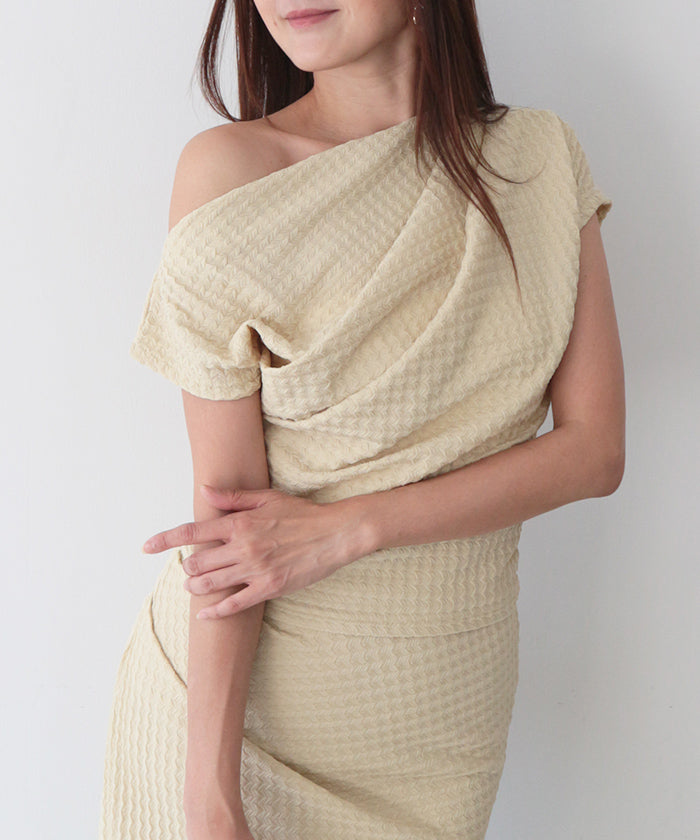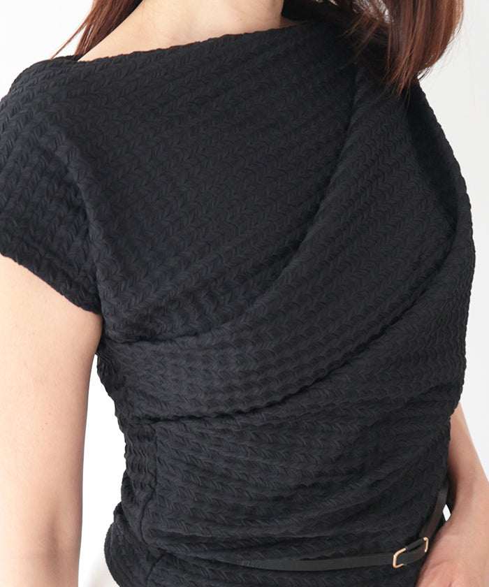 伸縮性のある生地に凹凸ある立体加工を施し、リラクシーに纏えるギャザートップス。