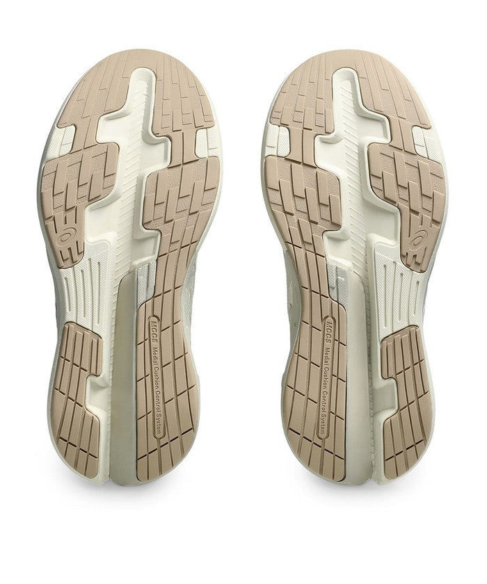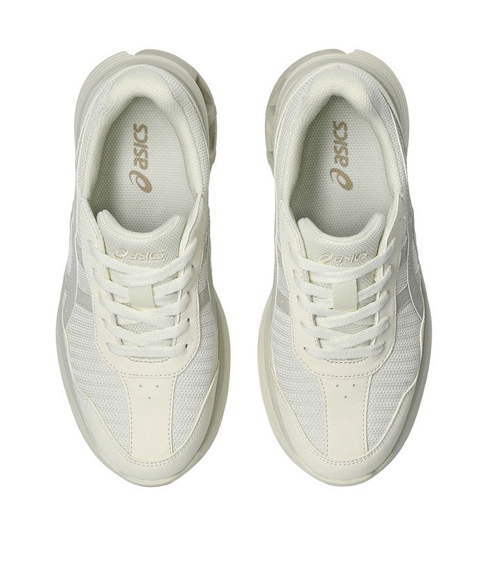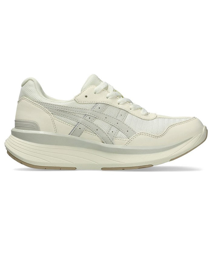 「あなたのひざを快適に」をコンセプトに、O脚などひざ関節の内反に伴う、ひざへの負担を軽減するウォーキングシューズ・KNEESUP(ニーズアップ)。タウンユースやトラベルに活用したい、スポーツカジュアルモデルです。産・学・医で共同開発のクッション機能「MCCS」を搭載。靴底内側に配置したクッションが、かかと荷重時にたわむことで外側から内側に傾斜。ひざ関節を内側へ誘導することで、ひざへの負担を軽減しています。ミッドソールはスムーズな歩行をサポートする舟底設計を採用。かかと部には衝撃緩衝機能GELを搭載しています。足なじみのよいポリウレタン素材を採用したインナーソールは、立体形状で高いフィット感を追求。かかと部のカウンター(かかと芯)は、外側着地によるかかとの内倒れを抑えるため、内側を長く設計。アッパーにはニット調メッシュを採用。レイヤー感のあるパーツ構成により、カジュアルな印象に仕上げています。アシックスストライプの一部に反射材を採用し、夜間の視認性に配慮。アシックスストライプがアクセントになったスポーティなデザインで、デイリーユースからウォーキングまで汎用性の高いアイテムです。ゆったりした履き心地の3Eウィズ相当です。